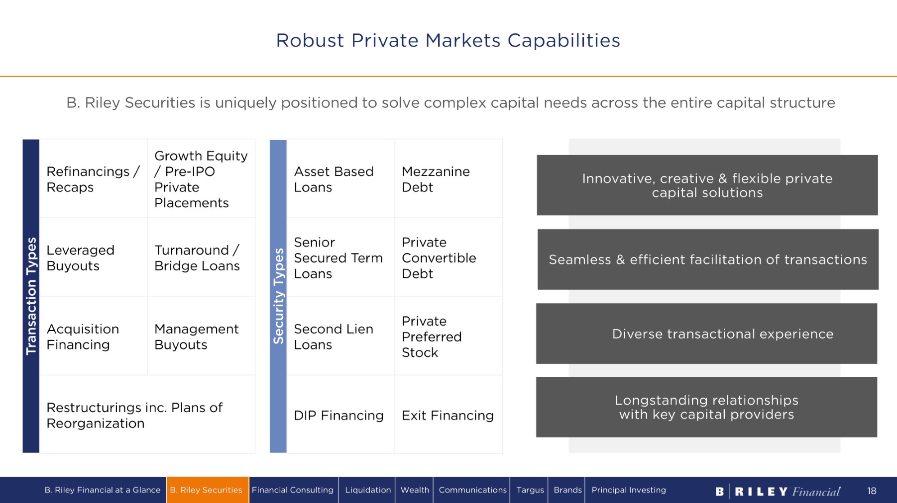 B. Riley Securities is a trusted advisor in M&A banking, creating value for our clients across industry verticals Private Equity Exits Sell - Side Advisory Public Corp. Sales / Mergers Corporate D i v e s t i tu r es F a m il y - O w n e d Businesses 363 Asset Sales Distressed M&A Platform Acquisitions for Sponsors Buy - Side Advisory UCC Article 9 Sales Add - On Acquisitions for Sponsors Loan Sales Public. Corp. Add - Ons / Bolt - On Acquisitions Divestiture of Non - Core Assets M a n ag emen t Buyouts & ESOPs Hands - on boutique service model Strategic & longstanding industry relationships Senior leadership & deep sector expertise Sophisticated bulge bracket capabilities Complementary M&A Advisory Practice B. Riley Financial at a Glance B. Riley Securities Financial Consulting Liquidation Wealth Communications Targus Brands Principal Investing 17