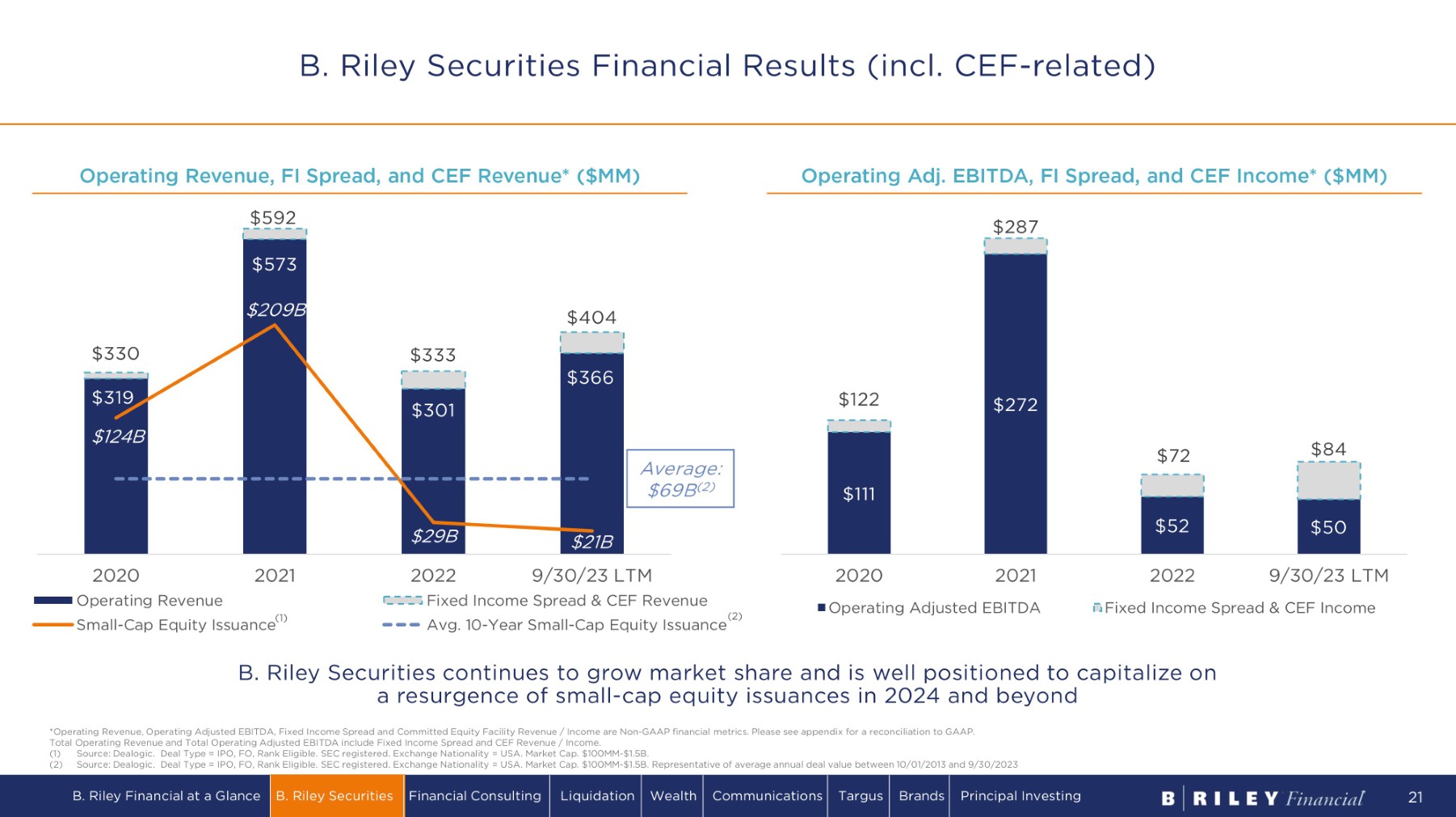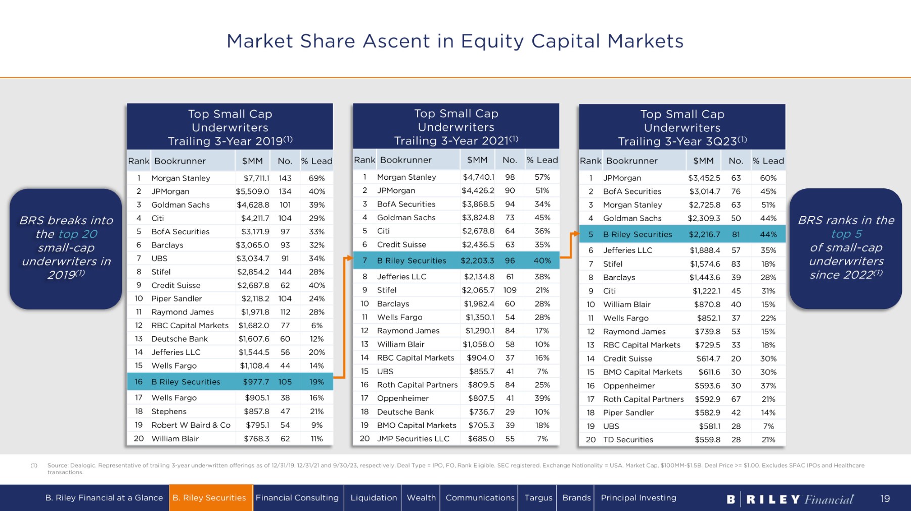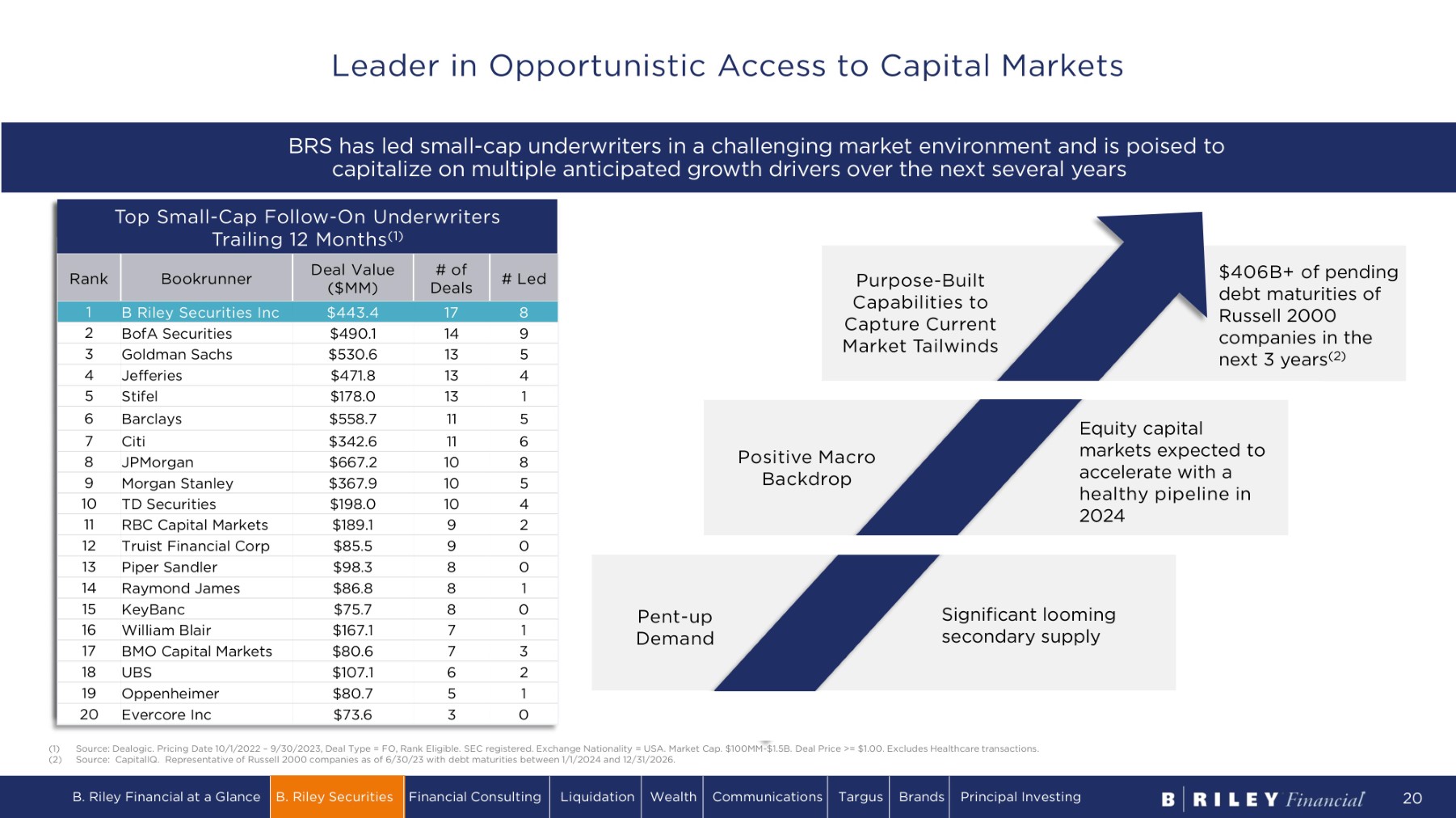 Top Small Cap Underwriters Trailing 3 - Year 2019 (1) % Lead No. $MM Bookrunner Rank 69% 143 $7 , 711 . 1 Morgan Stanley 1 40% 134 $5,509.0 JPMorgan 2 39% 101 $4,628.8 Goldman Sachs 3 29% 104 $4 ,2 11 . 7 Citi 4 33% 97 $3,171.9 BofA Securities 5 32% 93 $3,065.0 Barclays 6 34% 91 $ 3, 0 3 4 . 7 UBS 7 28% 144 $2,854.2 Stifel 8 40% 62 $2,687.8 Credit Suisse 9 24% 104 $2,118.2 Piper Sandler 10 28% 112 $1 ,9 71 . 8 R aym on d J ames 11 6% 77 $1,682.0 RBC Capital Markets 12 12% 60 $1,607.6 Deutsche Bank 13 20% 56 $1 , 544 . 5 J e f fe r i es LL C 14 14% 44 $1 , 10 8.4 Wells Fargo 15 19% 105 $977.7 B Riley Securities 16 16% 38 $ 9 05 . 1 Wells Fargo 17 21% 47 $857.8 Stephens 18 9% 54 $7 9 5 . 1 Robert W Baird & Co 19 11% 62 $7 68.3 William Blair 20 Top Small Cap Underwriters Trailing 3 - Year 2021 (1) % Lead No. $MM Bookrunner Rank 57% 98 $4 , 740 . 1 Morgan Stanley 1 51% 90 $4 , 4 26.2 JPMorgan 2 34% 94 $3,868.5 BofA Securities 3 45% 73 $3,824.8 Goldman Sachs 4 36% 64 $2,678.8 Citi 5 35% 63 $ 2, 4 36.5 Credit Suisse 6 40% 96 $ 2 , 2 03 . 3 B Riley Securities 7 38% 61 $2,134.8 J e f fe r i es LL C 8 21% 109 $2,065.7 Stifel 9 28% 60 $1,982.4 Barclays 10 28% 54 $1,350.1 Wells Fargo 11 17% 84 $1,290.1 R aym on d J ames 12 10% 58 $1 , 0 58.0 William Blair 13 16% 37 $ 9 04 . 0 RBC Capital Markets 14 7% 41 $ 8 55 . 7 UBS 15 25% 84 $ 8 0 9.5 Roth Capital Partners 16 39% 41 $ 8 07 . 5 Oppenheimer 17 10% 29 $7 36. 7 Deutsche Bank 18 18% 39 $705.3 BMO Capital Markets 19 7% 55 $ 68 5 .0 JMP Securities LLC 20 Top Small Cap Underwriters Trailing 3 - Year 3Q23 (1) % Lead No. $MM Bookrunner Rank 60% 63 $3,452.5 JPMorgan 1 45% 76 $3,014.7 BofA Securities 2 51% 63 $2,725.8 Morgan Stanley 3 44% 50 $2,309.3 Goldman Sachs 4 44% 81 $2,216.7 B Riley Securities 5 35% 57 $1,888.4 J e f fe r i es LL C 6 18% 83 $1,574.6 Stifel 7 28% 39 $1,443.6 Barclays 8 31% 45 $1,222.1 Citi 9 15% 40 $870.8 William Blair 10 22% 37 $852.1 Wells Fargo 11 15% 53 $739.8 R aym on d J ames 12 18% 33 $729.5 RBC Capital Markets 13 30% 20 $614.7 Credit Suisse 14 30% 30 $611.6 BMO Capital Markets 15 37% 30 $593.6 Oppenheimer 16 21% 67 $592.9 Roth Capital Partners 17 14% 42 $582.9 Piper Sandler 18 7% 28 $581.1 UBS 19 21% 28 $559.8 TD Securities 20 BRS ranks in the top 5 of small - cap un d e r w r i t e r s since 2022 ( 1 ) (1) Source: Dealogic. Representative of trailing 3 - year underwritten offerings as of 12/31/19, 12/31/21 and 9/30/23, respectively. Deal Type = IPO, FO, Rank Eligible. SEC registered. Exchange Nationality = USA. Market Cap. $100MM - $1.5B. Deal Price >= $1.00. Excludes SPAC IPOs and Healthcare transactions. BRS breaks into the top 20 small - cap underwriters in 2019 (1) Market Share Ascent in Equity Capital Markets B. Riley Financial at a Glance B. Riley Securities Financial Consulting Liquidation Wealth Communications Targus Brands Principal Investing 19