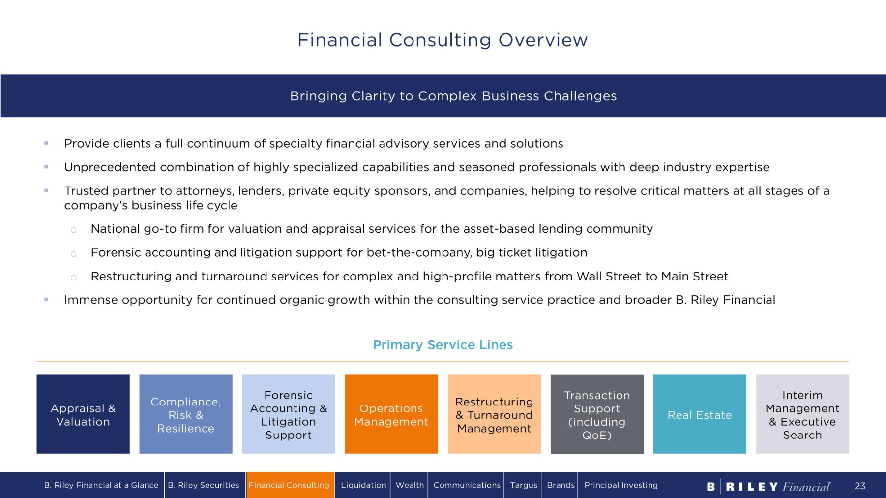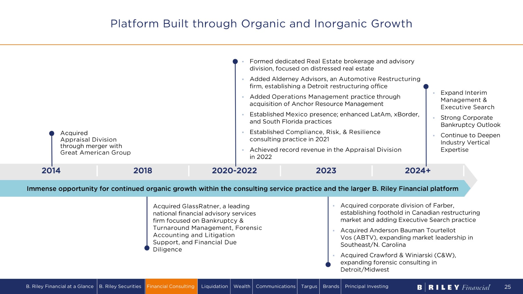 Financial Consulting Services Continuum • Business & Securities • Fixed Asset Advisory Services • Intangible Assets • Inventory • Machinery & Equipment • Tax • Real Estate Appraisal & Valuation • C h ap t e r 11 & 7 T r u s t e e • Chief Restructuring Officer • Fiduciary Services / Receiverships • Financial Advisor to Creditors Committees • Financial Advisor to Debtors • Financial & Operational Restructuring • Lender Advisory Services • Liquidating Agent/Plan Administrator • Out - of - Court Debt Restructurings • Turnaround & Interim Management Restructuring & Turnaround Management • Cybersecurity Compliance and Risk Management • Enterprise Risk Management • Operational Continuity & Resilience • IT Disaster Recovery • Enterprise Crisis Management Compliance, Risk & Resilience • Operational Diligence for Acquisition • Organization Development • Operational Turnaround & Interim Management • Supply Chain Development & Consolidation • Manufacturing Efficiency, Improvement, & Cost Reduction Implementation • Product Launches Operations Management • Bankruptcy Litigation & Avoidance Actions • Complex Commercial Litigation • Contract Disputes • Data Analytics • Expert Witness Testimony • Franchise Disputes • Fraud & Forensic Investigations • IP Litigation • Lost Profits & Commercial Damages • Post M&A Disputes • Valuation Disputes Forensic Accounting & Litigation Support • Due Diligence • Quality of Earnings and Cash Flow • Fairness Opinions • Solvency Opinions • Purchase Price Allocation Transaction Support • Executive & Leadership Search • Interim Management • Fractional Executives • Executive Coaching Executive Search • Traditional Property Sales Brokerage • Sale - Leaseback Transaction Services • Bankruptcy & Out - of - Court Lease Restructuring, Renewals, & Extensions • Lease Terminations & Subleasing • Strategic Portfolio Planning & Optimization • Debt, Equity, Structured Finance Solutions • DIP Financing • Property Acquisition & Redevelopment Real Estate B. Riley Financial at a Glance B. Riley Securities Financial Consulting Liquidation Wealth Communications Targus Brands Principal Investing 24