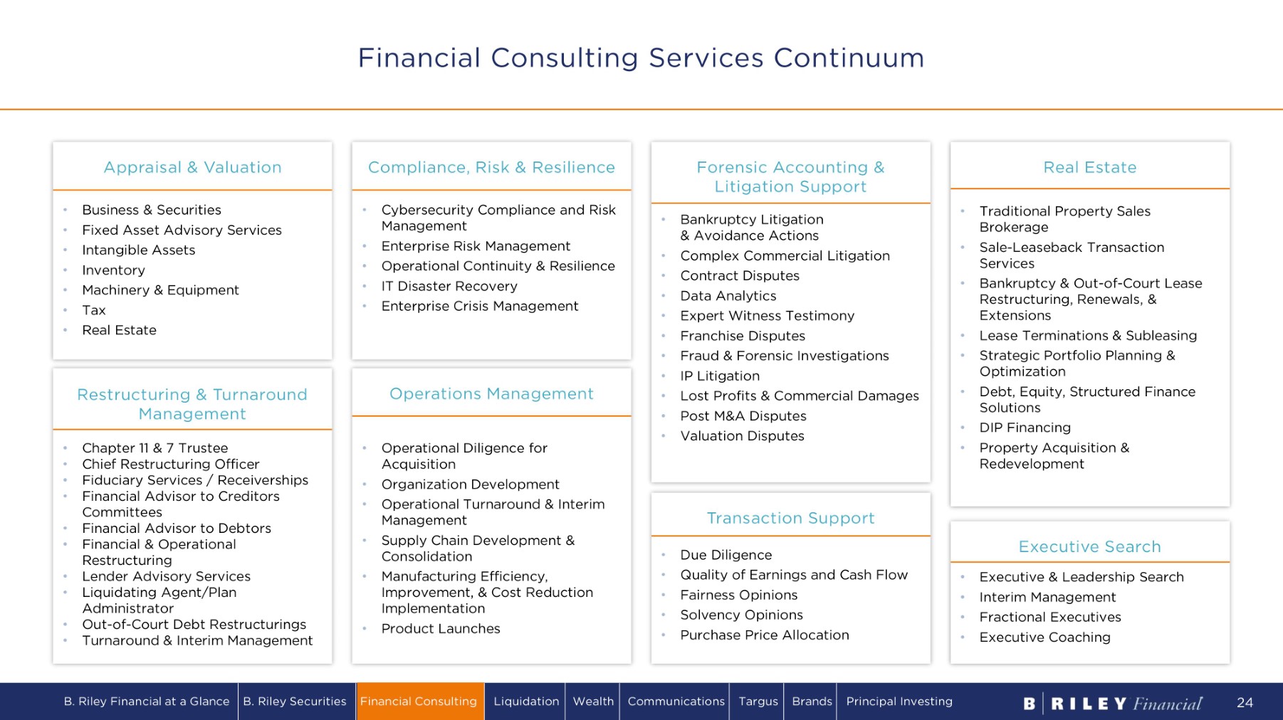 Appraisal & Valuation C o m p li a n c e , Risk & Resilience Forensic Accounting & Litigation Support R e s t r u c t u r i ng & Turnaround Management Operations M a n a g e m e nt T r an s a c t i on Support (including QoE) Interim M a n a g e m e nt & Executive Search Real Estate ▪ Provide clients a full continuum of specialty financial advisory services and solutions ▪ Unprecedented combination of highly specialized capabilities and seasoned professionals with deep industry expertise ▪ Trusted partner to attorneys, lenders, private equity sponsors, and companies, helping to resolve critical matters at all stages of a company's business life cycle o National go - to firm for valuation and appraisal services for the asset - based lending community o Forensic accounting and litigation support for bet - the - company, big ticket litigation o Restructuring and turnaround services for complex and high - profile matters from Wall Street to Main Street ▪ Immense opportunity for continued organic growth within the consulting service practice and broader B. Riley Financial Primary Service Lines Bringing Clarity to Complex Business Challenges Financial Consulting Overview B. Riley Financial at a Glance B. Riley Securities Financial Consulting Liquidation Wealth Communications Targus Brands Principal Investing 23