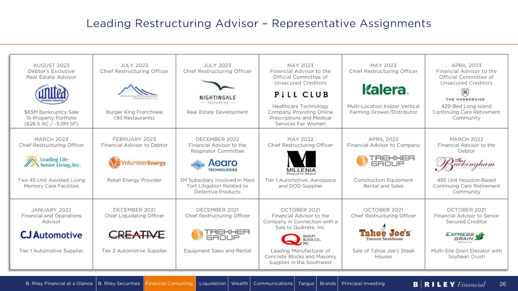 Platform Built through Organic and Inorganic Growth Acquired GlassRatner, a leading national financial advisory services firm focused on Bankruptcy & Turnaround Management, Forensic Accounting and Litigation Support, and Financial Due Diligence ▪ Acquired corporate division of Farber, establishing foothold in Canadian restructuring market and adding Executive Search practice ▪ Acquired Anderson Bauman Tourtellot Vos (ABTV), expanding market leadership in Southeast/N. Carolina ▪ Acquired Crawford & Winiarski (C&W), expanding forensic consulting in Detroit/Midwest Acquired Appraisal Division through merger with Great American Group ▪ Formed dedicated Real Estate brokerage and advisory division, focused on distressed real estate ▪ Added Alderney Advisors, an Automotive Restructuring firm, establishing a Detroit restructuring office ▪ Added Operations Management practice through acquisition of Anchor Resource Management ▪ Established Mexico presence; enhanced LatAm, xBorder, and South Florida practices ▪ Established Compliance, Risk, & Resilience consulting practice in 2021 ▪ Achieved record revenue in the Appraisal Division in 2022 2024+ 2023 2020 - 2022 2018 2014 Immense opportunity for continued organic growth within the consulting service practice and the larger B. Riley Financial platform B. Riley Financial at a Glance B. Riley Securities Financial Consulting Liquidation Wealth Communications Targus Brands Principal Investing 25 ▪ Expand Interim Management & Executive Search ▪ Strong Corporate Bankruptcy Outlook ▪ Continue to Deepen Industry Vertical Expertise