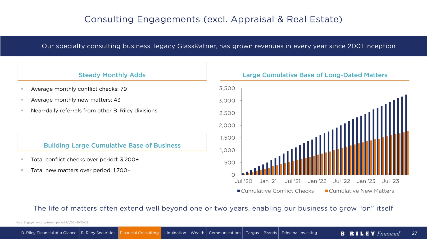 Steady Monthly Adds Large Cumulative Base of Long - Dated Matters Note: Engagements represent period 7/1/20 - 11/30/23 0 Jul '20 Jan '21 Jul '21 5 00 1 ,000 2 ,000 1 ,5 00 2 ,5 00 3 ,0 0 0 3 ,5 00 Jan '22 Jul '22 Jan '23 Jul '23 Cumulative Conflict Checks Cumulative New Matters The life of matters often extend well beyond one or two years, enabling our business to grow “on” itself ▪ Average monthly conflict checks: 79 ▪ Average monthly new matters: 43 ▪ Near - daily referrals from other B. Riley divisions ▪ Total conflict checks over period: 3,200+ ▪ Total new matters over period: 1,700+ Building Large Cumulative Base of Business Our specialty consulting business, legacy GlassRatner, has grown revenues in every year since 2001 inception B. Riley Financial at a Glance B. Riley Securities Financial Consulting Liquidation Wealth Communications Targus Brands Principal Investing 27 Consulting Engagements (excl. Appraisal & Real Estate)