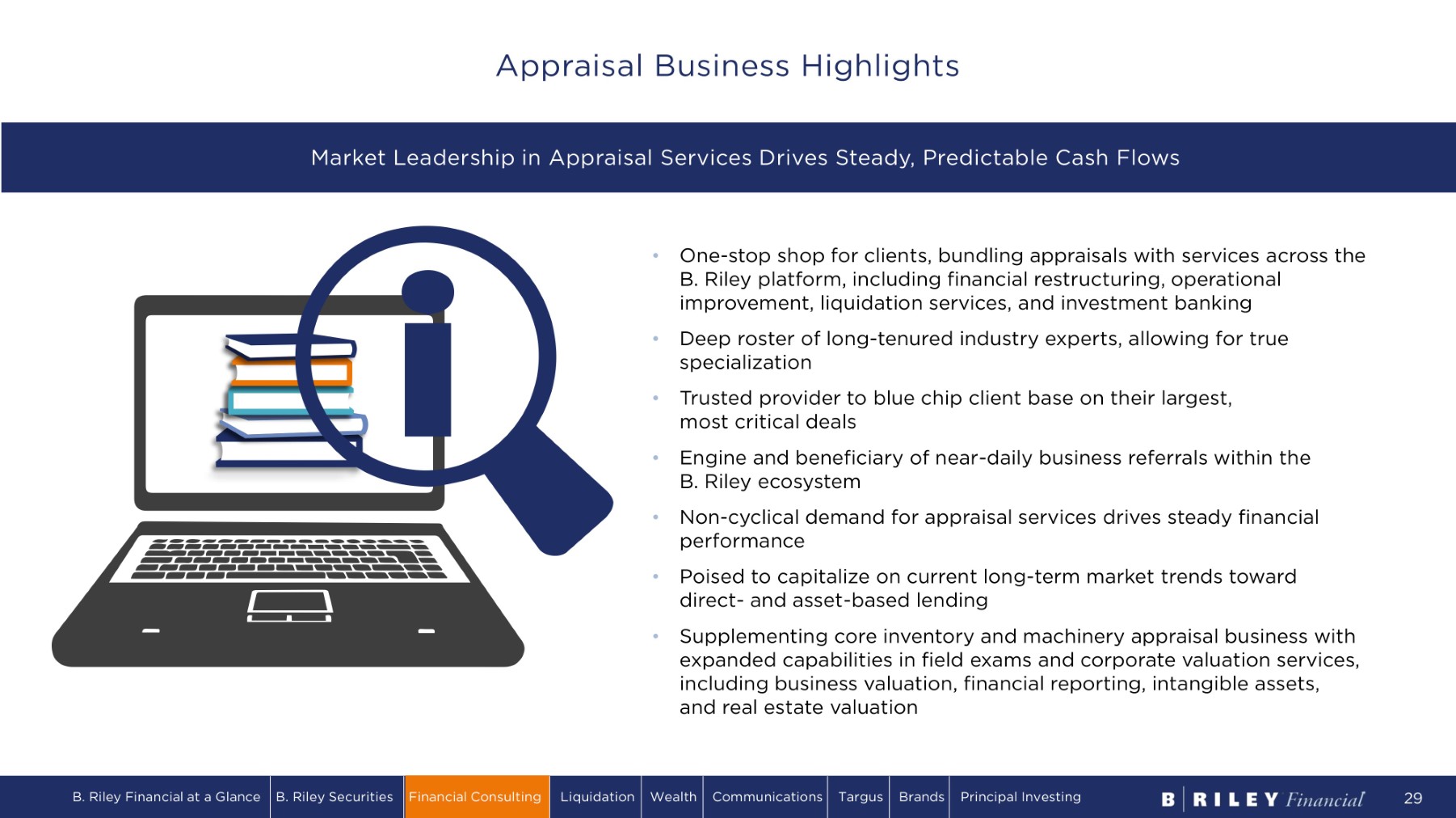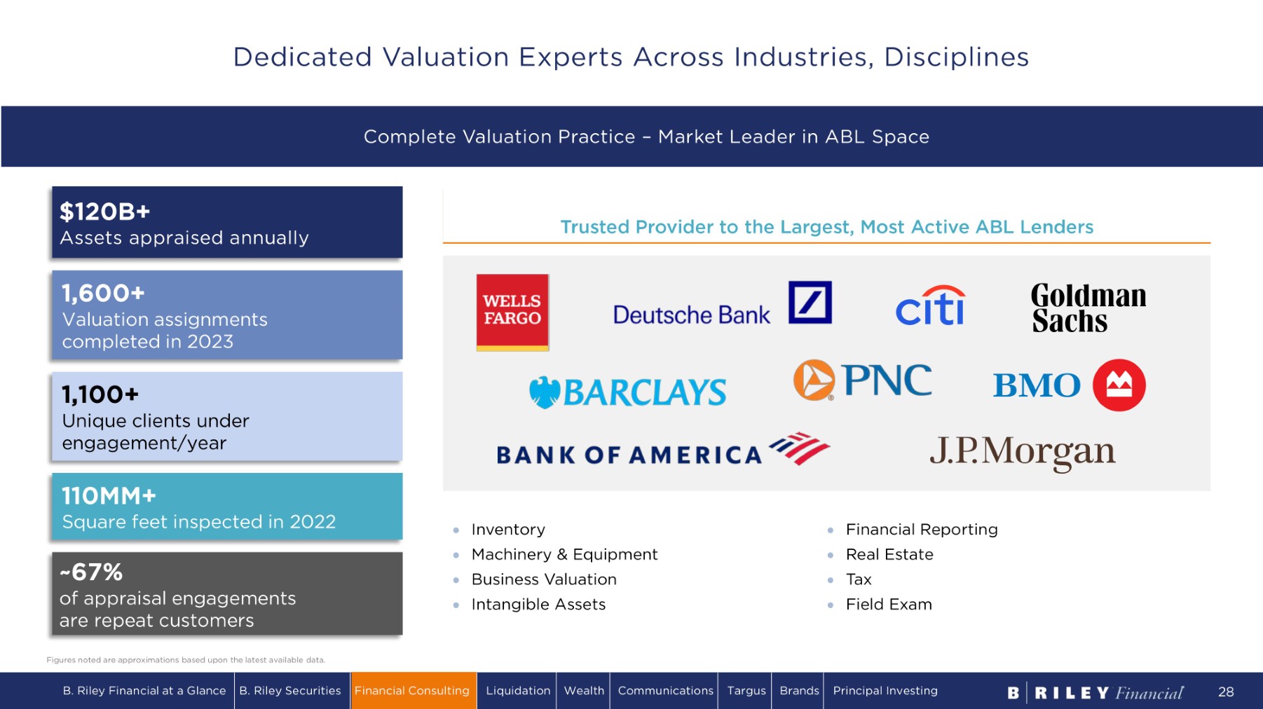 Inventory Machinery & Equipment Business Valuation Intangible Assets Financial Reporting Real Estate Tax Field Exam ~67% of appraisal engagements are repeat customers 1,100+ Unique clients under engagement/year 1,600+ Valuation assignments completed in 2023 110MM+ Square feet inspected in 2022 $120B+ Assets appraised annually Figures noted are approximations based upon the latest available data. Trusted Provider to the Largest, Most Active ABL Lenders Complete Valuation Practice – Market Leader in ABL Space B. Riley Financial at a Glance B. Riley Securities Financial Consulting Liquidation Wealth Communications Targus Brands Principal Investing 28 Dedicated Valuation Experts Across Industries, Disciplines
