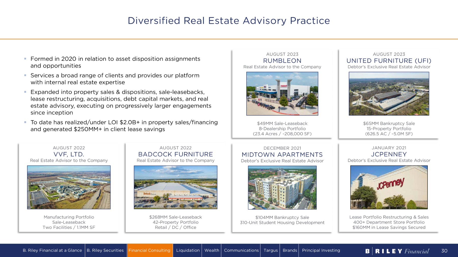 ▪ Formed in 2020 in relation to asset disposition assignments and opportunities ▪ Services a broad range of clients and provides our platform with internal real estate expertise ▪ Expanded into property sales & dispositions, sale - leasebacks, lease restructuring, acquisitions, debt capital markets, and real estate advisory, executing on progressively larger engagements since inception ▪ To date has realized/under LOI $2.0B+ in property sales/financing and generated $250MM+ in client lease savings AUGUST 2023 UNITED FURNITURE (UFI) Debtor’s Exclusive Real Estate Advisor $65MM Bankruptcy Sale 15 - Property Portfolio (626.5 AC / ~5.0M SF) AUGUST 2023 RUMBLEON Real Estate Advisor to the Company $49MM Sale - Leaseback 8 - Dealership Portfolio (23.4 Acres / ~208,000 SF) AUGUST 2022 BADCOCK FURNITURE Real Estate Advisor to the Company $268MM Sale - Leaseback 42 - Property Portfolio Retail / DC / Office AUGUST 2022 VVF, LTD. Real Estate Advisor to the Company Manufacturing Portfolio Sale - Leaseback Two Facilities / 1.1MM SF JANUARY 2021 JCPENNEY Debtor’s Exclusive Real Estate Advisor Lease Portfolio Restructuring & Sales 400+ Department Store Portfolio $160MM in Lease Savings Secured DECEMBER 2021 MIDTOWN APARTMENTS Debtor’s Exclusive Real Estate Advisor $104MM Bankruptcy Sale 310 - Unit Student Housing Development Diversified Real Estate Advisory Practice B. Riley Financial at a Glance B. Riley Securities Financial Consulting Liquidation Wealth Communications Targus Brands Principal Investing 30