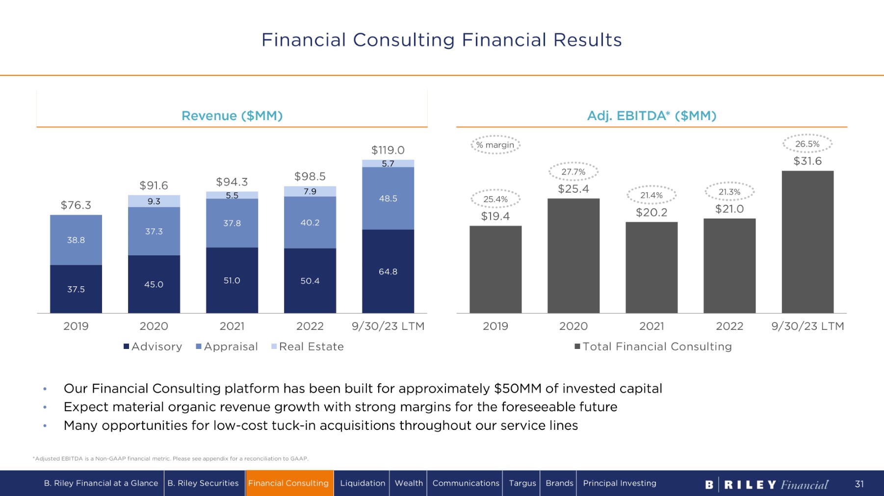 $ 1 9 . 4 $ 2 5 . 4 $ 2 0 . 2 $ 2 1 .0 2 0 1 9 9/30/23 LTM 2 0 20 2 0 21 2 0 22 Total Financial Consulting R e v e n u e ( $ MM) A d j . E B I T D A * ( $ MM ) • Our Financial Consulting platform has been built for approximately $50MM of invested capital • Expect material organic revenue growth with strong margins for the foreseeable future • Many opportunities for low - cost tuck - in acquisitions throughout our service lines *Adjusted EBITDA is a Non - GAAP financial metric. Please see appendix for a reconciliation to GAAP. 2 7 . 7 % 2 1 .4 % 2 1 . 3 % 26.5% $ 3 1 . 6 % m a r g i n 37.5 45.0 5 1 .0 5 0 .4 64.8 38.8 37.3 37.8 40.2 48.5 9.3 5 .5 7.9 5.7 $ 7 6 . 3 $ 9 1 . 6 $ 9 4 . 3 $9 8 . 5 $119.0 2 0 1 9 2020 A d v i s o r y 2021 Appraisal 2022 Real Estate 9/30/23 LTM 25 . 4 % Financial Consulting Financial Results B. Riley Financial at a Glance B. Riley Securities Financial Consulting Liquidation Wealth Communications Targus Brands Principal Investing 31