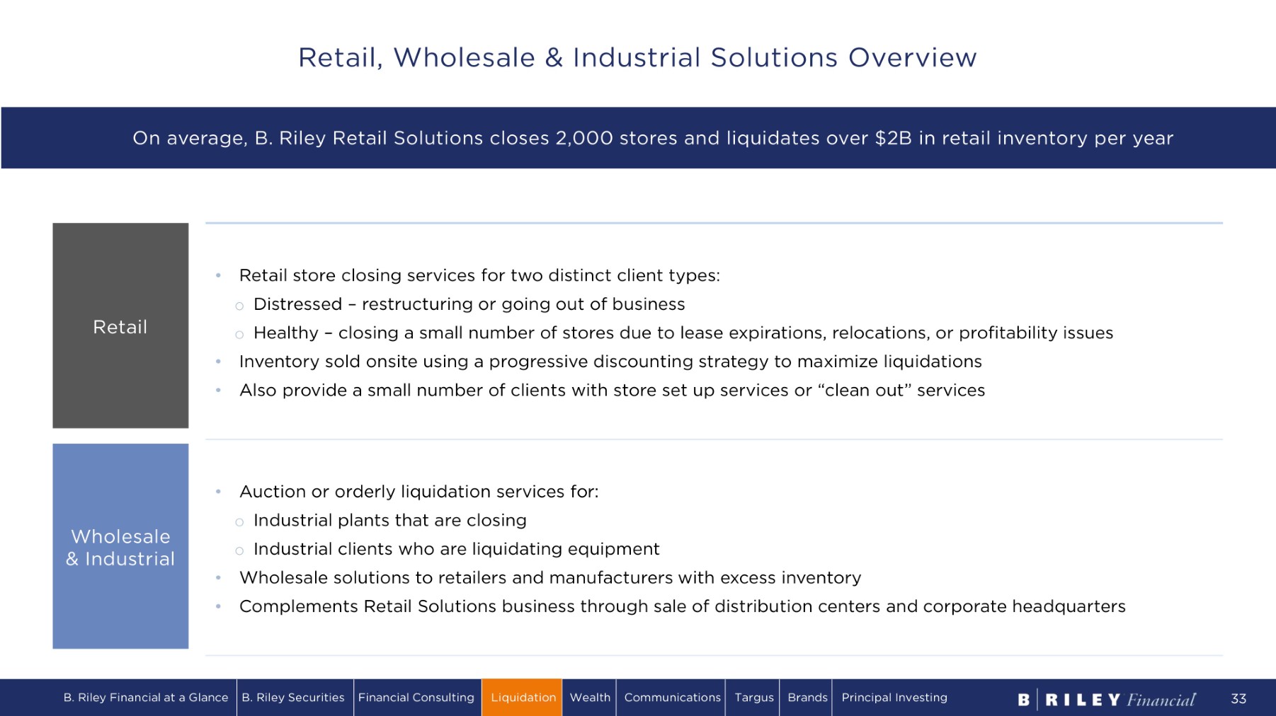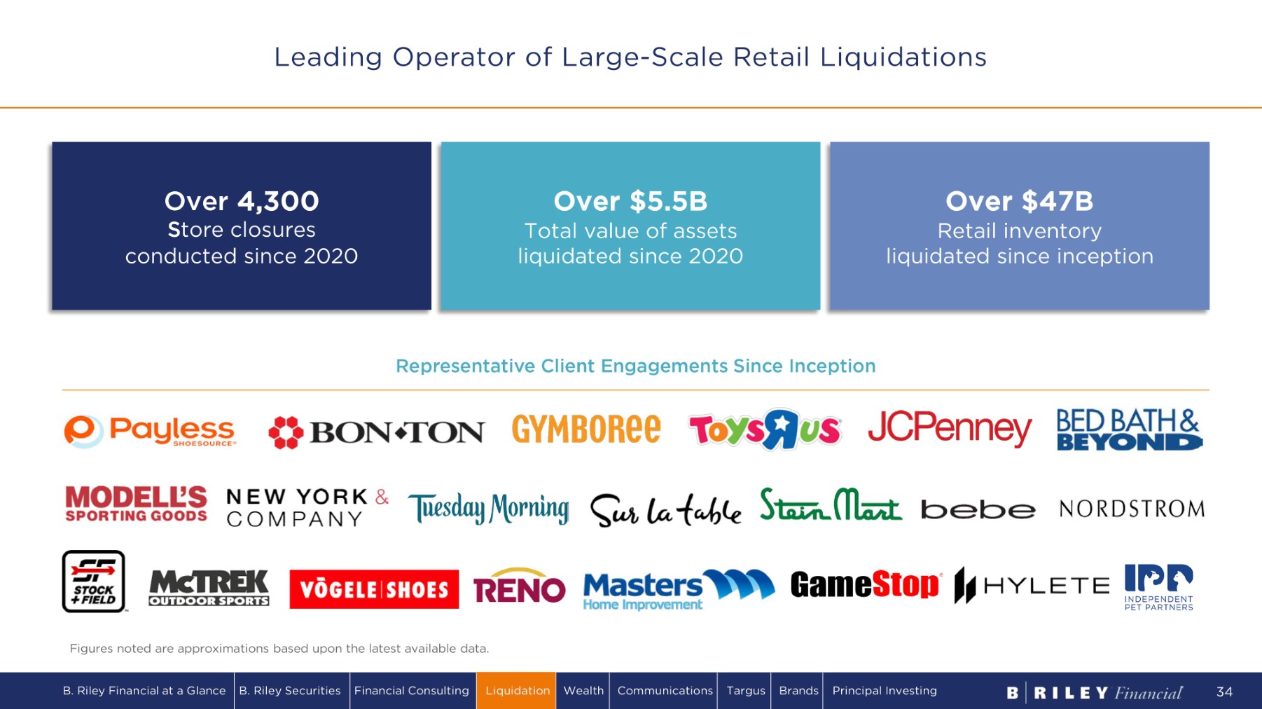 • Retail store closing services for two distinct client types: o Distressed – restructuring or going out of business o Healthy – closing a small number of stores due to lease expirations, relocations, or profitability issues • Inventory sold onsite using a progressive discounting strategy to maximize liquidations • Also provide a small number of clients with store set up services or “clean out” services • Auction or orderly liquidation services for: o Industrial plants that are closing o Industrial clients who are liquidating equipment • Wholesale solutions to retailers and manufacturers with excess inventory • Complements Retail Solutions business through sale of distribution centers and corporate headquarters Retail Wholesale & Industrial On average, B. Riley Retail Solutions closes 2,000 stores and liquidates over $2B in retail inventory per year B. Riley Financial at a Glance B. Riley Securities Financial Consulting Liquidation Wealth Communications Targus Brands Principal Investing 33 Retail, Wholesale & Industrial Solutions Overview
