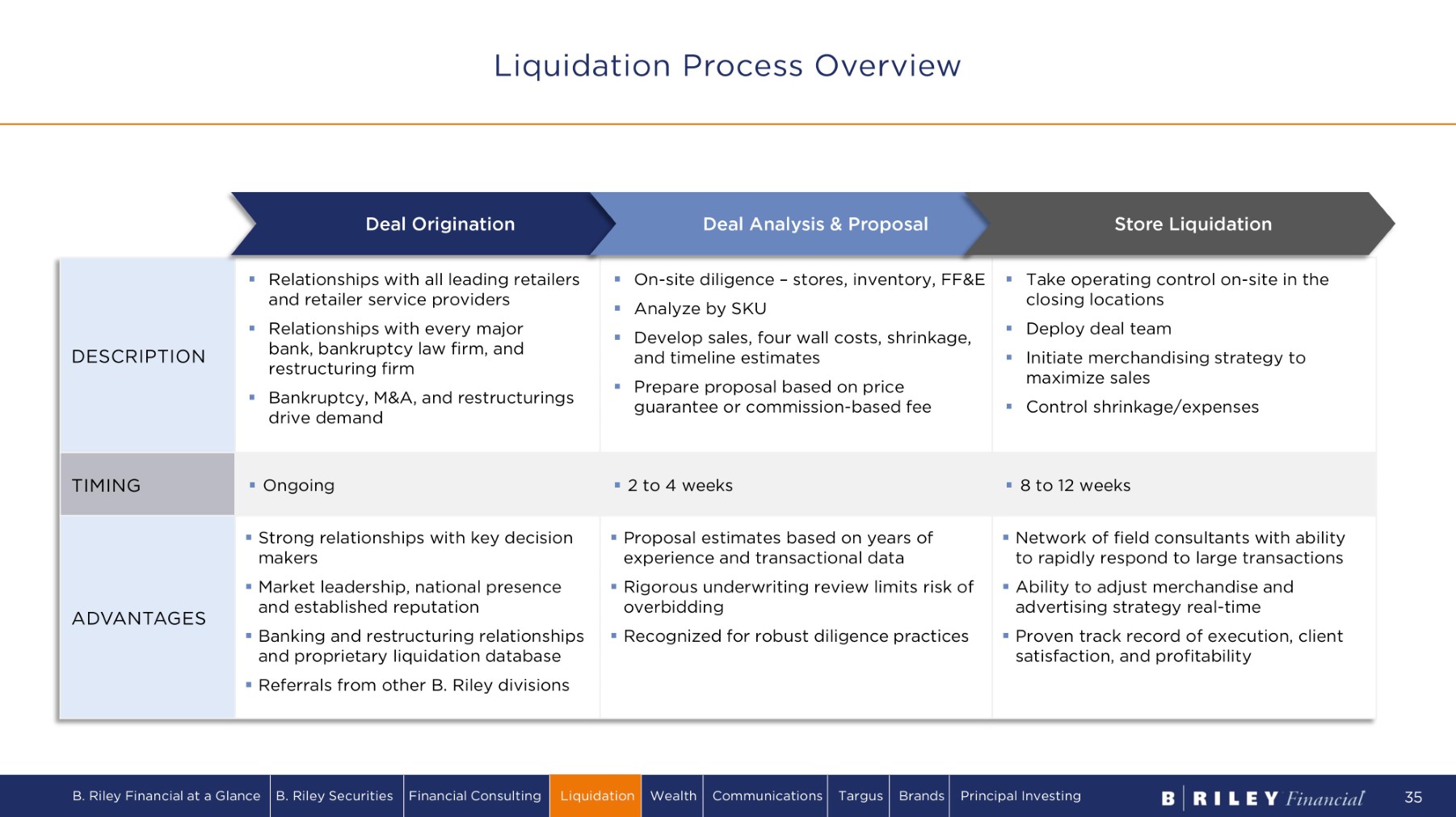 Representative Client Engagements Since Inception Figures noted are approximations based upon the latest available data. Over $5.5B Total value of assets liquidated since 2020 Over 4,300 S tore closures conducted since 2020 Over $47B Retail inventory liquidated since inception Leading Operator of Large - Scale Retail Liquidations B. Riley Financial at a Glance B. Riley Securities Financial Consulting Liquidation Wealth Communications Targus Brands Principal Investing 34