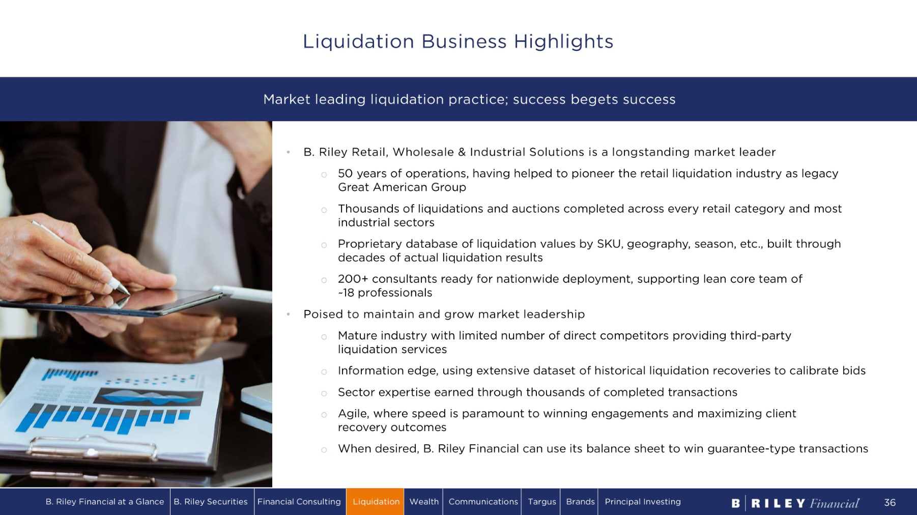 ▪ Take operating control on - site in the closing locations ▪ Deploy deal team ▪ Initiate merchandising strategy to maximize sales ▪ Control shrinkage/expenses ▪ On - site diligence – stores, inventory, FF&E ▪ Analyze by SKU ▪ Develop sales, four wall costs, shrinkage, and timeline estimates ▪ Prepare proposal based on price guarantee or commission - based fee ▪ Relationships with all leading retailers and retailer service providers ▪ Relationships with every major bank, bankruptcy law firm, and restructuring firm ▪ Bankruptcy, M&A, and restructurings drive demand DESCRIPTION ▪ 8 t o 12 w ee k s ▪ 2 to 4 weeks ▪ Ongoing TIMING ▪ Network of field consultants with ability to rapidly respond to large transactions ▪ Ability to adjust merchandise and advertising strategy real - time ▪ Proven track record of execution, client satisfaction, and profitability ▪ Proposal estimates based on years of experience and transactional data ▪ Rigorous underwriting review limits risk of overbidding ▪ Recognized for robust diligence practices ▪ Strong relationships with key decision makers ▪ Market leadership, national presence and established reputation ▪ Banking and restructuring relationships and proprietary liquidation database ▪ Referrals from other B. Riley divisions ADVANTAGES De a l O r i gi na ti o n De a l Ana l y si s & P r o po sa l S t o r e L i qui da ti o n Liquidation Process Overview B. Riley Financial at a Glance B. Riley Securities Financial Consulting Liquidation Wealth Communications Targus Brands Principal Investing 35