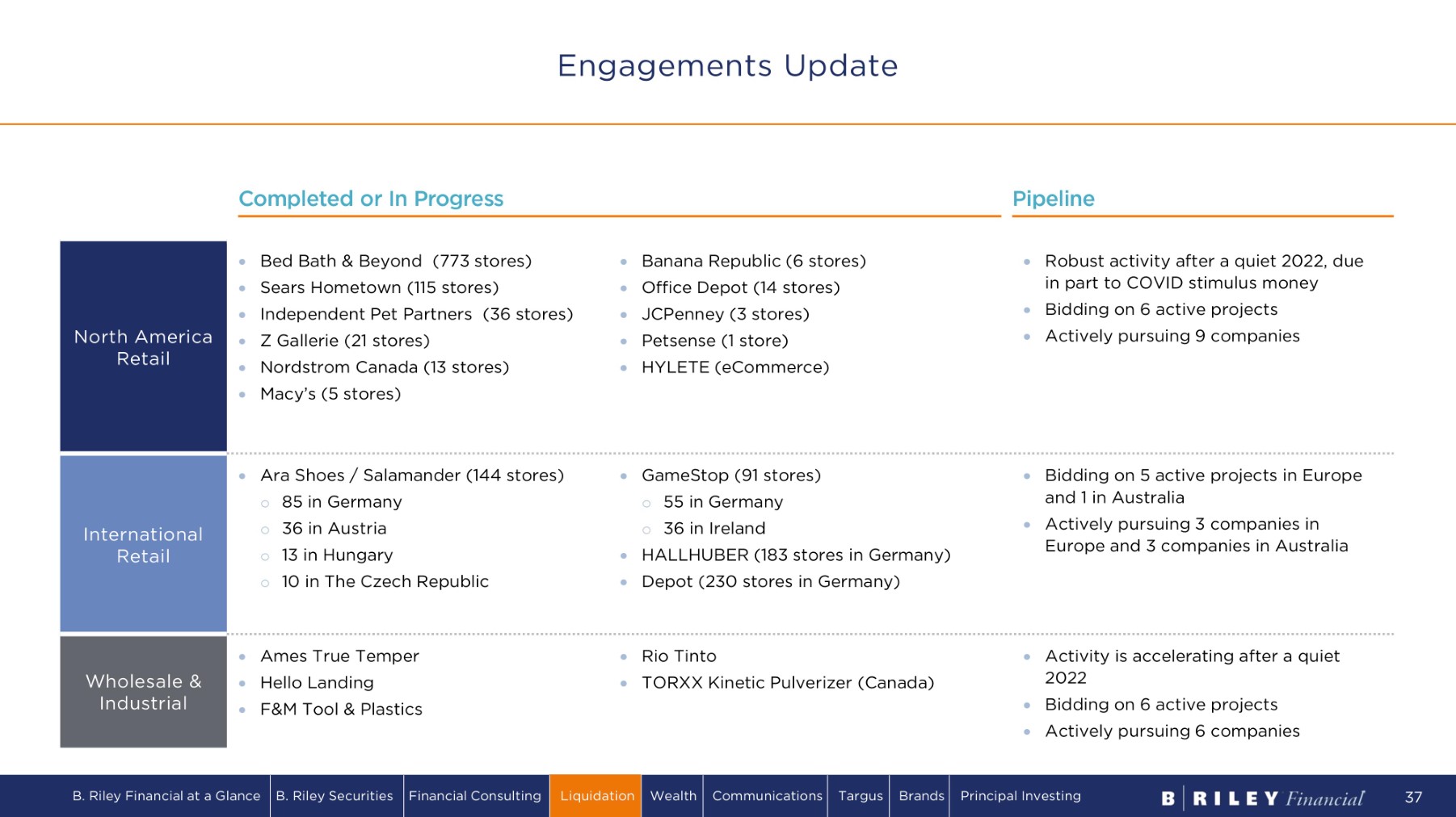 • B. Riley Retail, Wholesale & Industrial Solutions is a longstanding market leader o 50 years of operations, having helped to pioneer the retail liquidation industry as legacy Great American Group o Thousands of liquidations and auctions completed across every retail category and most industrial sectors o Proprietary database of liquidation values by SKU, geography, season, etc., built through decades of actual liquidation results o 200+ consultants ready for nationwide deployment, supporting lean core team of ~ 1 8 p r o f e s s i o n a ls • Poised to maintain and grow market leadership o Mature industry with limited number of direct competitors providing third - party liquidation services o Information edge, using extensive dataset of historical liquidation recoveries to calibrate bids o Sector expertise earned through thousands of completed transactions o Agile, where speed is paramount to winning engagements and maximizing client recovery outcomes o When desired, B. Riley Financial can use its balance sheet to win guarantee - type transactions Market leading liquidation practice; success begets success Liquidation Business Highlights B. Riley Financial at a Glance B. Riley Securities Financial Consulting Liquidation Wealth Communications Targus Brands Principal Investing 36