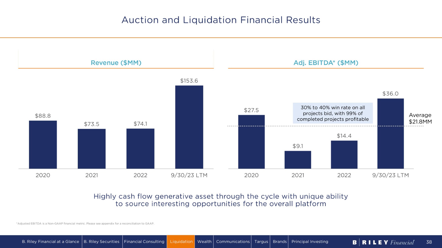 Auction and Liquidation Financial Results R e v e n u e ( $ MM) $ 88 . 8 $ 7 3 . 5 $ 7 4 . 1 $ 1 53 . 6 2 0 20 2 0 21 2 0 22 9/30/23 LTM A d j . E B I T D A * ( $ MM ) $ 2 7 . 5 $9 .1 $14.4 $ 3 6 .0 2 0 20 2 0 21 2 0 22 9/30/23 LTM Highly cash flow generative asset through the cycle with unique ability to source interesting opportunities for the overall platform Average $ 2 1 . 8 MM 30% to 40% win rate on all projects bid, with 99% of completed projects profitable *Adjusted EBITDA is a Non - GAAP financial metric. Please see appendix for a reconciliation to GAAP. B. Riley Financial at a Glance B. Riley Securities Financial Consulting Liquidation Wealth Communications Targus Brands Principal Investing 38