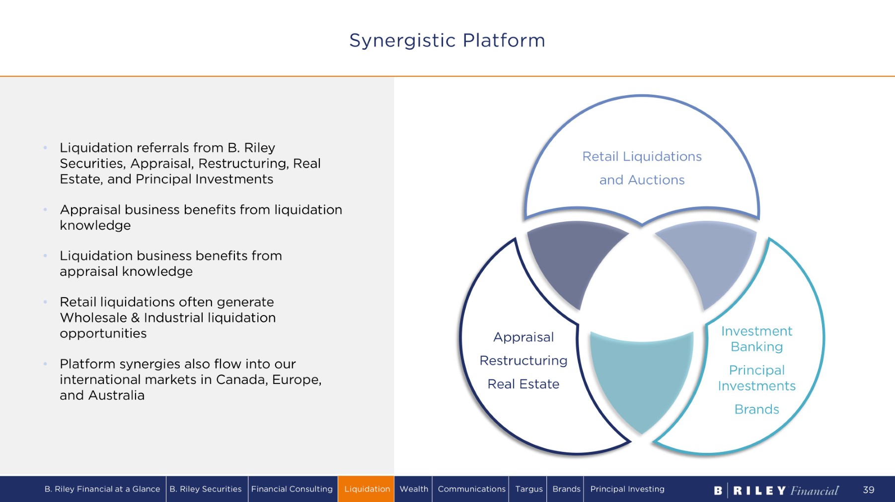• Liquidation referrals from B. Riley Securities, Appraisal, Restructuring, Real Estate, and Principal Investments • Appraisal business benefits from liquidation knowledge • Liquidation business benefits from appraisal knowledge • Retail liquidations often generate Wholesale & Industrial liquidation opportunities • Platform synergies also flow into our international markets in Canada, Europe, and Australia Retail Liquidations and Auctions I n v e s tmen t Banking Principal I n v e s tmen ts Brands Appraisal R e s tr u c tu r i n g Real Estate Synergistic Platform B. Riley Financial at a Glance B. Riley Securities Financial Consulting Liquidation Wealth Communications Targus Brands Principal Investing 39