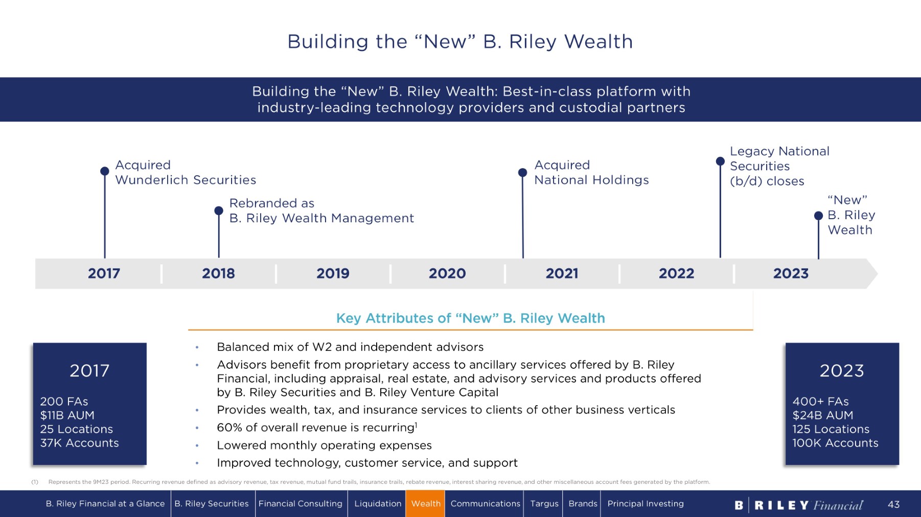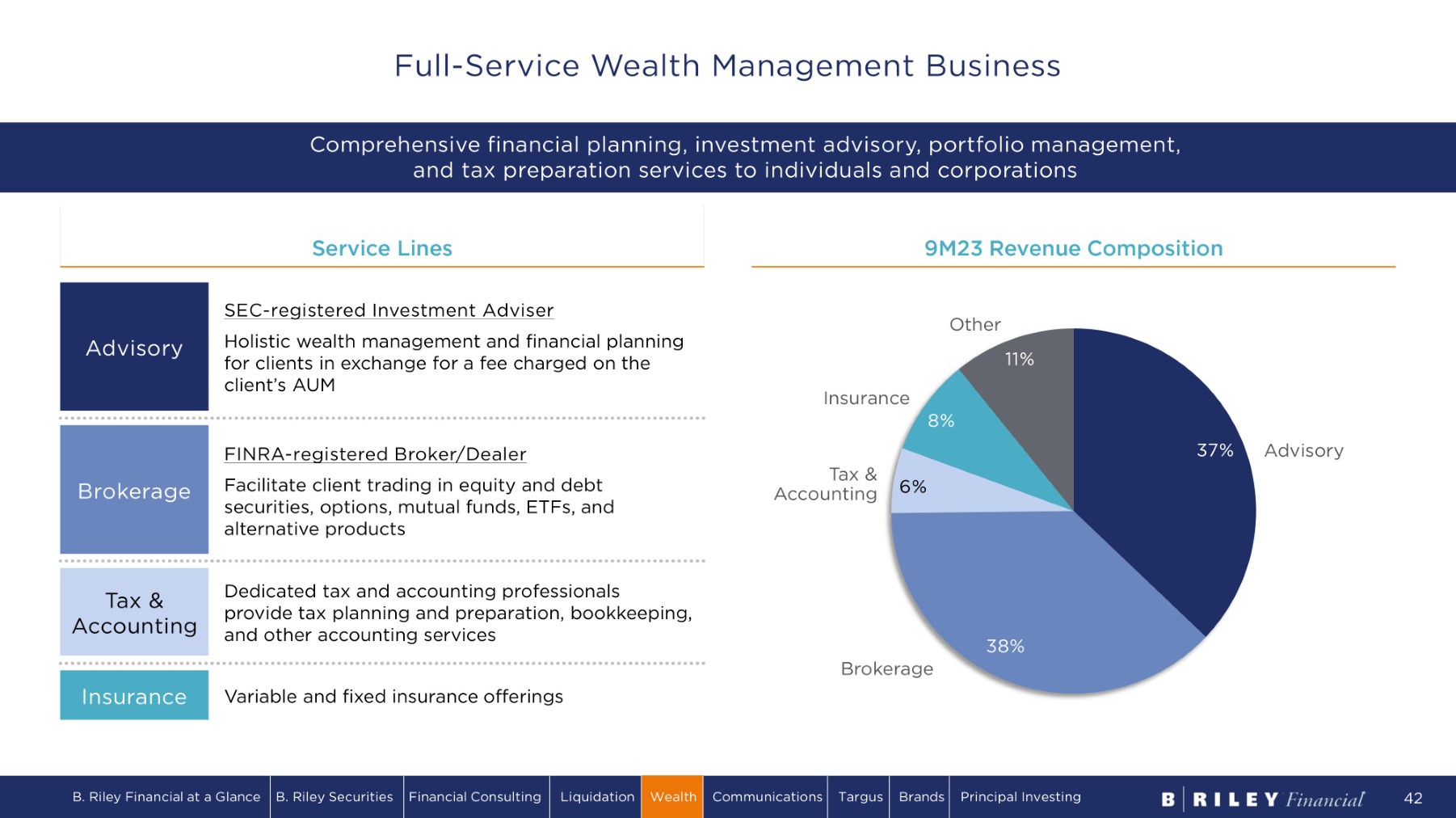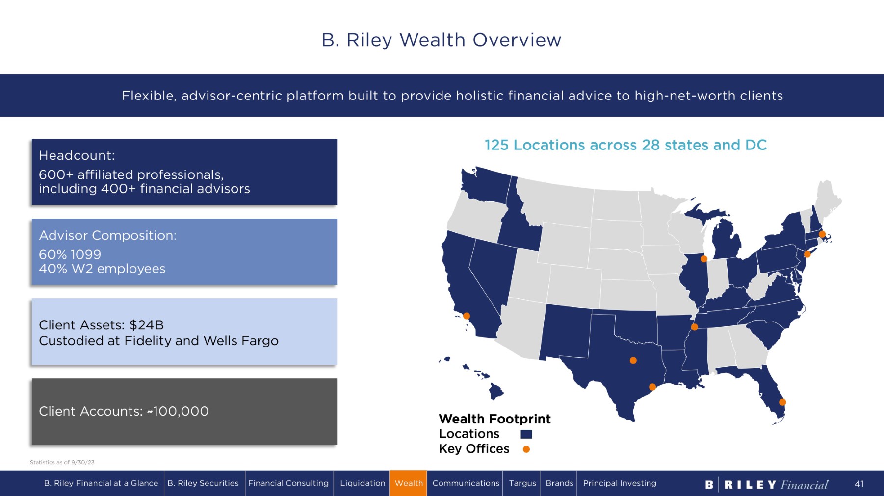 1 2 5 L o ca ti o n s a cr o s s 2 8 s t a t e s a n d DC Advisor Composition: 60% 1099 40% W2 employees Headcount: 600+ affiliated professionals, including 400+ financial advisors Client Assets: $24B Custodied at Fidelity and Wells Fargo Client Accounts: ~ 100,000 Wealth Footprint Locations K e y O ff i c e s Flexible, advisor - centric platform built to provide holistic financial advice to high - net - worth clients B. Riley Financial at a Glance B. Riley Securities Financial Consulting Liquidation Wealth Communications Targus Brands Principal Investing 41 B. Riley Wealth Overview Statistics as of 9/30/23