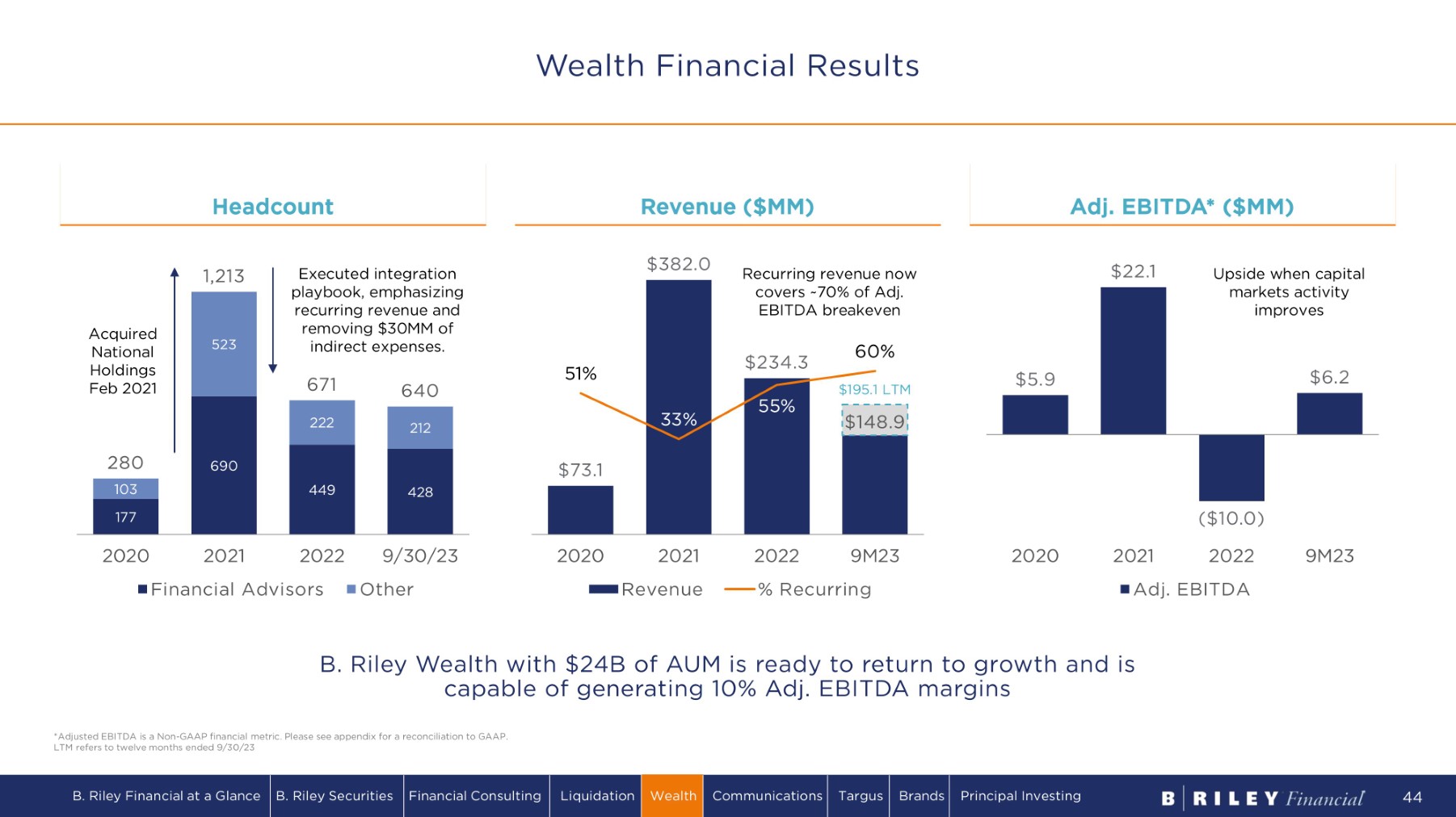 2023 2022 2021 2020 2019 2018 2017 Acquired National Holdings Acquired Wunderlich Securities Rebranded as B. Riley Wealth Management Legacy National Securities (b/d) closes “ N e w ” B. Riley Wealth • Balanced mix of W2 and independent advisors • Advisors benefit from proprietary access to ancillary services offered by B. Riley Financial, including appraisal, real estate, and advisory services and products offered by B. Riley Securities and B. Riley Venture Capital • Provides wealth, tax, and insurance services to clients of other business verticals • 60% of overall revenue is recurring 1 • Lowered monthly operating expenses • Improved technology, customer service, and support 2017 200 FAs $ 11B A UM 25 Locations 37K Accounts 2023 400+ FAs $24B AUM 125 Locations 100K Accounts Key Attributes of “New” B. Riley Wealth (1) Represents the 9M23 period. Recurring revenue defined as advisory revenue, tax revenue, mutual fund trails, insurance trails, rebate revenue, interest sharing revenue, and other miscellaneous account fees generated by the platform. Building the “New” B. Riley Wealth: Best - in - class platform with industry - leading technology providers and custodial partners B. Riley Financial at a Glance B. Riley Securities Financial Consulting Liquidation Wealth Communications Targus Brands Principal Investing 43 Building the “New” B. Riley Wealth