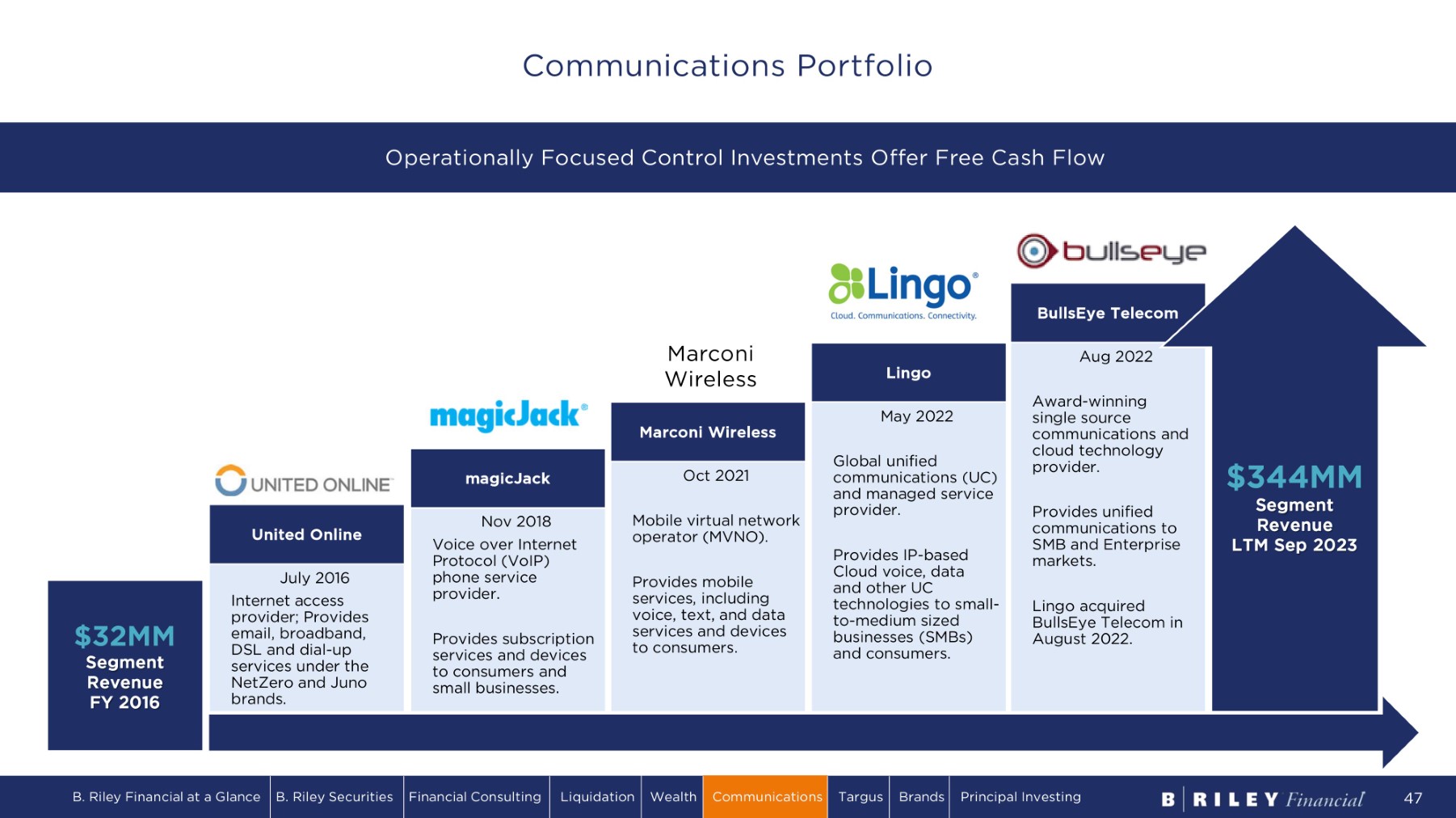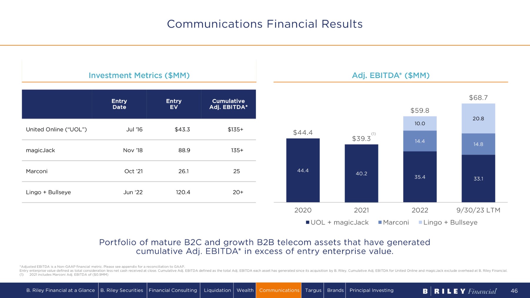 44.4 40.2 35.4 33.1 14.4 14.8 10.0 20.8 $ 44. 4 $ 3 9 . 3 $ 5 9 . 8 $ 6 8 .7 2020 2021 UO L + m a g i c Ja c k M a r c o ni 2022 9/30/23 LTM Lingo + Bullseye A d j . E B I T D A * ( $ MM ) Cumulative Adj. EBITDA* E n t r y EV E n t r y Date $135+ $43.3 Jul ’16 United Online (“UOL”) 135+ 88.9 Nov ’18 magicJack 25 26.1 Oct ’21 Marconi 20+ 120.4 Jun ‘22 Lingo + Bullseye I n v e s t m e n t M e t r i c s ( $ MM ) Portfolio of mature B2C and growth B2B telecom assets that have generated cumulative Adj. EBITDA* in excess of entry enterprise value. *Adjusted EBITDA is a Non - GAAP financial metric. Please see appendix for a reconciliation to GAAP. Entry enterprise value defined as total consideration less net cash received at close. Cumulative Adj. EBITDA defined as the total Adj. EBITDA each asset has generated since its acquisition by B. Riley. Cumulative Adj. EBITDA for United Online and magicJack exclude overhead at B. Riley Financial. (1) 2021 includes Marconi Adj. EBITDA of ($0.9MM) ( 1 ) Communications Financial Results B. Riley Financial at a Glance B. Riley Securities Financial Consulting Liquidation Wealth Communications Targus Brands Principal Investing 46