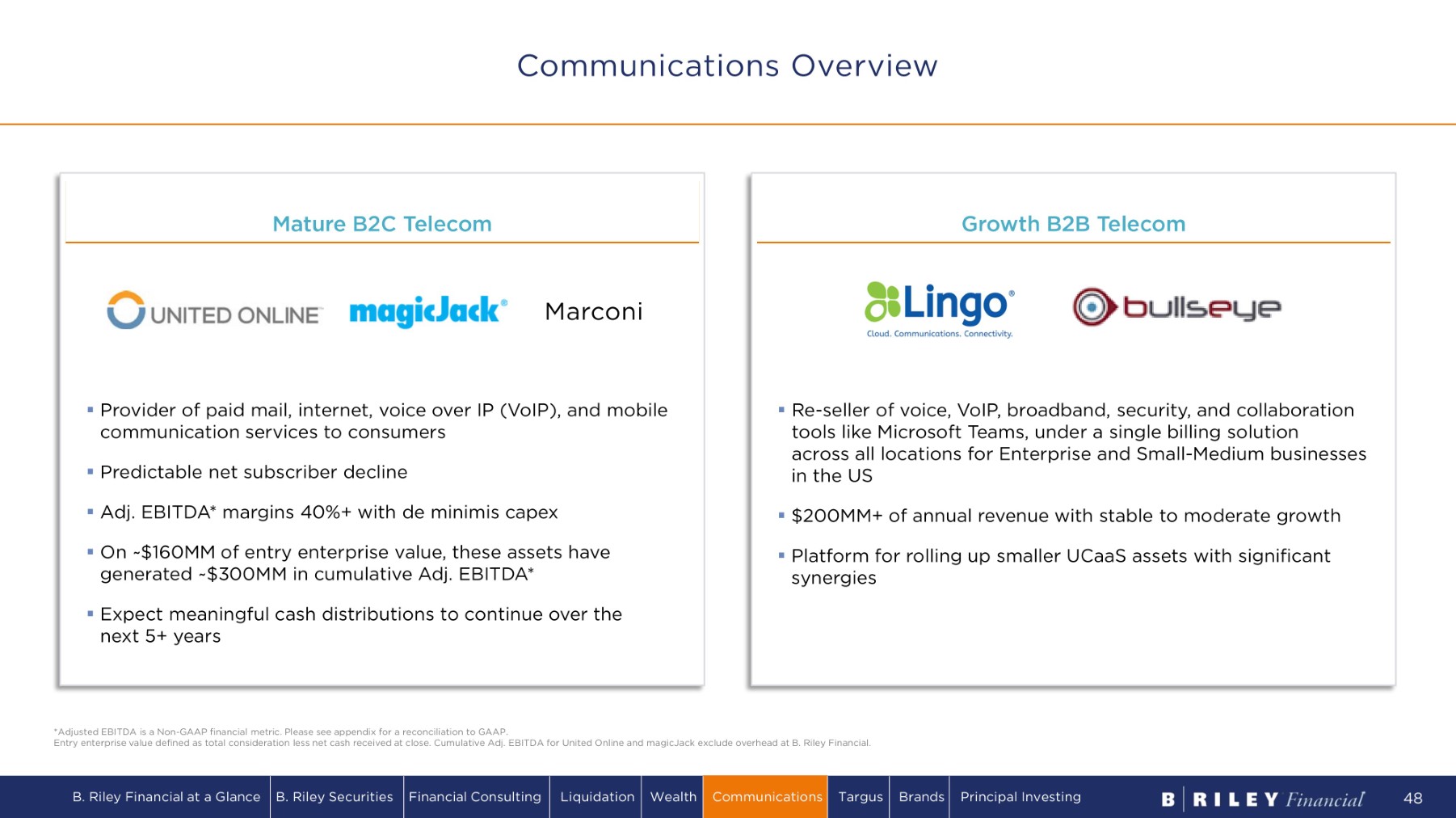 Marconi Wireless magicJack United Online July 2016 Internet access provider; Provides email, broadband, DSL and dial - up services under the NetZero and Juno brands. Nov 2018 Voice over Internet Protocol (VoIP) phone service provider. Provides subscription services and devices to consumers and small businesses. Oct 2021 Mobile virtual network operator (MVNO). Provides mobile services, including voice, text, and data services and devices to consumers. Aug 2022 Award - winning single source communications and cloud technology provider. Provides unified communications to SMB and Enterprise markets. Lingo acquired BullsEye Telecom in August 2022. $ 3 2 MM S eg m e n t R ev e n u e FY 2016 L i n g o May 2022 Global unified communications (UC) and managed service provider. Provides IP - based Cloud voice, data and other UC technologies to small - to - medium sized businesses (SMBs) and consumers. BullsEye Telecom $344MM S eg m e n t Revenue LTM Sep 2023 Marconi W i re l e s s Operationally Focused Control Investments Offer Free Cash Flow Communications Portfolio B. Riley Financial at a Glance B. Riley Securities Financial Consulting Liquidation Wealth Communications Targus Brands Principal Investing 47