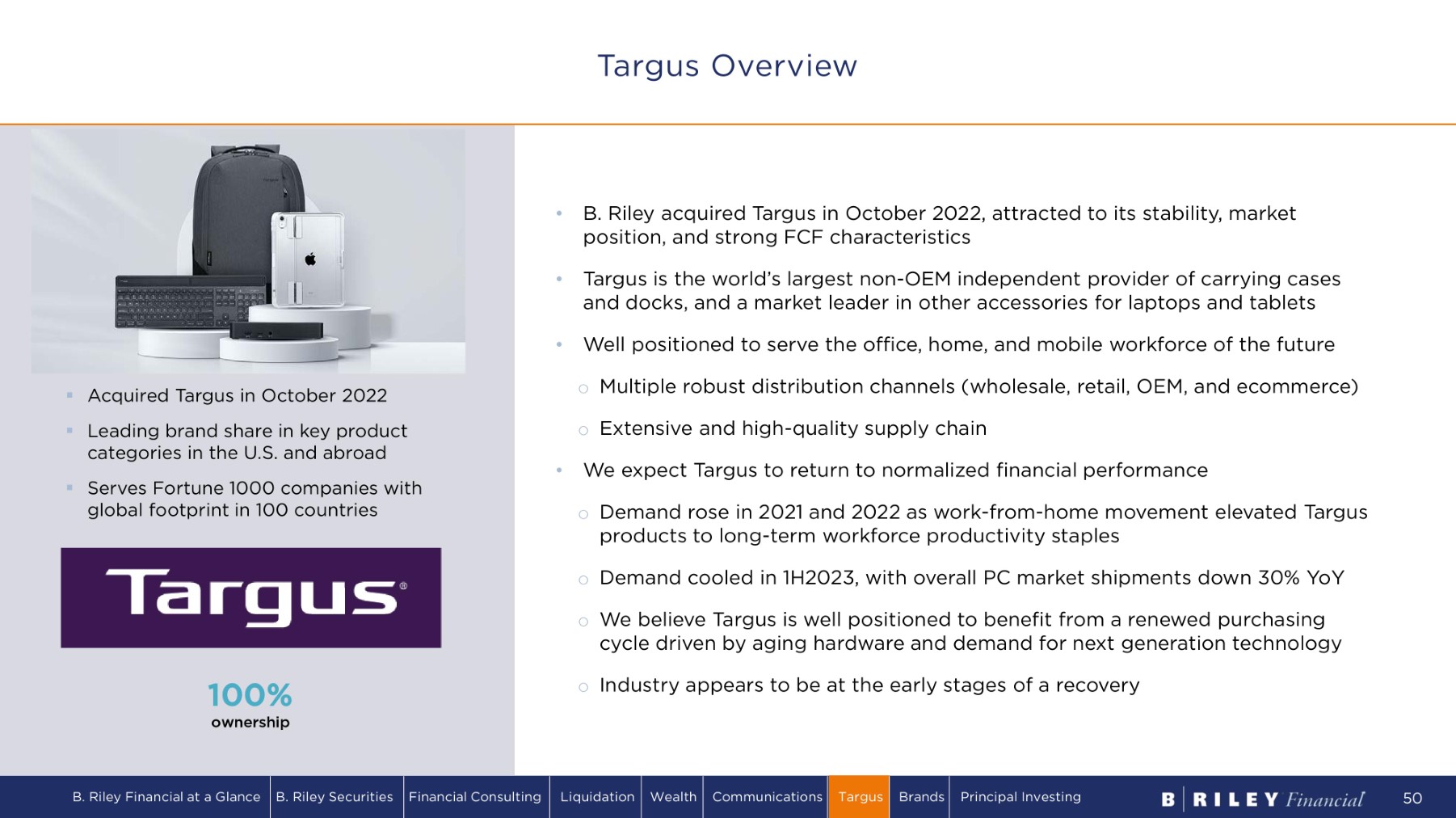 ▪ Acquired Targus in October 2022 ▪ Leading brand share in key product categories in the U.S. and abroad ▪ Serves Fortune 1000 companies with global footprint in 100 countries 1 00 % ownership B. Riley Financial at a Glance B. Riley Securities Financial Consulting Liquidation Wealth Communications Targus Brands Principal Investing 50 • B. Riley acquired Targus in October 2022, attracted to its stability, market position, and strong FCF characteristics • Targus is the world’s largest non - OEM independent provider of carrying cases and docks, and a market leader in other accessories for laptops and tablets • Well positioned to serve the office, home, and mobile workforce of the future o Multiple robust distribution channels (wholesale, retail, OEM, and ecommerce) o Extensive and high - quality supply chain • We expect Targus to return to normalized financial performance o Demand rose in 2021 and 2022 as work - from - home movement elevated Targus products to long - term workforce productivity staples o Demand cooled in 1H2023, with overall PC market shipments down 30% YoY o We believe Targus is well positioned to benefit from a renewed purchasing cycle driven by aging hardware and demand for next generation technology o Industry appears to be at the early stages of a recovery Targus Overview