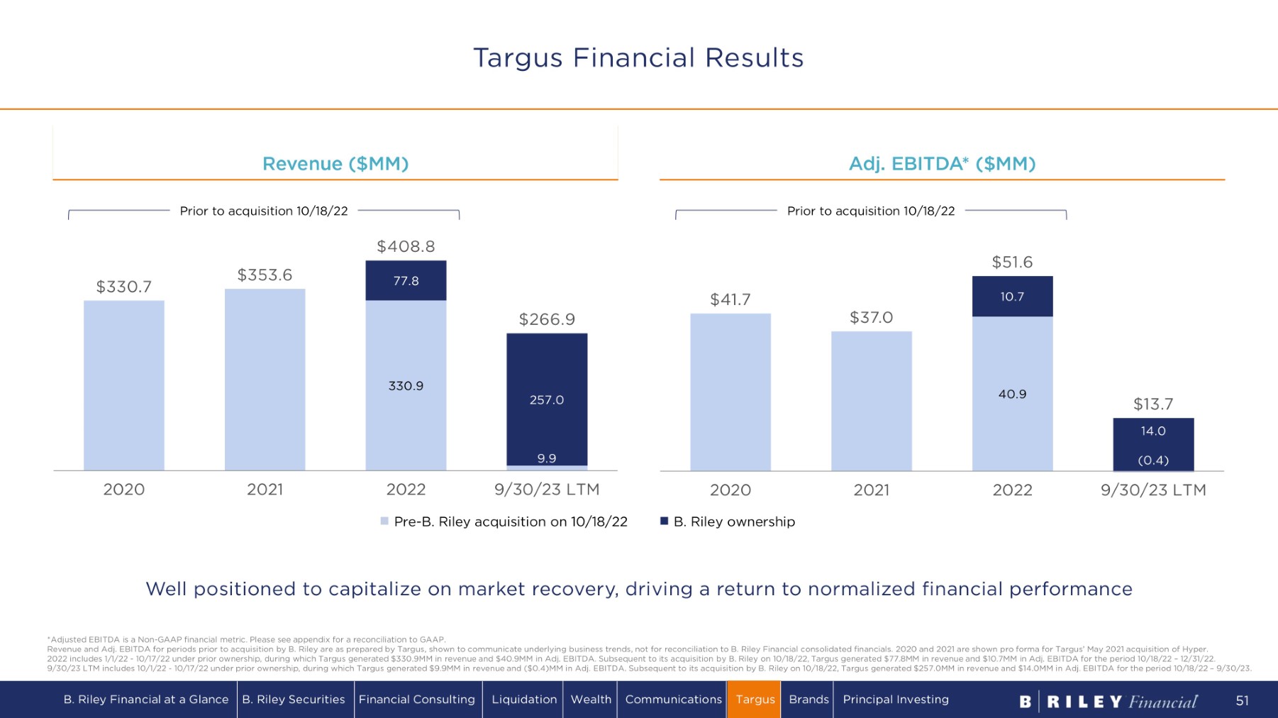 R e v e n u e ( $ MM) 330.9 9 . 9 77.8 257 . 0 $ 33 0.7 $ 35 3. 6 $ 40 8 .8 $ 2 66 . 9 2 0 20 2 0 21 A d j . E B I T D A * ( $ MM ) 2022 9/30/23 LTM Pre - B. Riley acquisition on 10/18/22 Well positioned to capitalize on market recovery, driving a return to normalized financial performance *Adjusted EBITDA is a Non - GAAP financial metric. Please see appendix for a reconciliation to GAAP. Revenue and Adj. EBITDA for periods prior to acquisition by B. Riley are as prepared by Targus, shown to communicate underlying business trends, not for reconciliation to B. Riley Financial consolidated financials. 2020 and 2021 are shown pro forma for Targus’ May 2021 acquisition of Hyper. 2022 includes 1/1/22 - 10/17/22 under prior ownership, during which Targus generated $330.9MM in revenue and $40.9MM in Adj. EBITDA. Subsequent to its acquisition by B. Riley on 10/18/22, Targus generated $77.8MM in revenue and $10.7MM in Adj. EBITDA for the period 10/18/22 – 12/31/22. 9/30/23 LTM includes 10/1/22 - 10/17/22 under prior ownership, during which Targus generated $9.9MM in revenue and ($0.4)MM in Adj. EBITDA. Subsequent to its acquisition by B. Riley on 10/18/22, Targus generated $257.0MM in revenue and $14.0MM in Adj. EBITDA for the period 10/18/22 – 9/30/23. 40.9 10.7 14.0 (0.4) $ 4 1 .7 $ 3 7 . 0 $ 5 1 . 6 $ 1 3 .7 2 0 20 2 0 21 2 0 22 9/30/23 LTM B. Riley ownership Prior to acquisition 10/18/22 Prior to acquisition 10/18/22 Targus Financial Results B. Riley Financial at a Glance B. Riley Securities Financial Consulting Liquidation Wealth Communications Targus Brands Principal Investing 51