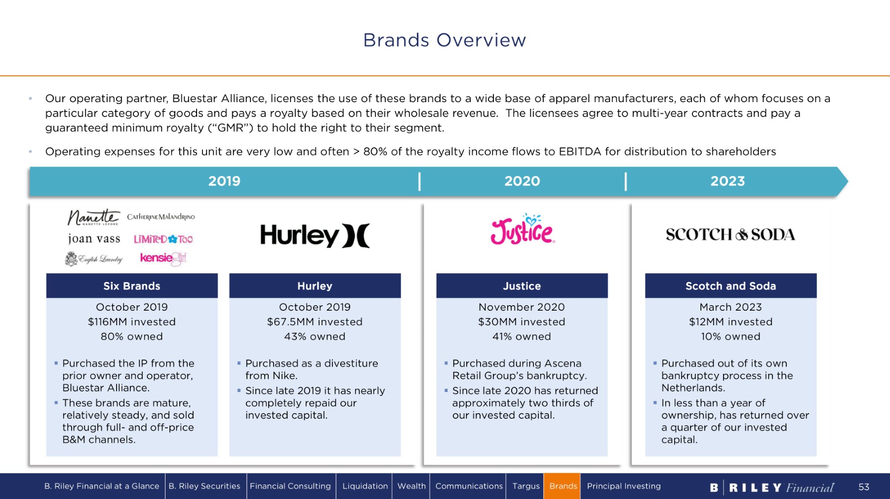 Six Brands October 2019 $116MM invested 80% owned ▪ Purchased the IP from the prior owner and operator, Bluestar Alliance . ▪ These brands are mature, relatively steady, and sold through full - and off - price B&M channels. Hurley October 2019 $67.5MM invested 43% owned ▪ Purchased as a divestiture from Nike. ▪ Since late 2019 it has nearly completely repaid our invested capital. Justice November 2020 $30MM invested 41% owned ▪ Purchased during Ascena Retail Group’s bankruptcy. ▪ Since late 2020 has returned approximately two thirds of our invested capital. Scotch and Soda March 2023 $12MM invested 10% owned ▪ Purchased out of its own bankruptcy process in the Netherlands. ▪ In less than a year of ownership, has returned over a quarter of our invested capital. • Our operating partner, Bluestar Alliance, licenses the use of these brands to a wide base of apparel manufacturers, each of whom focuses on a particular category of goods and pays a royalty based on their wholesale revenue. The licensees agree to multi - year contracts and pay a guaranteed minimum royalty (“GMR”) to hold the right to their segment. • Operating expenses for this unit are very low and often > 80% of the royalty income flows to EBITDA for distribution to shareholders Brands Overview 2023 2020 2019 B. Riley Financial at a Glance B. Riley Securities Financial Consulting Liquidation Wealth Communications Targus Brands Principal Investing 53