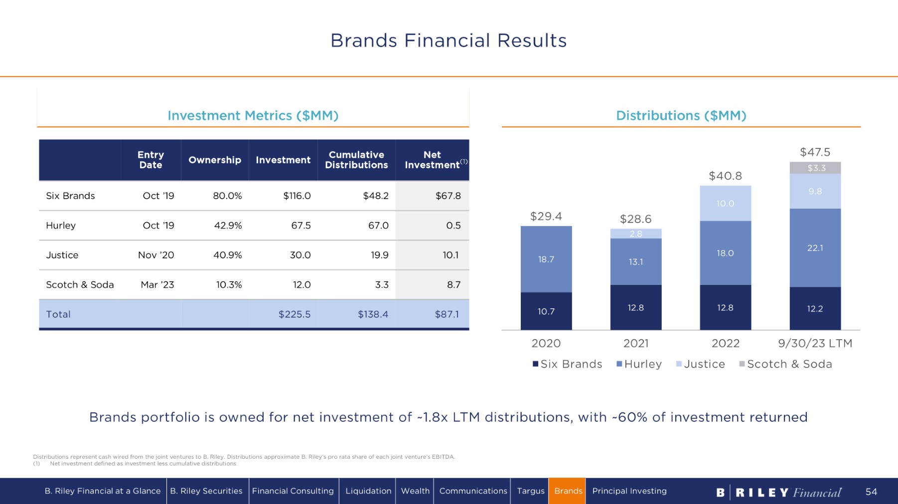 Net Inv e s t m e n t ( 1 ) Cumulative Di s t r ib u t io n s Investment Ownership E n t r y Date $67.8 $48.2 $116.0 80.0% Oct ’19 Six Brands 0.5 67.0 67.5 42.9% Oct ’19 Hurley 10.1 19.9 30.0 40.9% Nov ’20 Justice 8.7 3.3 12.0 10.3% Mar ’23 Scotch & Soda $87.1 $138.4 $225.5 Total 10.7 12.8 1 2 .8 1 2 .2 18.7 13.1 18.0 22.1 2.8 10.0 9.8 $3.3 $ 2 9 . 4 $ 2 8 . 6 $ 4 0 . 8 $4 7 . 5 2020 Six Brands 2021 H u r l e y 2 0 22 Justice 9/30/23 LTM Scotch & Soda I n v e s t m e n t M e t r i c s ( $ MM ) Distributions ($MM) Brands portfolio is owned for net investment of ~1.8x LTM distributions, with ~60% of investment returned Distributions represent cash wired from the joint ventures to B. Riley. Distributions approximate B. Riley’s pro rata share of each joint venture’s EBITDA. (1) Net investment defined as investment less cumulative distributions Brands Financial Results B. Riley Financial at a Glance B. Riley Securities Financial Consulting Liquidation Wealth Communications Targus Brands Principal Investing 54