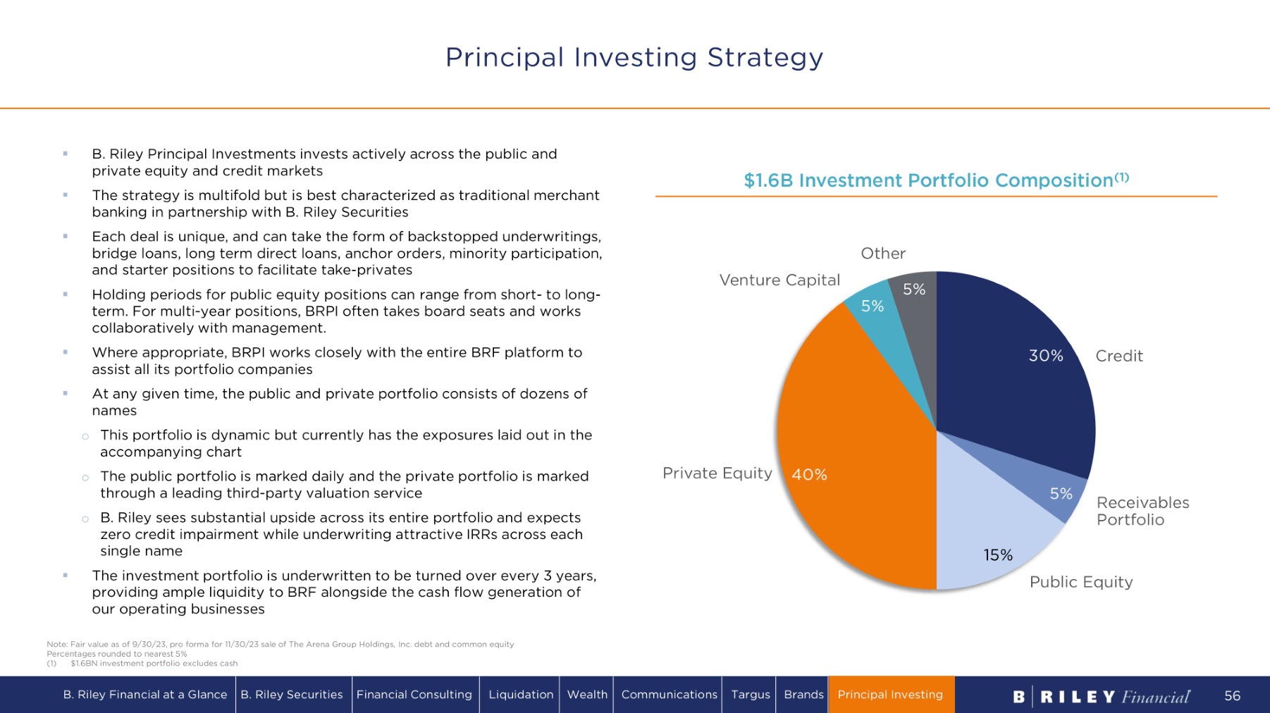 ▪ B. Riley Principal Investments invests actively across the public and private equity and credit markets ▪ The strategy is multifold but is best characterized as traditional merchant banking in partnership with B. Riley Securities ▪ Each deal is unique, and can take the form of backstopped underwritings, bridge loans, long term direct loans, anchor orders, minority participation, and starter positions to facilitate take - privates ▪ Holding periods for public equity positions can range from short - to long - term. For multi - year positions, BRPI often takes board seats and works collaboratively with management. ▪ Where appropriate, BRPI works closely with the entire BRF platform to assist all its portfolio companies ▪ At any given time, the public and private portfolio consists of dozens of names o This portfolio is dynamic but currently has the exposures laid out in the accompanying chart o The public portfolio is marked daily and the private portfolio is marked through a leading third - party valuation service o B . Riley sees substantial upside across its entire portfolio and expects zero credit impairment while underwriting attractive IRRs across each single name ▪ The investment portfolio is underwritten to be turned over every 3 years, providing ample liquidity to BRF alongside the cash flow generation of our operating businesses $ 1 . 6 B I n v e s t m e n t P o r tf o li o C o m p o si t i o n ( 1 ) 3 0% 5% 1 5% 4 0% 5% 5% C r e d i t R e c ei v a b l es Portfolio Public Equity Private Equity Venture Capital O t h e r Principal Investing Strategy Note: Fair value as of 9/30/23, pro forma for 11/30/23 sale of The Arena Group Holdings, Inc. debt and common equity Percentages rounded to nearest 5% (1) $1.6BN investment portfolio excludes cash B. Riley Financial at a Glance B. Riley Securities Financial Consulting Liquidation Wealth Communications Targus Brands Principal Investing 56