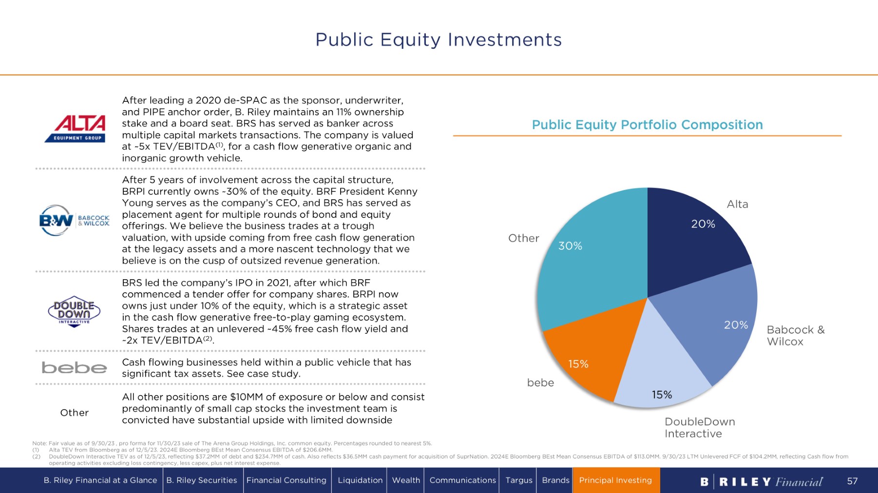 Public Equity Portfolio Composition 2 0% 2 0% 1 5% 1 5% 3 0% A l ta Babcock & Wilcox D o u b l eD o w n Interactive bebe O t h e r After 5 years of involvement across the capital structure, BRPI currently owns ~30% of the equity. BRF President Kenny Young serves as the company’s CEO, and BRS has served as placement agent for multiple rounds of bond and equity offerings. We believe the business trades at a trough valuation, with upside coming from free cash flow generation at the legacy assets and a more nascent technology that we believe is on the cusp of outsized revenue generation. BRS led the company’s IPO in 2021, after which BRF commenced a tender offer for company shares. BRPI now owns just under 10% of the equity, which is a strategic asset in the cash flow generative free - to - play gaming ecosystem. Shares trades at an unlevered ~45% free cash flow yield and ~2x TEV/EBITDA (2) . After leading a 2020 de - SPAC as the sponsor, underwriter, and PIPE anchor order, B. Riley maintains an 11% ownership stake and a board seat. BRS has served as banker across multiple capital markets transactions. The company is valued at ~5x TEV/EBITDA (1) , for a cash flow generative organic and inorganic growth vehicle. Cash flowing businesses held within a public vehicle that has significant tax assets. See case study. All other positions are $10MM of exposure or below and consist predominantly of small cap stocks the investment team is convicted have substantial upside with limited downside O t h er Note: Fair value as of 9/30/23 , pro forma for 11/30/23 sale of The Arena Group Holdings, Inc. common equity. Percentages rounded to nearest 5%. (1) Alta TEV from Bloomberg as of 12/5/23. 2024E Bloomberg BEst Mean Consensus EBITDA of $206.6MM. (2) DoubleDown Interactive TEV as of 12/5/23, reflecting $37.2MM of debt and $234.7MM of cash. Also reflects $36.5MM cash payment for acquisition of SuprNation. 2024E Bloomberg BEst Mean Consensus EBITDA of $113.0MM. 9/30/23 LTM Unlevered FCF of $104.2MM, reflecting Cash flow from operating activities excluding loss contingency, less capex, plus net interest expense. Public Equity Investments B. Riley Financial at a Glance B. Riley Securities Financial Consulting Liquidation Wealth Communications Targus Brands Principal Investing 57