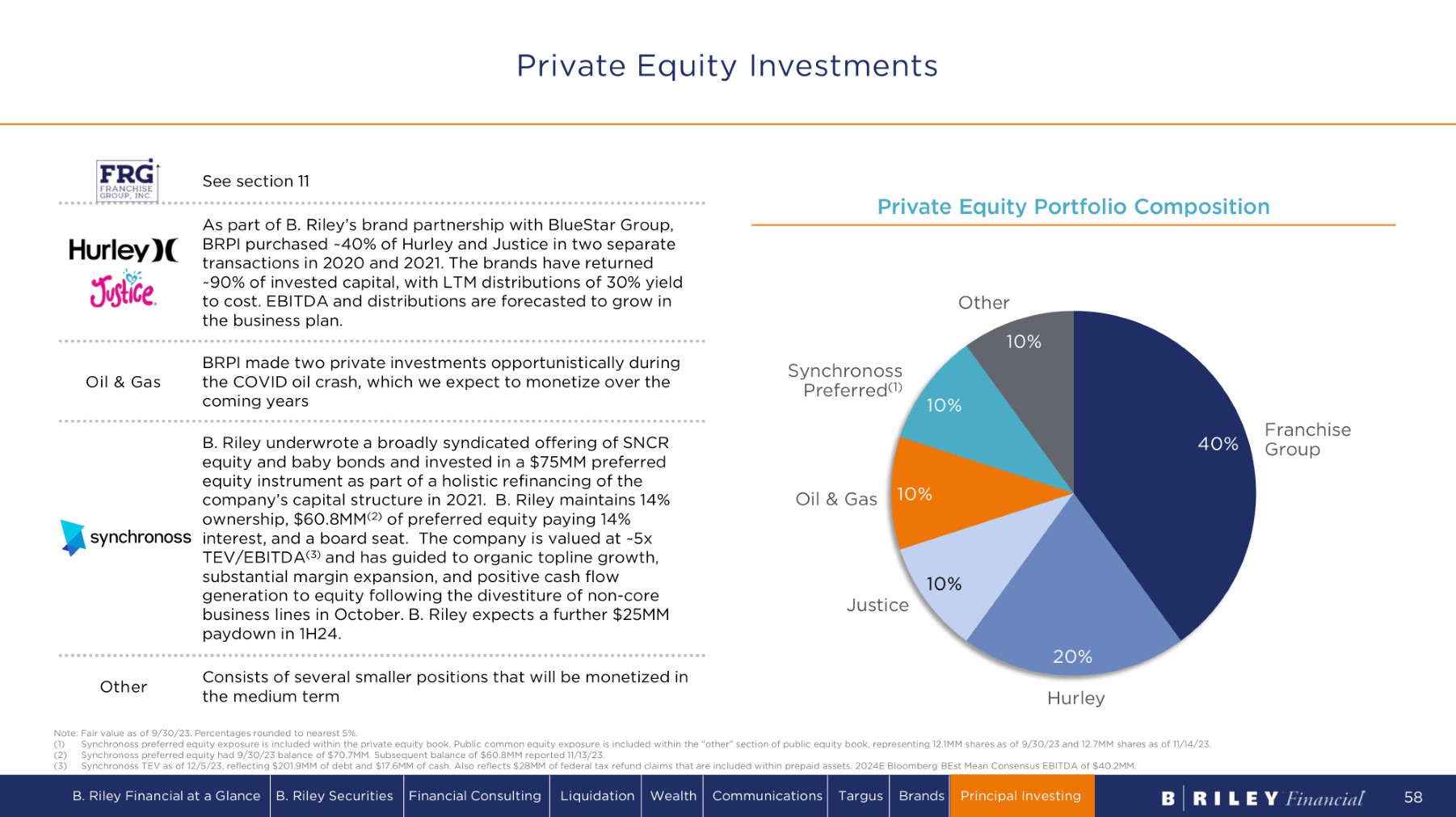 Private Equity Portfolio Composition As part of B . Riley’s brand partnership with BlueStar Group, BRPI purchased ~ 40 % of Hurley and Justice in two separate transactions in 2020 and 2021 . The brands have returned ~90% of invested capital, with LTM distributions of 30% yield to cost. EBITDA and distributions are forecasted to grow in the business plan. BRPI made two private investments opportunistically during the COVID oil crash, which we expect to monetize over the coming years See section 11 B. Riley underwrote a broadly syndicated offering of SNCR equity and baby bonds and invested in a $75MM preferred equity instrument as part of a holistic refinancing of the company’s capital structure in 2021. B. Riley maintains 14% ownership, $60.8MM (2) of preferred equity paying 14% interest, and a board seat. The company is valued at ~5x TEV/EBITDA (3) and has guided to organic topline growth, substantial margin expansion, and positive cash flow generation to equity following the divestiture of non - core business lines in October. B. Riley expects a further $25MM paydown in 1H24. Note: Fair value as of 9/30/23. Percentages rounded to nearest 5%. Synchronoss preferred equity exposure is included within the private equity book. Public common equity exposure is included within the “other” section of public equity book, representing 12.1MM shares as of 9/30/23 and 12.7MM shares as of 11/14/23. (1) (2) Synchronoss preferred equity had 9/30/23 balance of $70.7MM. Subsequent balance of $60.8MM reported 11/13/23. (3) Synchronoss TEV as of 12/5/23, reflecting $201.9MM of debt and $17.6MM of cash. Also reflects $28MM of federal tax refund claims that are included within prepaid assets. 2024E Bloomberg BEst Mean Consensus EBITDA of $40.2MM. Consists of several smaller positions that will be monetized in the medium term O t h er Oil & Gas 4 0% 2 0% 1 0% 1 0% 1 0% 1 0% F ra n c h i s e Group H u r l ey J u s t i c e Oil & Gas S y n c h r ono s s P r e f e r r e d ( 1 ) O t h e r Private Equity Investments B. Riley Financial at a Glance B. Riley Securities Financial Consulting Liquidation Wealth Communications Targus Brands Principal Investing 58
