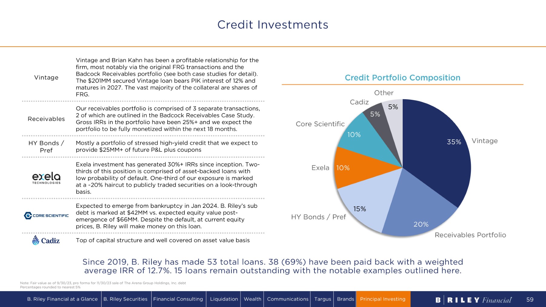 Credit Portfolio Composition 35 % 2 0% 1 5% 1 0% 5% 5% V i n t a ge HY Bonds / Pref E x e l a 1 0% Core Scientific C a di z Receivables Portfolio O t h e r Mostly a portfolio of stressed high - yield credit that we expect to provide $25MM+ of future P&L plus coupons Exela investment has generated 30%+ IRRs since inception. Two - thirds of this position is comprised of asset - backed loans with low probability of default. One - third of our exposure is marked at a ~20% haircut to publicly traded securities on a look - through basis. Vintage and Brian Kahn has been a profitable relationship for the firm, most notably via the original FRG transactions and the Badcock Receivables portfolio (see both case studies for detail). The $201MM secured Vintage loan bears PIK interest of 12% and matures in 2027. The vast majority of the collateral are shares of FRG. Expected to emerge from bankruptcy in Jan 2024. B. Riley’s sub debt is marked at $42MM vs. expected equity value post - emergence of $66MM. Despite the default, at current equity prices, B. Riley will make money on this loan. Our receivables portfolio is comprised of 3 separate transactions, 2 of which are outlined in the Badcock Receivables Case Study. Gross IRRs in the portfolio have been 25%+ and we expect the portfolio to be fully monetized within the next 18 months. Receivables V i n t a g e HY Bonds / Pref Since 2019, B. Riley has made 53 total loans. 38 (69%) have been paid back with a weighted average IRR of 12.7%. 15 loans remain outstanding with the notable examples outlined here. Note: Fair value as of 9/30/23, pro forma for 11/30/23 sale of The Arena Group Holdings, Inc. debt Top of capital structure and well covered on asset value basis Credit Investments Percentages rounded to nearest 5% B. Riley Financial at a Glance B. Riley Securities Financial Consulting Liquidation Wealth Communications Targus Brands Principal Investing 59
