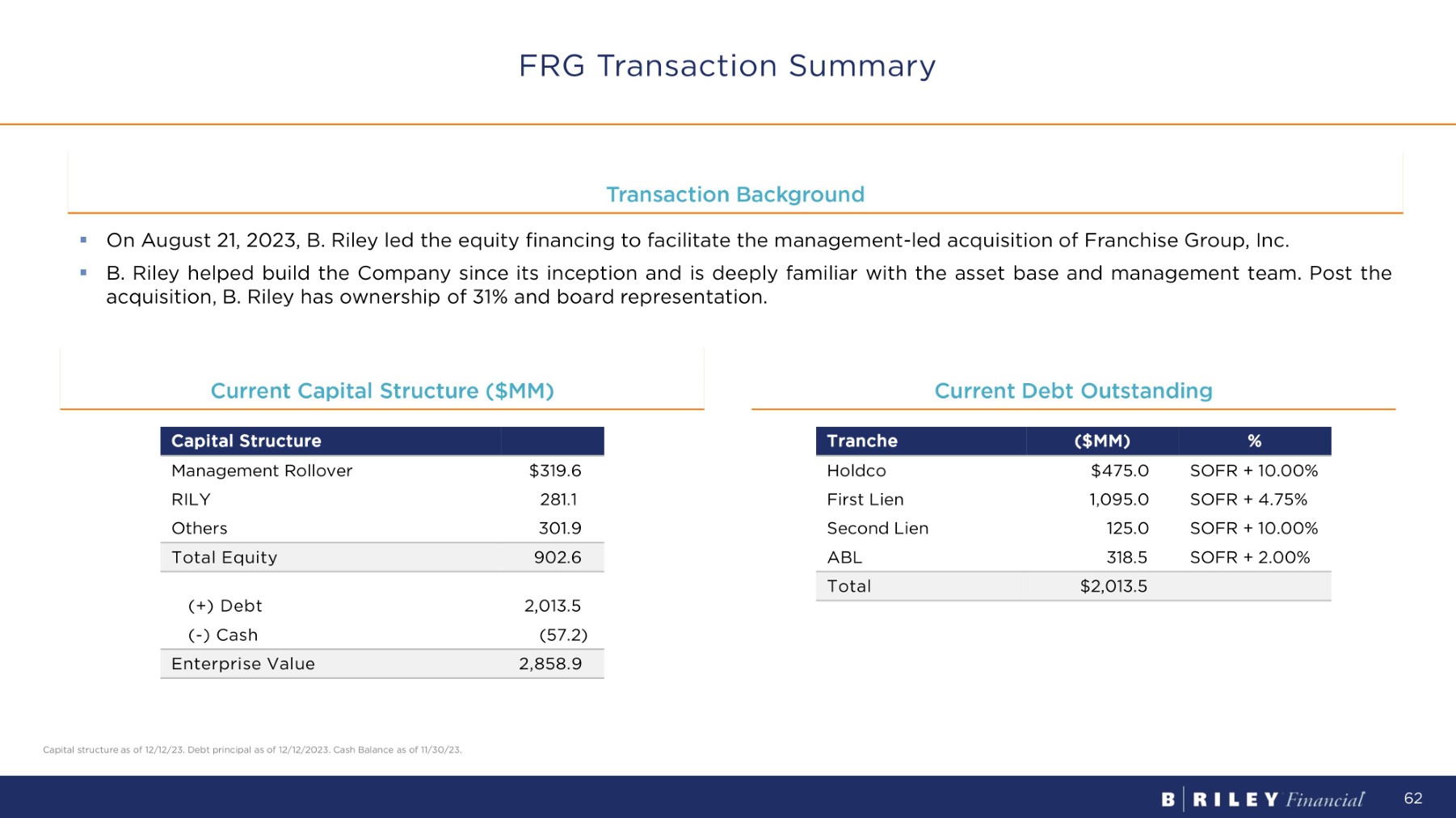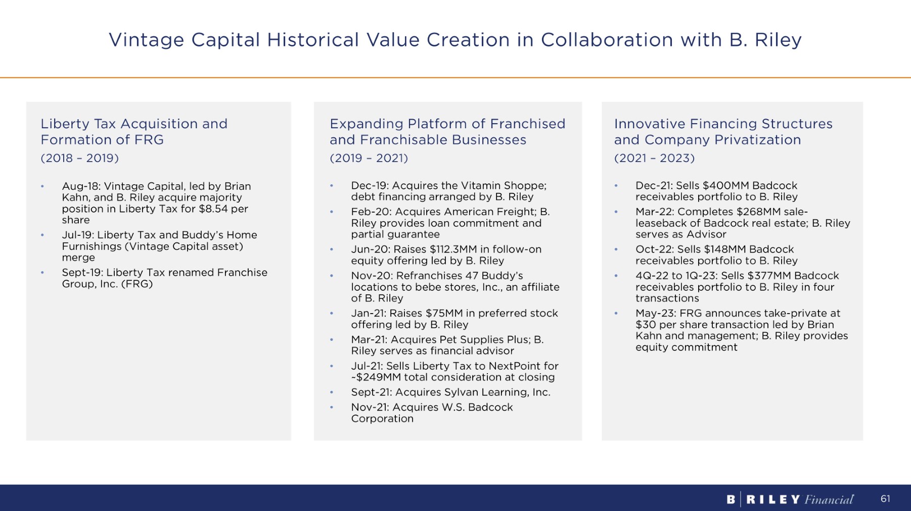 Vintage Capital Historical Value Creation in Collaboration with B. Riley Liberty Tax Acquisition and Formation of FRG (2018 – 2019) • Aug - 18: Vintage Capital, led by Brian Kahn, and B. Riley acquire majority position in Liberty Tax for $8.54 per share • Jul - 19: Liberty Tax and Buddy’s Home Furnishings (Vintage Capital asset) merge • Sept - 19: Liberty Tax renamed Franchise Group, Inc. (FRG) Innovative Financing Structures and Company Privatization (2021 – 2023) • Dec - 21: Sells $400MM Badcock receivables portfolio to B. Riley • Mar - 22: Completes $268MM sale - leaseback of Badcock real estate; B. Riley serves as Advisor • Oct - 22: Sells $148MM Badcock receivables portfolio to B. Riley • 4Q - 22 to 1Q - 23: Sells $377MM Badcock receivables portfolio to B. Riley in four transactions • May - 23: FRG announces take - private at $30 per share transaction led by Brian Kahn and management; B. Riley provides equity commitment Expanding Platform of Franchised and Franchisable Businesses (2019 – 2021) • Dec - 19: Acquires the Vitamin Shoppe; debt financing arranged by B. Riley • Feb - 20: Acquires American Freight; B. Riley provides loan commitment and partial guarantee • Jun - 20: Raises $112.3MM in follow - on equity offering led by B. Riley • Nov - 20: Refranchises 47 Buddy’s locations to bebe stores, Inc., an affiliate of B. Riley • Jan - 21: Raises $75MM in preferred stock offering led by B. Riley • Mar - 21: Acquires Pet Supplies Plus; B. Riley serves as financial advisor • Jul - 21: Sells Liberty Tax to NextPoint for ~$249MM total consideration at closing • Sept - 21: Acquires Sylvan Learning, Inc. • Nov - 21: Acquires W.S. Badcock Corporation 61