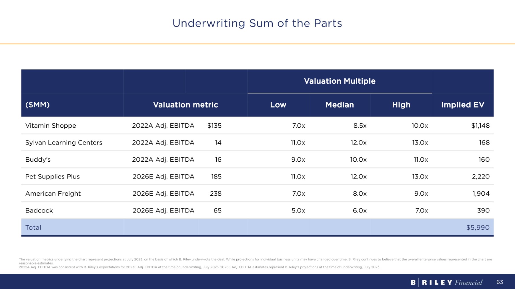 Underwriting Sum of the Parts Valuation Multiple Implied EV High Median Low Valuation metric ($MM) $1,148 10.0x 8.5x 7.0x $135 2022A Adj. EBITDA Vitamin Shoppe 168 13.0x 12.0x 11.0x 14 2022A Adj. EBITDA Sylvan Learning Centers 160 11.0x 10.0x 9.0x 16 2022A Adj. EBITDA Buddy’s 2,220 13.0x 12.0x 11.0x 185 2026E Adj. EBITDA Pet Supplies Plus 1,904 9.0x 8.0x 7.0x 238 2026E Adj. EBITDA American Freight 390 7.0x 6.0x 5.0x 65 2026E Adj. EBITDA Badcock $5,990 Total 63 The valuation metrics underlying the chart represent projections at July 2023, on the basis of which B. Riley underwrote the deal. While projections for individual business units may have changed over time, B. Riley continues to believe that the overall enterprise values represented in the chart are reasonable estimates. 2022A Adj. EBITDA was consistent with B. Riley’s expectations for 2023E Adj. EBITDA at the time of underwriting, July 2023. 2026E Adj. EBITDA estimates represent B. Riley’s projections at the time of underwriting, July 2023.