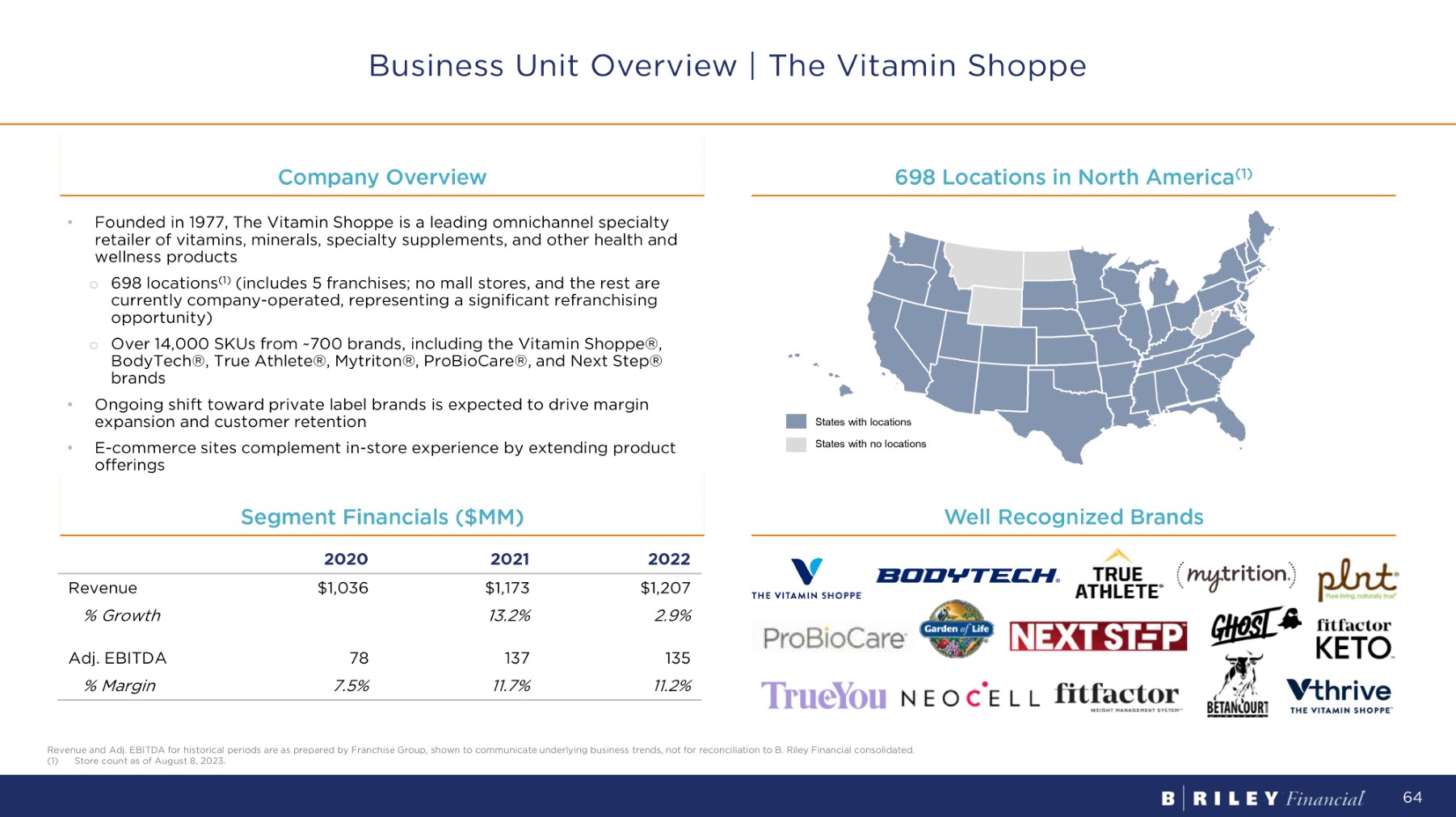 C o m p a n y O v e r v i e w 698 Locations in North America (1) Business Unit Overview | The Vitamin Shoppe 2022 2021 2020 $1,207 $1,173 $1,036 Revenue 2.9% 13.2% % G r o wt h 135 137 78 Adj. EBITDA 11.2% 11.7% 7.5% % M a rg i n Segment Financials ($MM) Well Recognized Brands • Founded in 1977, The Vitamin Shoppe is a leading omnichannel specialty retailer of vitamins, minerals, specialty supplements, and other health and wellness products o 698 locations ( 1 ) (includes 5 franchises ; no mall stores, and the rest are currently company - operated, representing a significant refranchising opportunity) o Over 14 , 000 SKUs from ~ 700 brands, including the Vitamin Shoppe®, BodyTech®, True Athlete®, Mytriton®, ProBioCare®, and Next Step® brands • Ongoing shift toward private label brands is expected to drive margin expansion and customer retention • E - commerce sites complement in - store experience by extending product offerings States with locations States with no locations Revenue and Adj. EBITDA for historical periods are as prepared by Franchise Group, shown to communicate underlying business trends, not for reconciliation to B. Riley Financial consolidated. (1) Store count as of August 8, 2023. 64