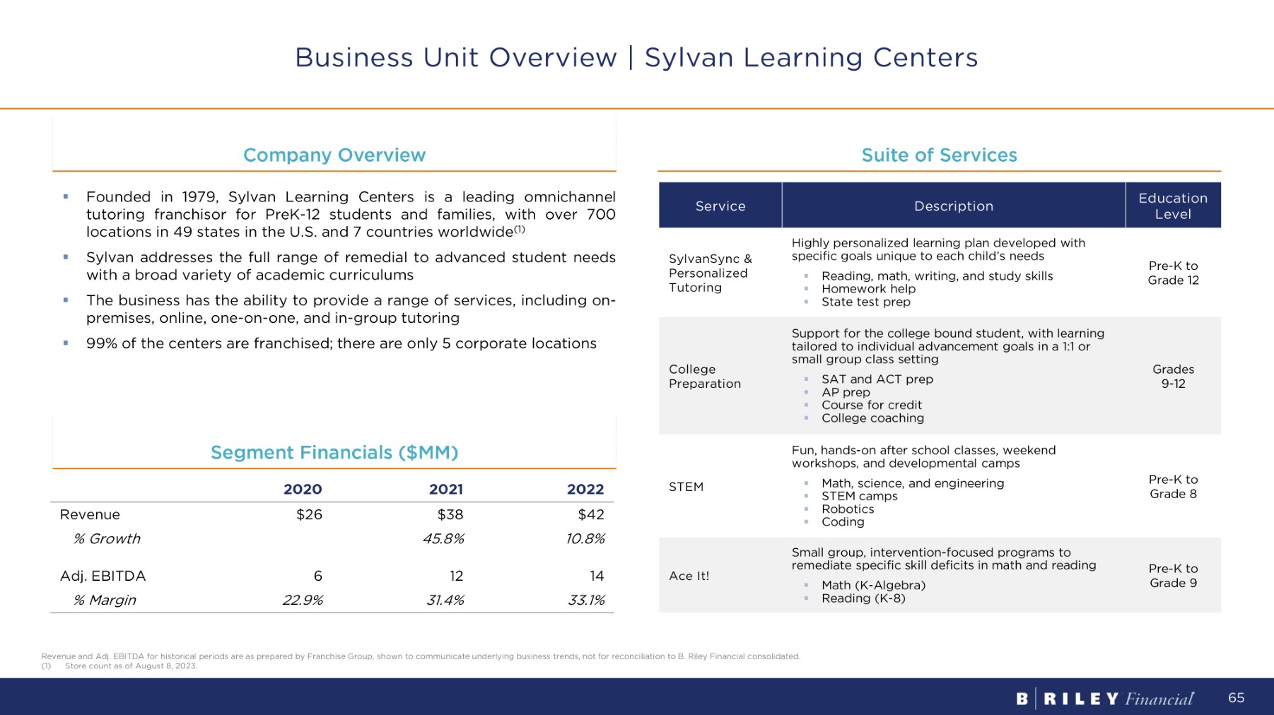 E du c a tio n Level Description Service Pre - K to Grade 12 Highly personalized learning plan developed with specific goals unique to each child’s needs ▪ Reading, math, writing, and study skills ▪ Homework help ▪ State test prep SylvanSync & Personalized Tutoring G r a d es 9 - 12 Support for the college bound student, with learning t a il o re d t o i n di v id u a l a d v a n c emen t g oa ls in a 1 : 1 or small group class setting ▪ SAT and ACT prep ▪ AP prep ▪ Course for credit ▪ College coaching College P re p ara t i on Pre - K to Grade 8 Fun, hands - on after school classes, weekend workshops, and developmental camps ▪ Math, science, and engineering ▪ STEM camps ▪ Robotics ▪ Coding STEM Pre - K to Grade 9 Small group, intervention - focused programs to remediate specific skill deficits in math and reading ▪ Math (K - Algebra) ▪ Reading (K - 8) Ace It! Suite of Services Business Unit Overview | Sylvan Learning Centers 2022 2021 2020 $42 $38 $26 Revenue 10.8% 45.8% % G r o wt h 14 12 6 Adj. EBITDA 33.1% 31.4% 22.9% % M a rg i n Segment Financials ($MM) Company Overview Revenue and Adj. EBITDA for historical periods are as prepared by Franchise Group, shown to communicate underlying business trends, not for reconciliation to B. Riley Financial consolidated. (1) Store count as of August 8, 2023. 65 ▪ Founded in 1979 , Sylvan Learning Centers is a leading omnichannel tutoring franchisor for PreK - 12 students and families, with over 700 locations in 49 states in the U . S . and 7 countries worldwide ( 1 ) ▪ Sylvan addresses the full range of remedial to advanced student needs with a broad variety of academic curriculums ▪ The business has the ability to provide a range of services, including on - premises, online, one - on - one, and in - group tutoring ▪ 99 % of the centers are franchised ; there are only 5 corporate locations