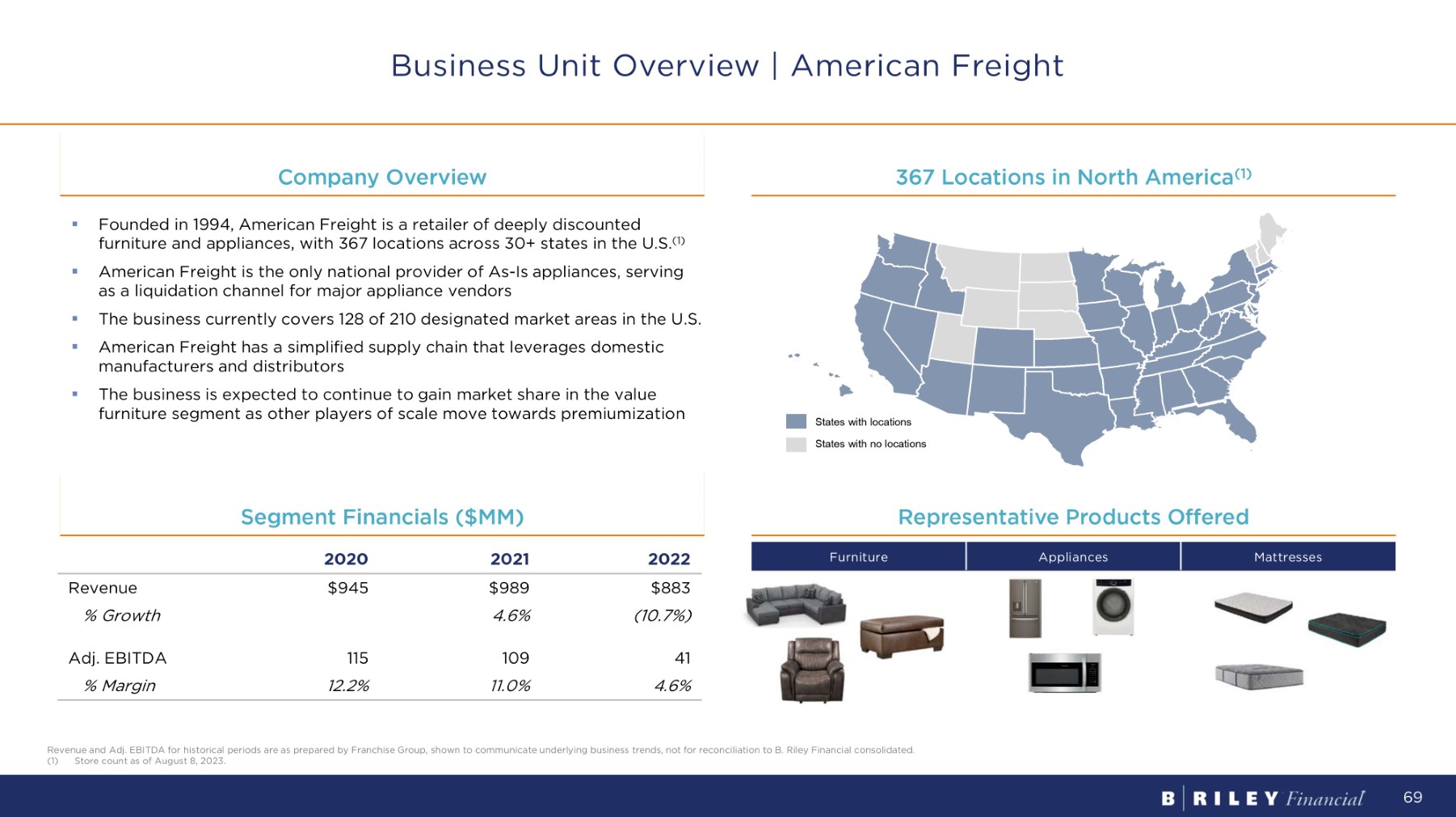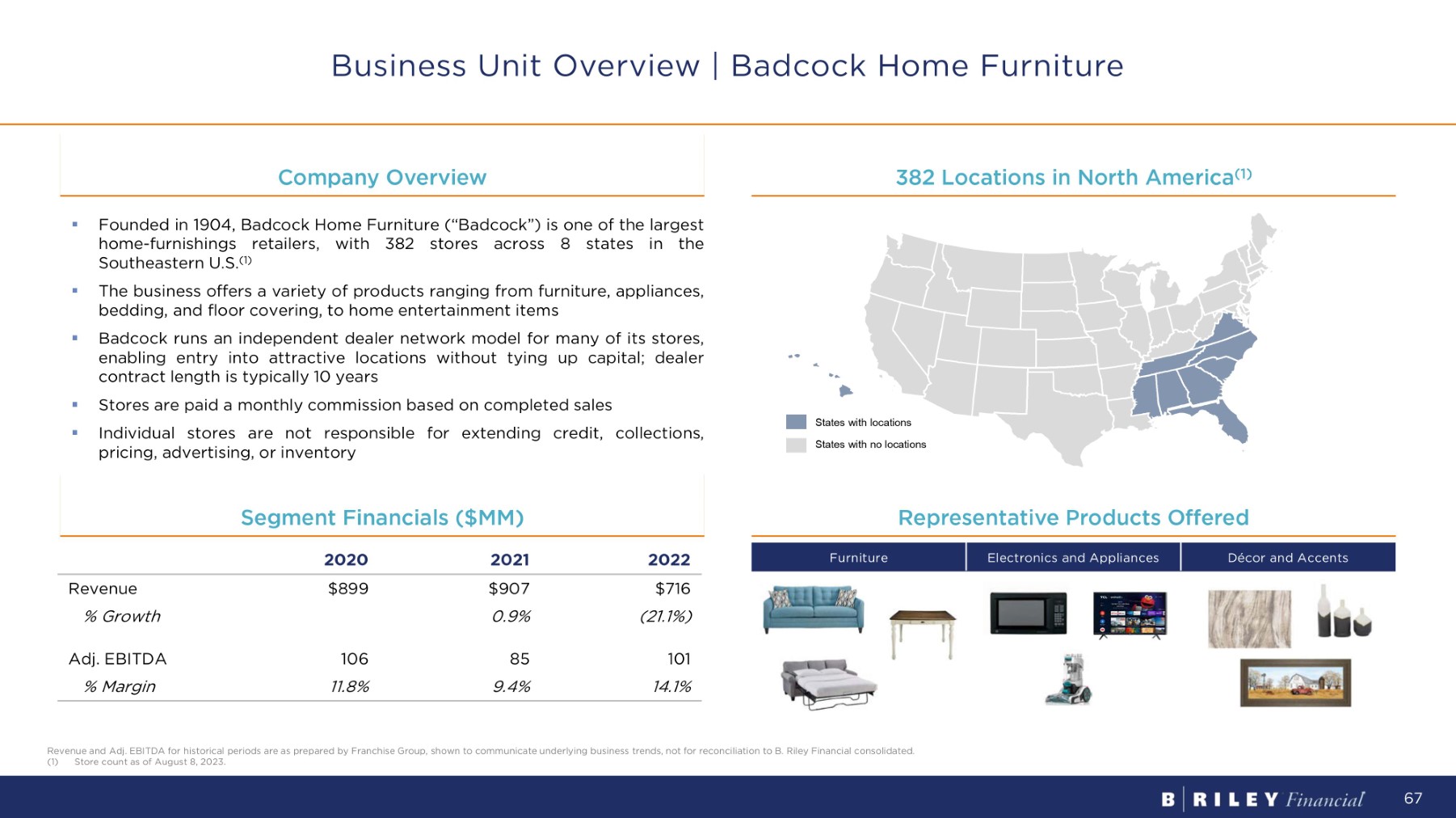 C o m p a n y O v e r v i e w 382 Locations in North America (1) Business Unit Overview | Badcock Home Furniture 2022 2021 2020 $716 $907 $899 Revenue (21.1%) 0.9% % G r o wt h 101 85 106 Adj. EBITDA 14.1% 9.4% 11.8% % M a rg i n S e g m e n t F i n a n c i a l s ( $ MM) Décor and Accents Electronics and Appliances Furniture Representative Products Offered ▪ Founded in 1904 , Badcock Home Furniture (“Badcock”) is one of the largest home - furnishings retailers, with 382 stores across 8 states in the Southeastern U . S . ( 1 ) ▪ The business offers a variety of products ranging from furniture, appliances, bedding, and floor covering, to home entertainment items ▪ Badcock runs an independent dealer network model for many of its stores, enabling entry into attractive locations without tying up capital ; dealer contract length is typically 10 years ▪ Stores are paid a monthly commission based on completed sales ▪ Individual stores are not responsible for extending credit, collections, pricing, advertising, or inventory States with locations States with no locations Revenue and Adj. EBITDA for historical periods are as prepared by Franchise Group, shown to communicate underlying business trends, not for reconciliation to B. Riley Financial consolidated. (1) Store count as of August 8, 2023. 67