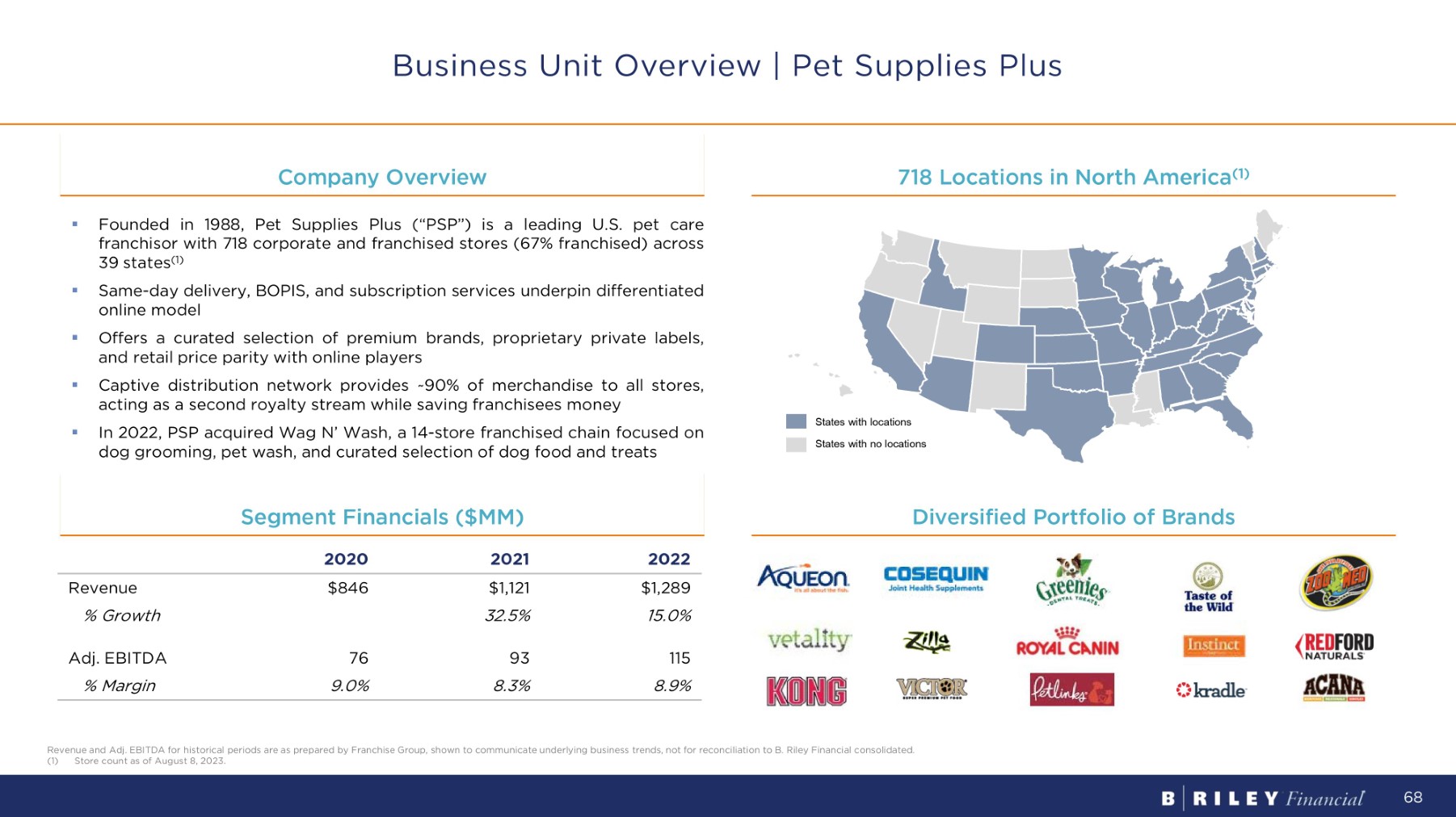 C o m p a n y O v e r v i e w 7 1 8 L oc a t i o n s i n No r t h A m e r i c a ( 1 ) Business Unit Overview | Pet Supplies Plus 2022 2021 2020 $1,289 $1,121 $846 Revenue 15.0% 32.5% % G r o wt h 115 93 76 Adj. EBITDA 8.9% 8.3% 9.0% % M a rg i n Segment Financials ($MM) Diversified Portfolio of Brands ▪ Founded in 1988 , Pet Supplies Plus (“PSP”) is a leading U . S . pet care franchisor with 718 corporate and franchised stores ( 67 % franchised) across 39 states ( 1 ) ▪ Same - day delivery, BOPIS, and subscription services underpin differentiated online model ▪ Offers a curated selection of premium brands, proprietary private labels, and retail price parity with online players ▪ Captive distribution network provides ~ 90 % of merchandise to all stores, acting as a second royalty stream while saving franchisees money ▪ In 2022 , PSP acquired Wag N’ Wash, a 14 - store franchised chain focused on dog grooming, pet wash, and curated selection of dog food and treats States with locations States with no locations Revenue and Adj. EBITDA for historical periods are as prepared by Franchise Group, shown to communicate underlying business trends, not for reconciliation to B. Riley Financial consolidated. (1) Store count as of August 8, 2023. 68