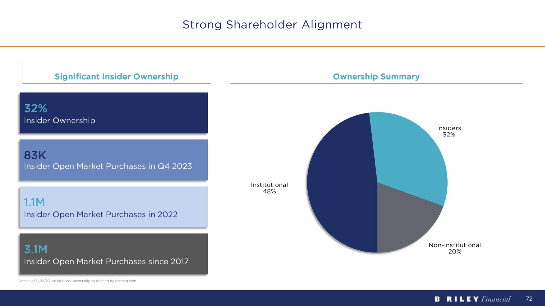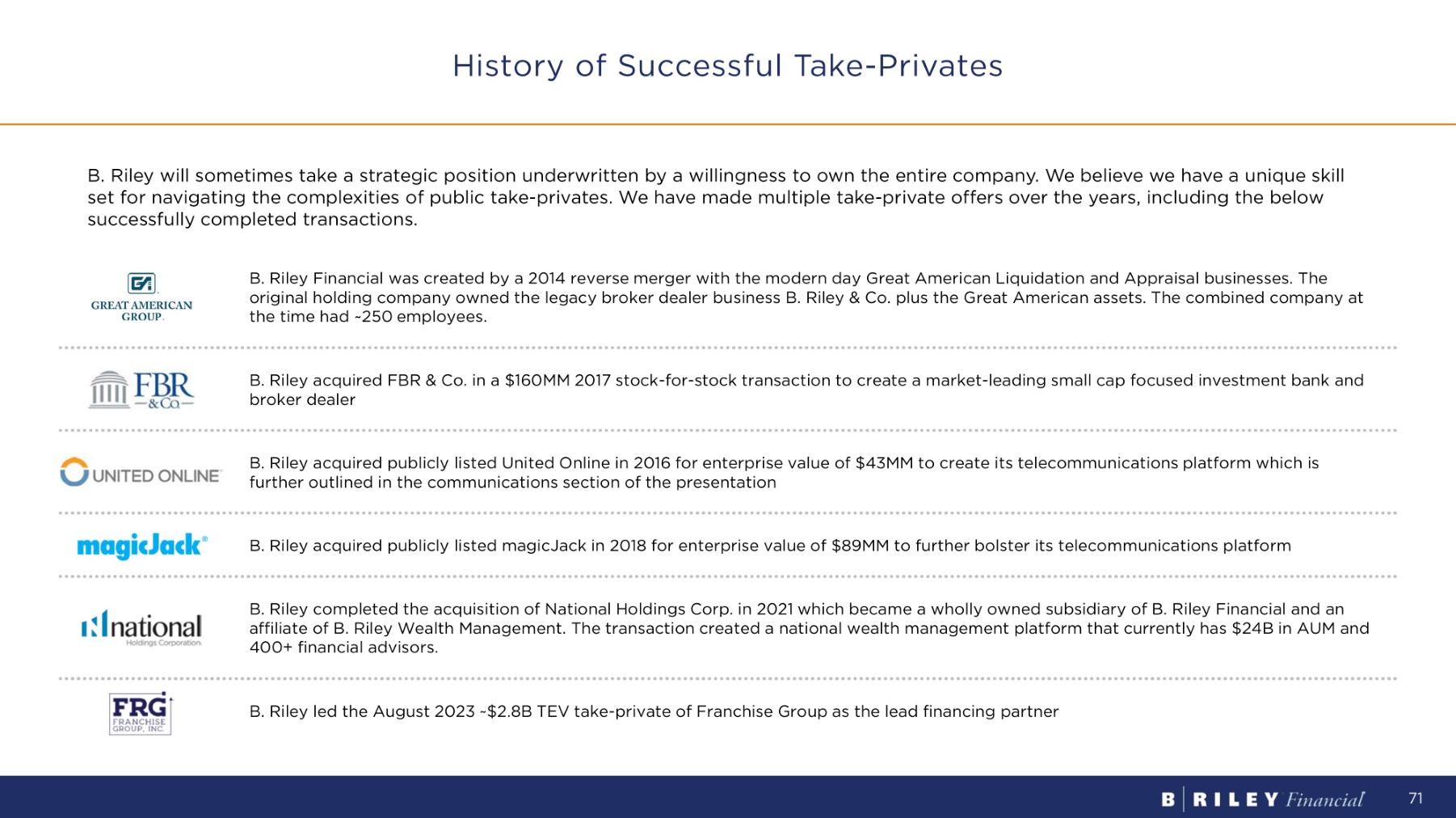 B. Riley will sometimes take a strategic position underwritten by a willingness to own the entire company. We believe we have a unique skill set for navigating the complexities of public take - privates. We have made multiple take - private offers over the years, including the below successfully completed transactions. B. Riley Financial was created by a 2014 reverse merger with the modern day Great American Liquidation and Appraisal businesses. The original holding company owned the legacy broker dealer business B. Riley & Co. plus the Great American assets. The combined company at the time had ~250 employees. B. Riley acquired FBR & Co. in a $160MM 2017 stock - for - stock transaction to create a market - leading small cap focused investment bank and broker dealer B. Riley acquired publicly listed United Online in 2016 for enterprise value of $43MM to create its telecommunications platform which is further outlined in the communications section of the presentation B. Riley acquired publicly listed magicJack in 2018 for enterprise value of $89MM to further bolster its telecommunications platform B. Riley completed the acquisition of National Holdings Corp. in 2021 which became a wholly owned subsidiary of B. Riley Financial and an affiliate of B. Riley Wealth Management. The transaction created a national wealth management platform that currently has $24B in AUM and 400+ financial advisors. B. Riley led the August 2023 ~$2.8B TEV take - private of Franchise Group as the lead financing partner History of Successful Take - Privates 71