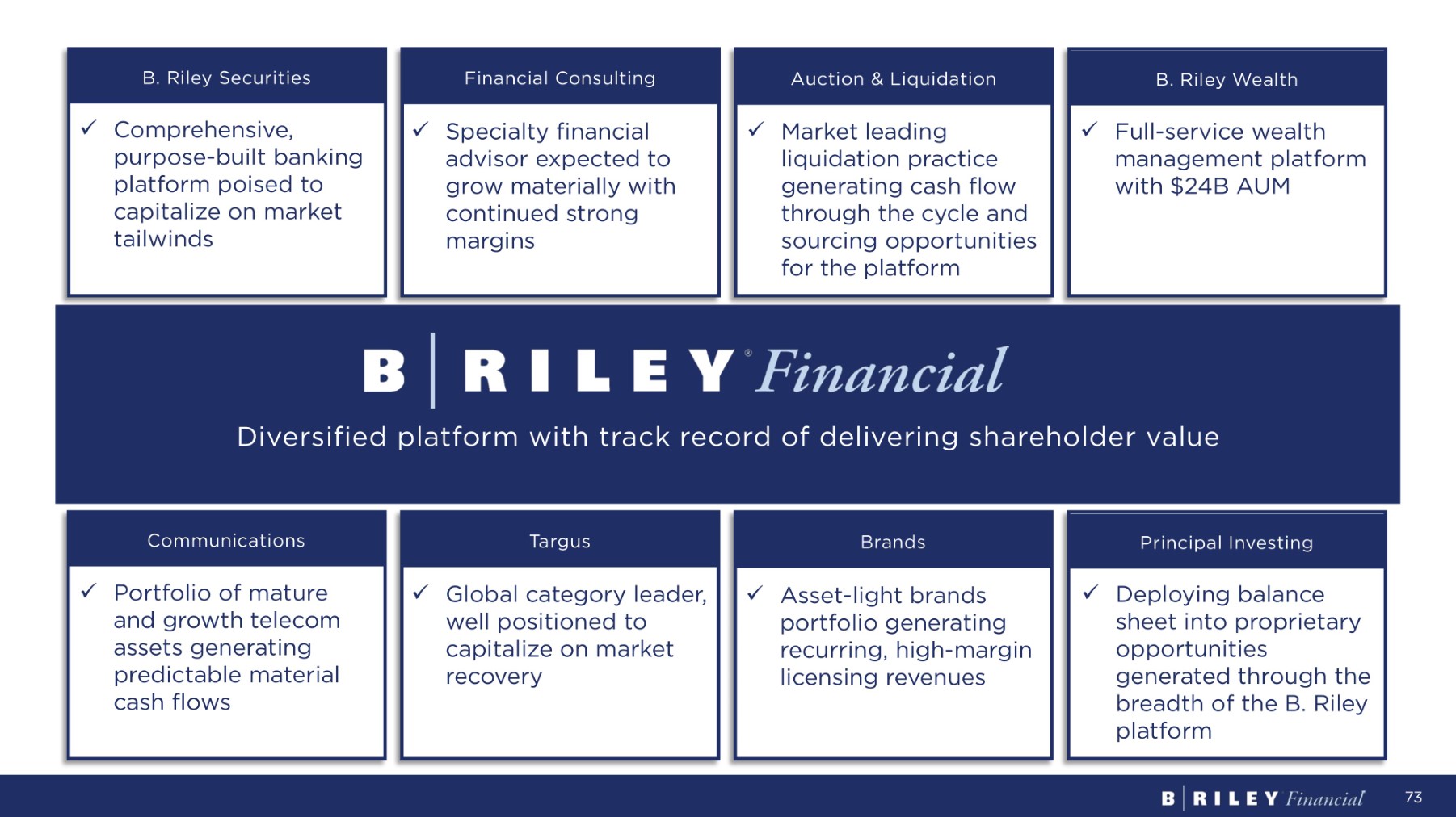 B. Riley Securities 73 Financial Consulting Auction & Liquidation B. Riley Wealth Communications Targus Brands Principal Investing Diversified platform with track record of delivering shareholder value x Comprehensive, purpose - built banking platform poised to capitalize on market tailwinds x Specialty financial advisor expected to grow materially with continued strong margins x Full - service wealth management platform with $24B AUM x Portfolio of mature and growth telecom assets generating predictable material cash flows x Market leading liquidation practice generating cash flow through the cycle and sourcing opportunities for the platform x Deploying balance sheet into proprietary opportunities generated through the breadth of the B. Riley platform x Asset - light brands portfolio generating recurring, high - margin licensing revenues x Global category leader, well positioned to capitalize on market recovery