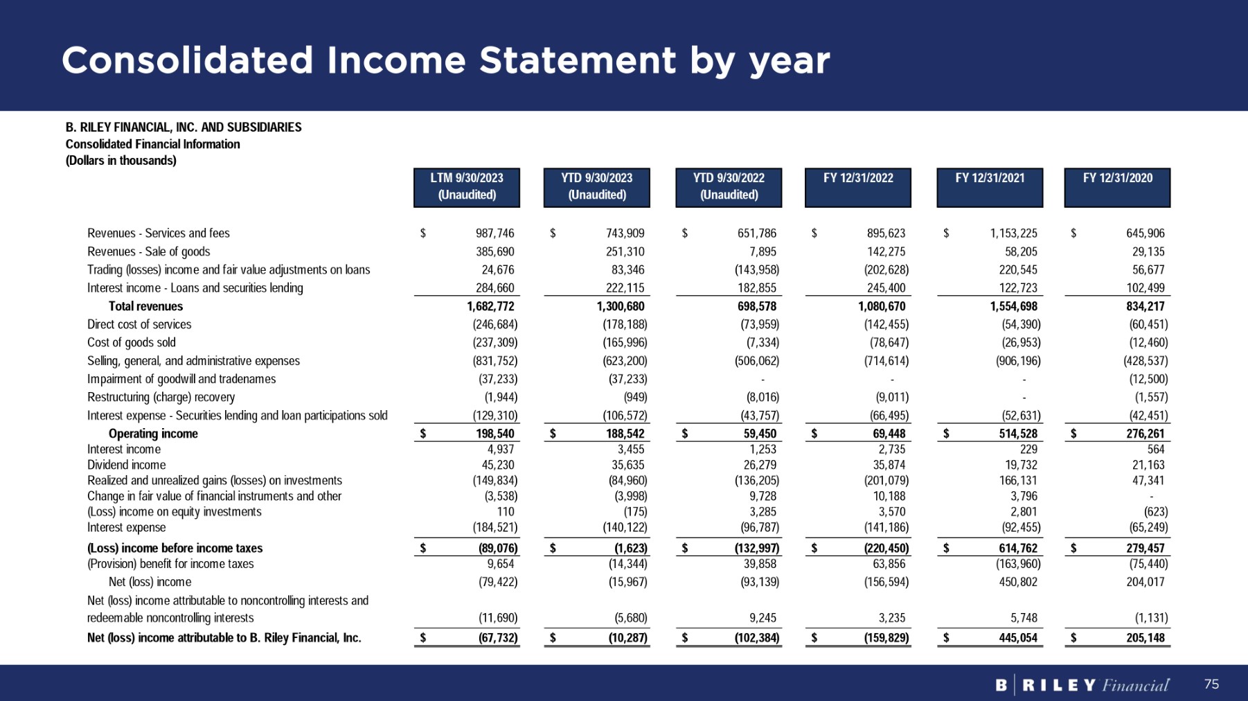 Consolidated Income Statement by year B. RILEY FINANCIAL, INC. AND SUBSIDIARIES C onso li da t e d F i nanc i a l I n f o r m a t i on ( D o ll a r s i n t hou s ands ) LT M 9 / 30 / 2023 (Unaudited) Y T D 9 / 30 / 2023 (Unaudited) Y T D 9 / 30 / 2022 (Unaudited) F Y 12 / 31 / 2022 F Y 12 / 31 / 2021 F Y 12 / 31 / 2020 R e v enue s - S e r v i ce s an d f ees R e v enue s - S a l e o f goods Trading (losses) income and fair value adjustments on loans Interest income - Loans and securities lending To t a l r evenu es D i r e c t co s t o f se r v i ce s C os t o f good s s o l d Selling, general, and administrative expenses Impairment of goodwill and tradenames Restructuring (charge) recovery Interest expense - Securities lending and loan participations sold O pe r a t i n g i nco m e I n t e r es t i nco m e D i v i den d i nco m e Realized and unrealized gains (losses) on investments C hang e i n f a i r v a l u e o f f i nanc i a l i ns t r u m en t s an d o t her ( Los s ) i nco m e o n equ i t y i n v es t m en t s I n t e r es t expen se ( Loss ) i nco m e be f o r e i nco m e t axes ( P r o v i s i on ) bene f i t f o r i nco m e t axes N e t ( l oss ) i nco m e Net (loss) income attributable to noncontrolling interests and r edee m ab l e non c on t r o l li n g i n t e r es t s Net (loss) income attributable to B. Riley Financial, Inc. 987 , 746 385 , 690 24,676 $ 743 , 909 251 , 310 83,346 $ 651,786 7,895 (143,958) $ 895,623 142,275 ( 202 , 628) $ 1,153,225 58,205 220,545 $ 645 , 906 29,135 56,677 $ 284,660 1,682,772 (246,684) (237,309) (831,752) (37,233) (1,944) (129,310) $ 198,540 4,937 45,230 (149,834) (3,538) 110 (184,521) 222,115 1,300,680 (178,188) (165,996) (623,200) (37,233) (949) (106,572) $ 188,542 3,455 35,635 (84,960) (3,998) (175) (140,122) 182,855 698,578 (73,959) (7,334) (506,062) 245,400 1,080,670 (142,455) (78,647) (714,614) 122,723 1,554,698 (54,390) (26,953) (906,196) 102,499 834,217 (60,451) (12,460) (428,537) (12,500) (1,557) ( 42 , 451) $ 276,261 564 21,163 47,341 - - - - (8,016) ( 43 , 757) $ 59,450 1,253 26,279 (136,205) 9,728 3,285 (96,787) (9,011) ( 66 , 495) $ 69,448 2,735 35,874 (201,079) 10,188 3,570 (141,186) ( 52 , 631) $ 514,528 229 19,732 166,131 3,796 2,801 (92,455) - (623) ( 65 , 249) $ (89,076) 9,654 (79,422) $ ( 1 , 623) (14,344) (15,967) $ (132,997) 39,858 (93,139) $ (220,450) 63,856 (156,594) $ 614,762 (163,960) 450,802 $ 279,457 (75,440) 204,017 (11,690) ( 5 , 680) 9 , 245 3 , 235 5 , 748 ( 1 , 131) $ (67,732) $ (10,287) $ (102,384) $ (159,829) $ 445,054 $ 205,148 75
