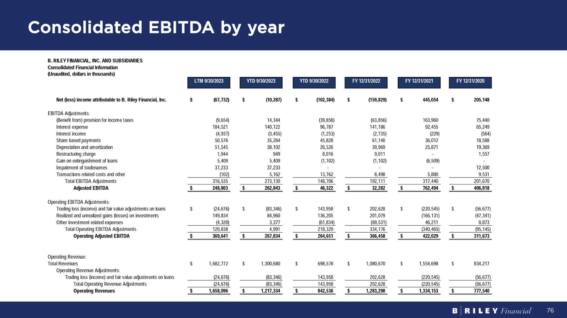 Consolidated EBITDA by year 76 B . R I LEY F I N A NC I A L , I NC . A N D S UB S I D I A R IES Consolidated Financial Information (Unaudited, dollars in thousands) LT M 9 / 30 / 2023 Y T D 9 / 30 / 2023 Y T D 9 / 30 / 2022 FY 12 / 31 / 2022 FY 12 / 31 / 2021 FY 12 / 31 / 2020 Net (loss) income attributable to B. Riley Financial, Inc. $ (67,732) $ (10,287) $ (102,384) $ (159,829) $ 445,054 $ 205,148 EB I T D A A d j us t m en t s : 75,440 163,960 (63,856) (39,858) 14,344 (9,654) (Benefit from) provision for income taxes 65,249 92,455 141,186 96,787 140,122 184,521 I n t e r es t expens e (564) (229) (2,735) (1,253) (3,455) (4,937) I n t e r es t i nco m e 18,588 36,012 61,140 45,828 35,264 50,576 S ha r e base d pa y m en t s 19,369 25,871 39,969 26,526 38,102 51,545 D ep r ec i a t i o n an d a m o r t i za t i on 1,557 - 9,011 8,016 949 1,944 R es t r uc t u r i n g cha r ge - (6,509) (1,102) (1,102) 5,409 5,409 G a i n o n ex t i ngu i sh m en t o f l oans 12,500 - - - 37,233 37,233 I m pa i r m en t o f t r adena m es 9,531 5,880 8,498 13,762 5,162 (102) T r ansac t i on s r e l a t e d cos t s an d o t her 201,670 317,440 192,111 148,706 273,130 316,535 T o t a l EB I T D A A d j us t m en t s $ 406,818 $ 762,494 $ 32,282 $ 46,322 $ 262,843 $ 248,803 A d j u s t e d E B I T D A $ (56,677) $ (220,545) $ 202,628 $ 143,958 $ (83,346) $ (24,676) O pe r a t i n g EB I T D A A d j us t m en t s : Trading loss (income) and fair value adjustments on loans (47,341) (166,131) 201,079 136,205 84,960 149,834 Realized and unrealized gains (losses) on investments 8,873 46,211 (69,531) (61,834) 3,377 (4,320) O t he r i n v es t m en t r e l a t e d expenses (95,145) (340,465) 334,176 218,329 4,991 120,838 T o t a l O pe r a t i n g EB I T D A A d j us t m en t s $ 311,673 $ 422,029 $ 366,458 $ 264,651 $ 267,834 $ 369,641 O p e r a ti n g A d j u s t e d E B I T D A O pe r a t i n g R e v enue: T o t a l R e v enues O pe r a t i n g R e v enu e A d j us t m en t s : 1,682,772 $ 1,300,680 $ 698,578 $ 1,080,670 $ 1,554,698 $ 834,217 $ (56,677) (220,545) 202,628 143,958 (83,346) (24,676) Trading loss (income) and fair value adjustments on loans (56,677) (220,545) 202,628 143,958 (83,346) (24,676) T o t a l O pe r a t i n g R e v enu e A d j us t m en t s $ 777,540 $ 1,334,153 $ 1,283,298 $ 842,536 $ 1,217,334 $ 1,658,096 O p e r a ti n g R eve nu es