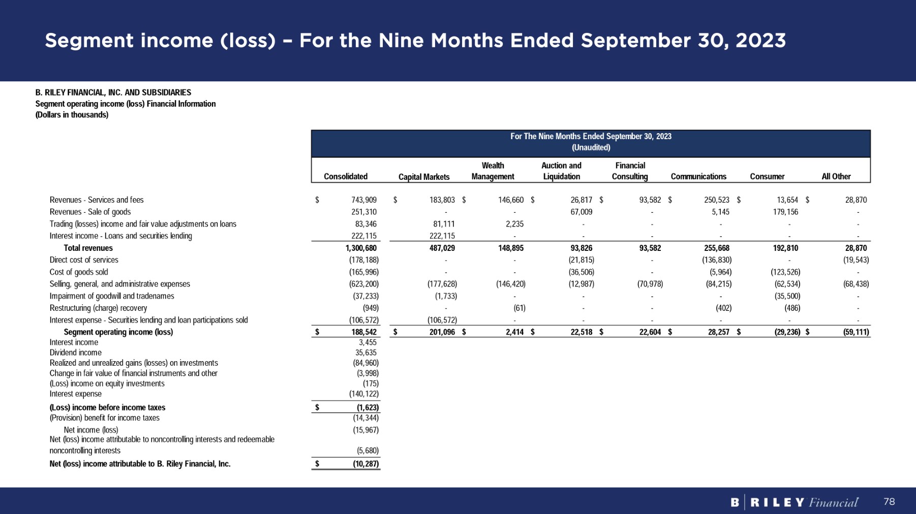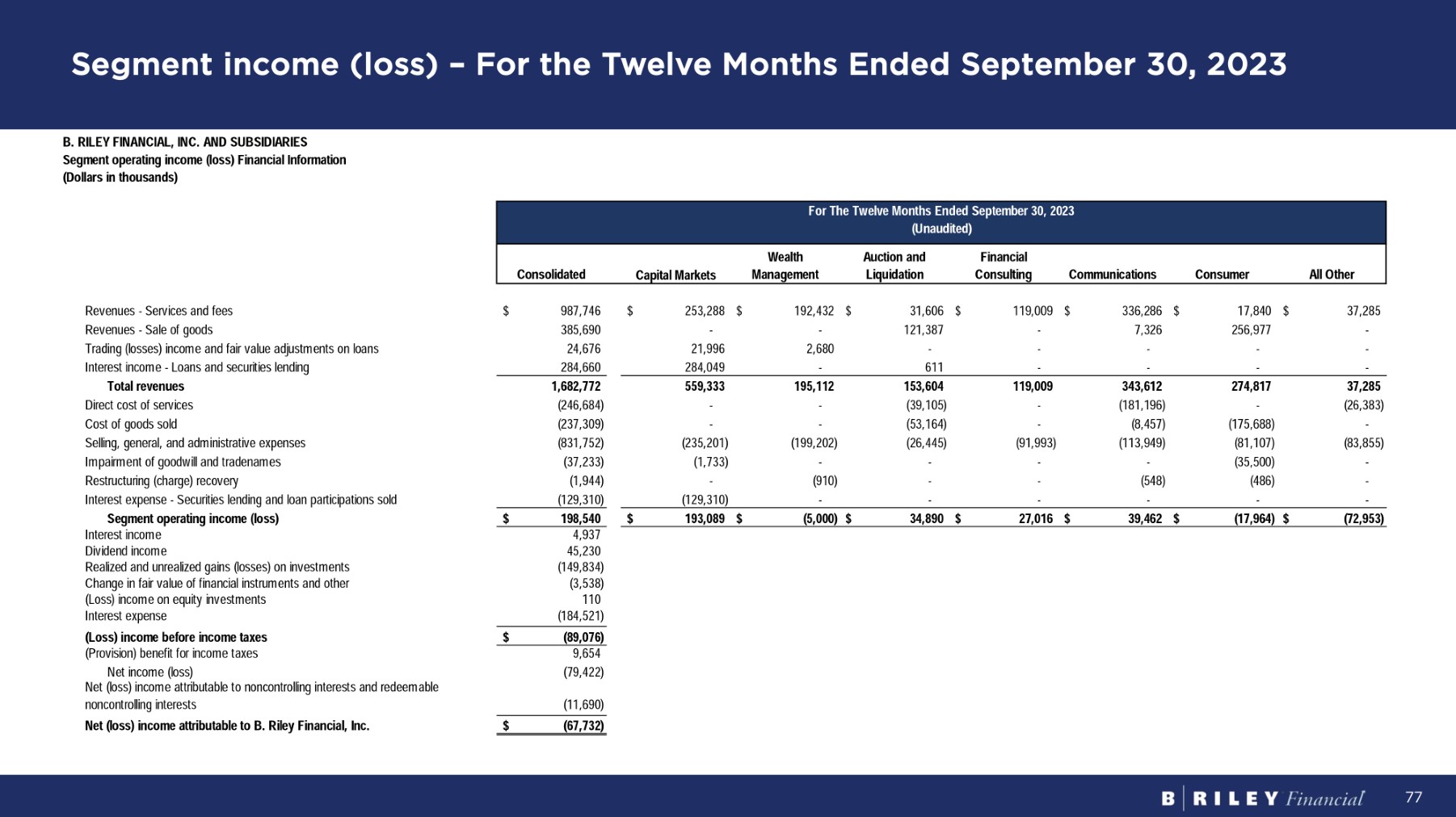 Segment income (loss) – For the Twelve Months Ended September 30, 2023 77 Fo r Th e T w e l v e M on t h s E nd e d S e p t e m b e r 30 , 2023 (Unaudited) A l l O t h e r Consumer Communications Financial C on s u lti ng A u c ti o n a nd Liquidation Wealth M a n a g e m e n t C a p it a l M a r ke t s Consolidated B . R I L EY F I N A NC I A L , I NC . A N D SUBS I D I A R IES Segment operating income (loss) Financial Information ( D o ll a rs i n t housands ) $ 37,285 $ 17,840 $ 336,286 $ 119,009 $ 31,606 $ 192,432 $ 253,288 $ 987,746 R e v enue s - S e r v i ce s an d f ees - 256,977 7,326 - 121,387 - - 385,690 R e v enue s - S a l e o f goods - - - - - 2,680 21,996 24,676 Trading (losses) income and fair value adjustments on loans 611 - - - - - 284,049 284,660 I n t e r es t i nco m e - Loan s an d secu r i t i e s l end i ng 37,285 274,817 343,612 119,009 153,604 195,112 559,333 1,682,772 To t a l r eve nu es (26,383) - (181,196) - (39,105) - - (246,684) D i r ec t cos t o f se r v i ce s - (175,688) (8,457) - (53,164) - - (237,309) C os t o f good s so l d (83,855) (81,107) (113,949) (91,993) (26,445) (199,202) (235,201) (831,752) S e lli ng , gene r a l , an d ad m i n i s t r a t i v e expenses - (35,500) - - - - (1,733) (37,233) Impairment of goodwill and tradenames - (486) - - (548) (910) - (1,944) R es t r uc t u r i n g ( cha r ge ) r eco v e r y - - - - - - (129,310) (129,310) I n t e r es t expens e - S ecu r i t i e s l end i n g an d l oa n pa r t i c i pa t i on s so l d (72,953) $ (17,964) $ 39,462 $ 27,016 $ 34,890 $ (5,000) $ 193,089 $ $ 198,540 S e g m e n t op e r a ti n g i n c o m e (l o ss ) 4,937 I n t e r es t i nco m e 45,230 D i v i den d i nco m e (149,834) Realized and unrealized gains (losses) on investments (3,538) C hang e i n f a i r v a l u e o f f i nanc i a l i ns t r u m en t s an d o t her 110 ( Loss ) i nco m e o n equ i t y i n v es t m en t s (184,521) I n t e r es t expens e $ ( 89 , 07 6) ( Lo ss ) i n c o m e b e f o r e i n c o m e t axes 9,654 ( P r o v i s i on ) bene f i t f o r i nco m e t axes (79,422) N e t i nco m e ( l oss ) Net (loss) income attributable to noncontrolling interests and redeemable (11,690) noncon t r o lli n g i n t e r es t s $ ( 67 , 73 2) N e t (l o ss ) i n c o m e a tt r i bu t a b l e t o B . R il e y F i n a n c i a l , I n c.