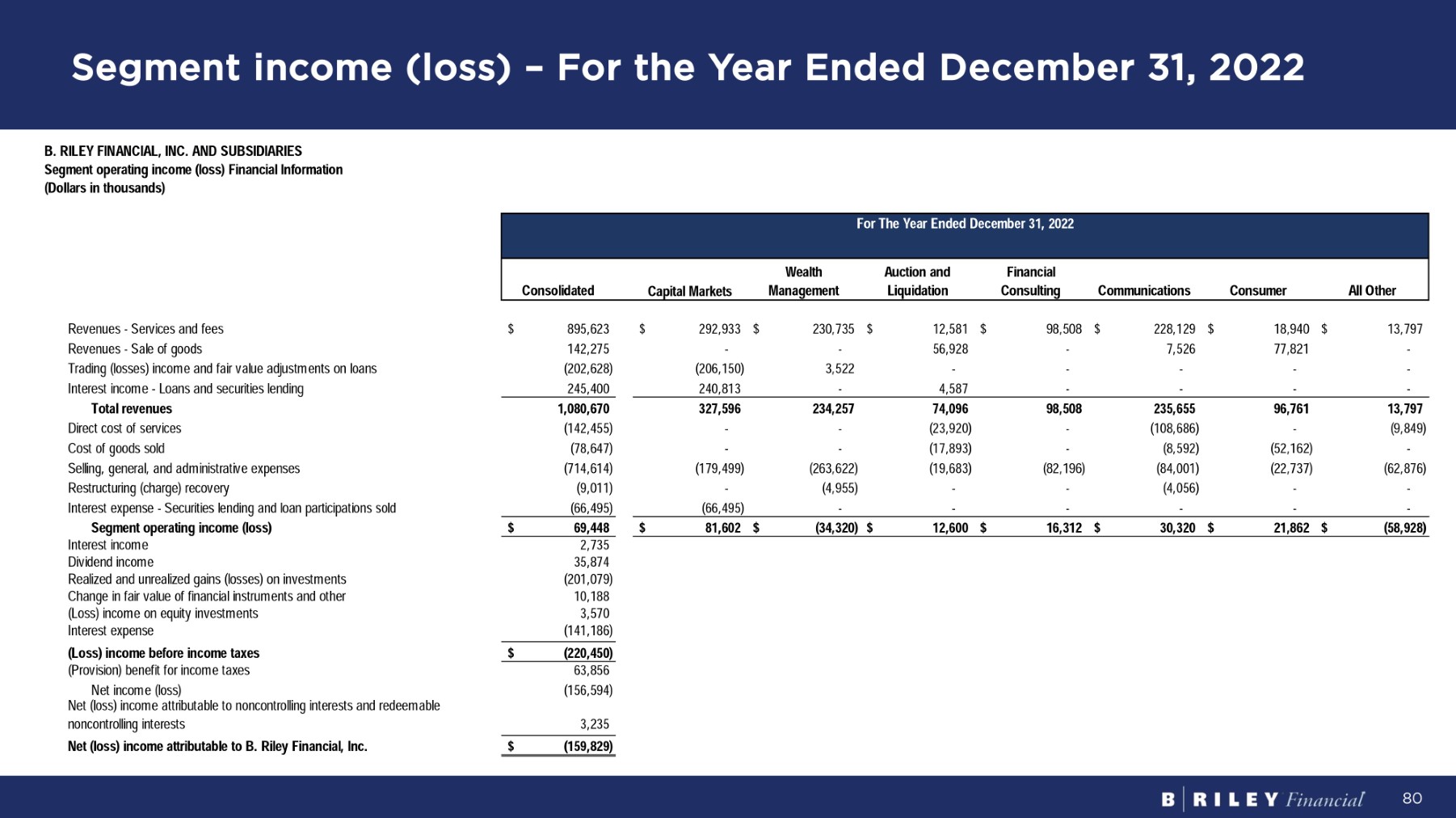 Segment income (loss) – For the Year Ended December 31, 2022 80 Fo r Th e Y ea r E nd e d D ece m b e r 31 , 2022 A l l O t h e r Consumer Communications Financial C on s u l t i ng A u c t i o n a nd Liquidation Wealth M a n a g e m e n t C a p i t a l M a r ke t s Consolidated B . R I LEY F I N A NC I A L , I NC . A N D S UB S I D I A R IES S e g m e n t op e r a ti n g i n c o m e (l o ss ) F i n a n c i a l I n f o r m a ti on ( D o ll a rs i n t hou sa nd s ) $ 13,797 $ 18,940 $ 228,129 $ 98,508 $ 12,581 $ 230,735 $ 292,933 $ 895,623 R e v enue s - S e r v i ce s an d f ees - 77,821 7,526 - 56,928 - - 142,275 R e v enue s - S a l e o f goods - - - - - 3,522 (206,150) (202,628) Trading (losses) income and fair value adjustments on loans - - - - 4,587 - 240,813 245,400 I n t e r es t i nco m e - Loan s an d secu r i t i e s l end i ng 13,797 96,761 235,655 98,508 74,096 234,257 327,596 1,080,670 To t a l r eve nu es (9,849) - (108,686) - (23,920) - - (142,455) D i r ec t cos t o f se r v i ce s - (52,162) (8,592) - (17,893) - - (78,647) C os t o f good s so l d (62,876) (22,737) (84,001) (82,196) (19,683) (263,622) (179,499) (714,614) Selling, general, and administrative expenses - - (4,056) - - (4,955) - (9,011) R es t r uc t u r i n g ( cha r ge ) r eco v e r y - - - - - - (66,495) (66,495) Interest expense - Securities lending and loan participations sold (58,928) $ 21,862 $ 30,320 $ 16,312 $ 12,600 $ (34,320) $ 81,602 $ $ 69,448 S e g m e n t op e r a t i n g i n c o m e ( l o ss ) 2,735 I n t e r es t i nco m e 35,874 D i v i den d i nco m e (201,079) Realized and unrealized gains (losses) on investments 10,188 Change in fair value of financial instruments and other 3,570 ( Loss ) i nco m e o n equ i t y i n v es t m en t s (141,186) I n t e r es t expens e $ ( 220 , 45 0) ( Lo ss ) i n c o m e b e f o r e i n c o m e t axes 63,856 ( P r o v i s i on ) bene f i t f o r i nco m e t axes (156,594) N e t i nco m e ( l oss ) Net (loss) income attributable to noncontrolling interests and redeemable 3,235 noncon t r o lli n g i n t e r es t s $ ( 159 , 82 9) Net (loss) income attributable to B. Riley Financial, Inc.