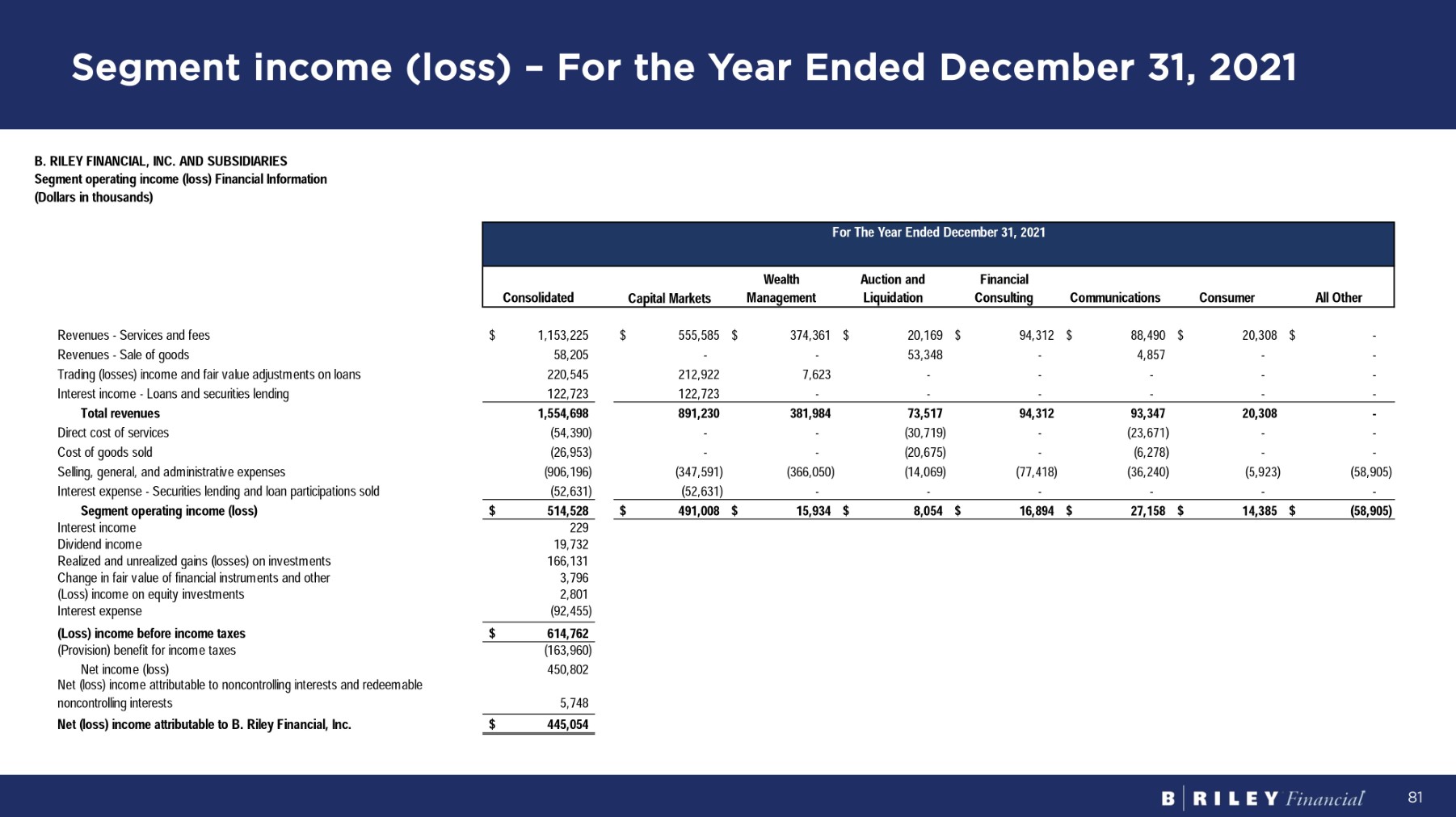 Segment income (loss) – For the Year Ended December 31, 2021 81 Fo r Th e Y ea r E nd e d D ece m b e r 31 , 2021 A l l O t h e r Consumer Communications Financial C on s u l t i ng A u c t i o n a nd Liquidation Wealth M a n a g e m e n t C a p i t a l M a r ke t s Consolidated B. RILEY FINANCIAL, INC. AND SUBSIDIARIES Segment operating income (loss) Financial Information ( D o ll a r s i n t housands ) $ - $ 20,308 $ 88,490 $ 94,312 $ 20,169 $ 374,361 $ 555,585 $ 1,153,225 R e v enue s - S e r v i ce s an d f ees - - 4,857 - 53,348 - - 58,205 R e v enue s - S a l e o f goods - - - - - 7,623 212,922 220,545 Trading (losses) income and fair value adjustments on loans - - - - - - 122,723 122,723 I n t e r es t i nco m e - Loan s an d secu r i t i e s l end i ng - 20,308 93,347 94,312 73,517 381,984 891,230 1,554,698 To t a l r eve nu es - - (23,671) - (30,719) - - (54,390) D i r ec t cos t o f se r v i ce s - - (6,278) - (20,675) - - (26,953) C os t o f good s so l d (58,905) (5,923) (36,240) (77,418) (14,069) (366,050) (347,591) (906,196) Selling, general, and administrative expenses - - - - - - (52,631) (52,631) Interest expense - Securities lending and loan participations sold (58,905) $ 14,385 $ 27,158 $ 16,894 $ 8,054 $ 15,934 $ 491,008 $ $ 514,528 S e g m e n t op e r a t i n g i n c o m e ( l o ss ) 229 I n t e r es t i nco m e 19,732 D i v i den d i nco m e 166,131 Realized and unrealized gains (losses) on investments 3,796 C hang e i n f a i r v a l u e o f f i nanc i a l i ns t r u m en t s an d o t her 2,801 ( Loss ) i nco m e o n equ i t y i n v es t m en t s (92,455) I n t e r es t expens e $ 614,762 ( Lo ss ) i n c o m e b e f o r e i n c o m e t axes (163,960) ( P r o v i s i on ) bene f i t f o r i nco m e t axes 450,802 N e t i nco m e ( l oss ) Net (loss) income attributable to noncontrolling interests and redeemable 5,748 noncon t r o lli n g i n t e r es t s $ 445,054 Net (loss) income attributable to B. Riley Financial, Inc.