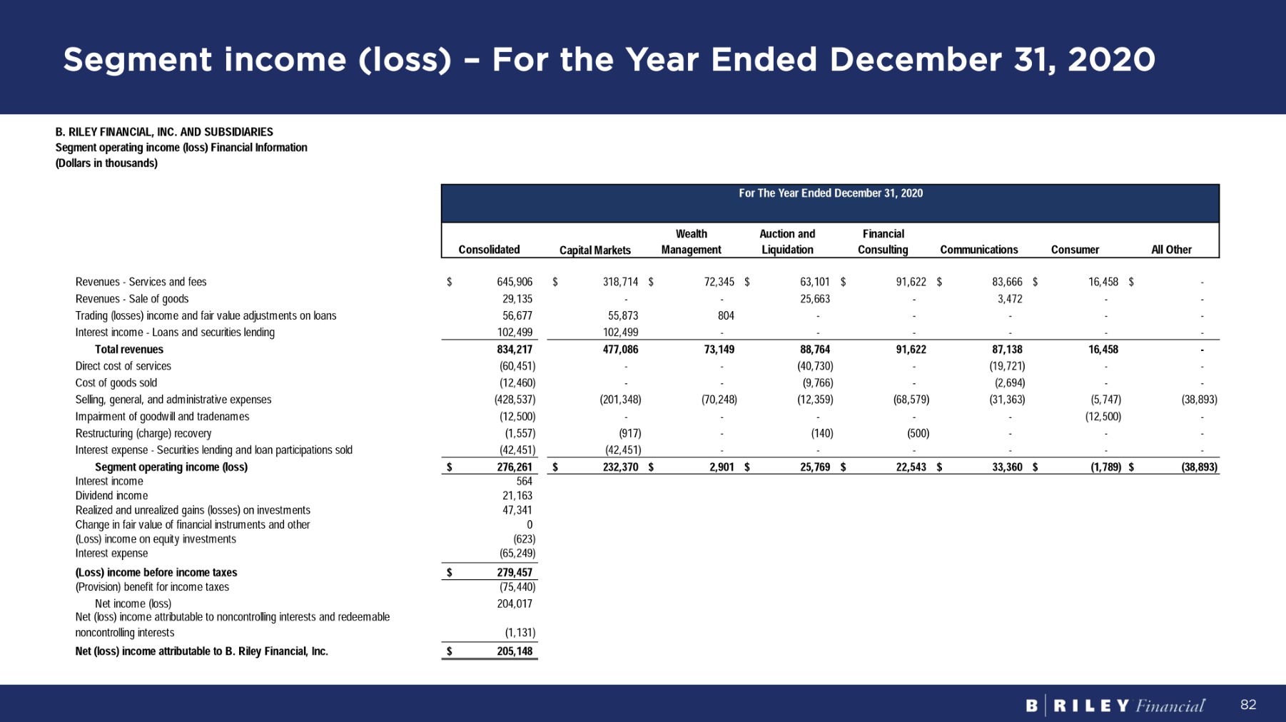 Segment income (loss) – For the Year Ended December 31, 2020 82 Fo r Th e Y ea r E nd e d D ece m b e r 31 , 2020 A l l O t h e r Consumer Communications Financial C on s u l t i ng A u c t i o n a nd Liquidation Wealth M a n a g e m e n t C a p i t a l M a r ke t s Consolidated B. RILEY FINANCIAL, INC. AND SUBSIDIARIES Segment operating income (loss) Financial Information ( D o ll a r s i n t hou sa nd s ) $ - $ 16,458 $ 83,666 $ 91,622 $ 63,101 $ 72,345 $ 318,714 $ 645,906 R e v enue s - S e r v i ce s an d f ees - - 3,472 - 25,663 - - 29,135 R e v enue s - S a l e o f goods - - - - - 804 55,873 56,677 Trading (losses) income and fair value adjustments on loans - - - - - - 102,499 102,499 I n t e r es t i nco m e - Loan s an d secu r i t i e s l end i ng - 16,458 87,138 91,622 88,764 73,149 477,086 834,217 To t a l r eve nu es - - (19,721) - (40,730) - - (60,451) D i r ec t cos t o f se r v i ce s - - (2,694) - (9,766) - - (12,460) C os t o f good s so l d (38,893) (5,747) (31,363) (68,579) (12,359) (70,248) (201,348) (428,537) Selling, general, and administrative expenses - (12,500) - - - - - (12,500) I m pa i r m en t o f good w il l an d t r adena m es - - - (500) (140) - (917) (1,557) R es t r uc t u r i n g ( cha r ge ) r eco v e r y - - - - - - (42,451) ( 42 , 45 1) Interest expense - Securities lending and loan participations sold (38,893) $ (1,789) $ 33,360 $ 22,543 $ 25,769 $ 2,901 $ 232,370 $ $ 276,261 S e g m e n t op e r a t i n g i n c o m e ( l o ss ) 564 I n t e r es t i nco m e 21,163 D i v i den d i nco m e 47,341 Realized and unrealized gains (losses) on investments 0 C hang e i n f a i r v a l u e o f f i nanc i a l i ns t r u m en t s an d o t her (623) ( Loss ) i nco m e o n equ i t y i n v es t m en t s (65,249) I n t e r es t expens e $ 279,457 ( Lo ss ) i n c o m e b e f o r e i n c o m e t axes (75,440) ( P r o v i s i on ) bene f i t f o r i nco m e t axes 204,017 N e t i nco m e ( l oss ) Net (loss) income attributable to noncontrolling interests and redeemable (1,131) noncon t r o lli n g i n t e r es t s $ 205,148 Net (loss) income attributable to B. Riley Financial, Inc.