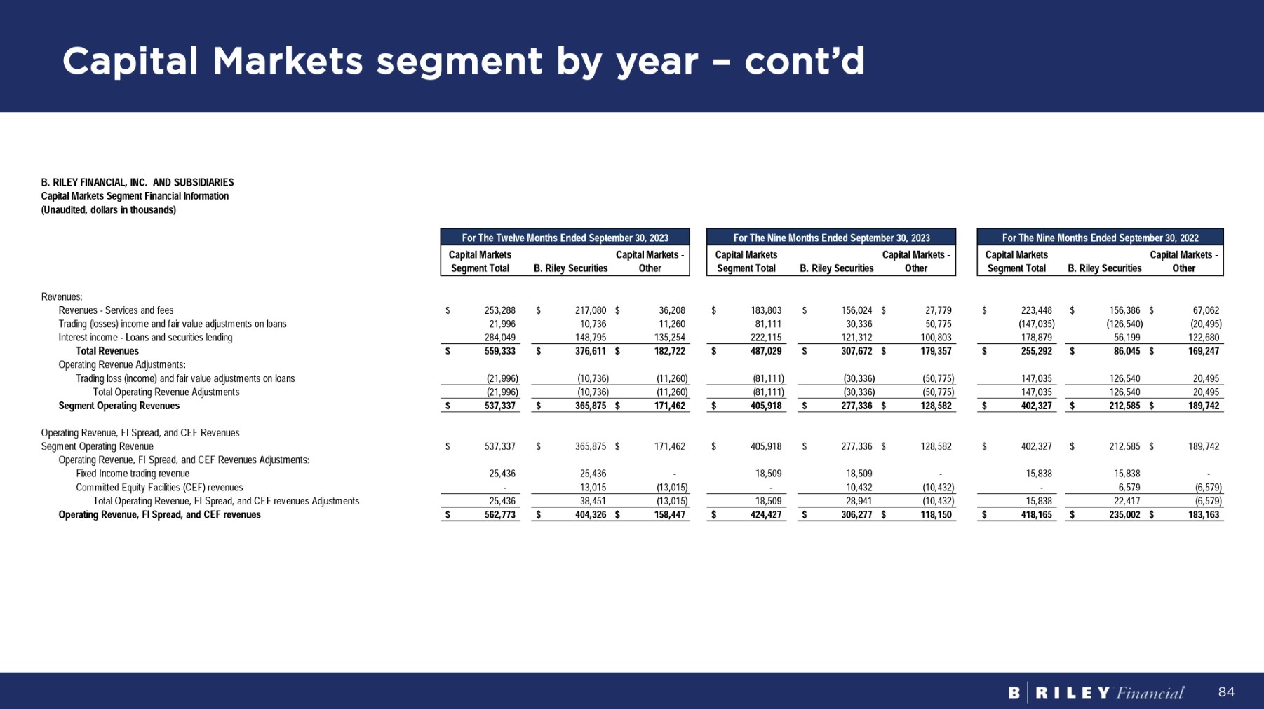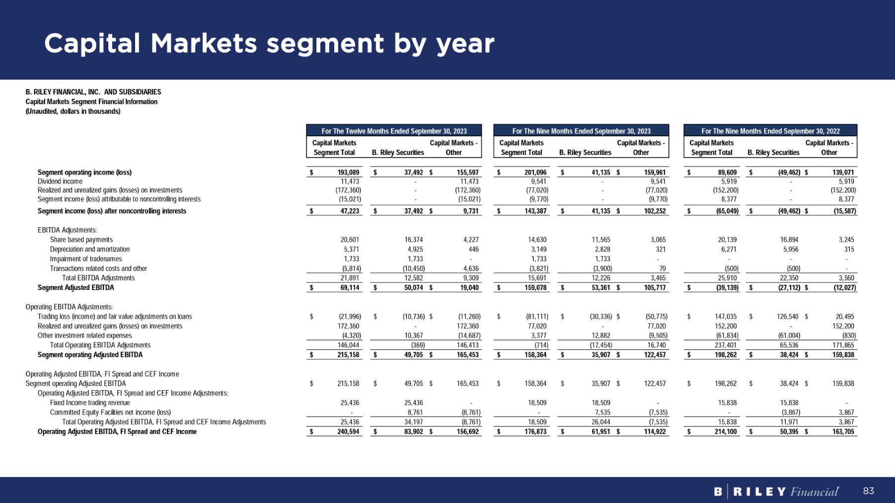 Capital Markets segment by year 83 B . R I L EY F I N A NC I A L , I NC . A N D SUBS I D I A R I ES Capital Markets Segment Financial Information ( U na ud i t e d , do ll a r s i n t hous a nds ) C ap i t a l M a r ke t s C ap i t a l M a r ke t s - Segment Total B. Riley Securities Other C ap i t a l M a r ke t s C ap i t a l M a r ke t s - Segment Total B. Riley Securities Other C ap i t a l M a r ke t s C ap i t a l M a r ke t s - Segment Total B. Riley Securities Other $ (49,462) $ 139,071 $ 89,609 $ 41,135 $ 159,961 $ 201,096 $ 37,492 $ 155,597 $ 193,089 S eg m en t ope r a t i n g i nco m e ( l oss ) - 5,919 5,919 - 9,541 9,541 - 11,473 11,473 D i v i den d i n c o m e - (152,200) (152,200) - (77,020) (77,020) - (172,360) (172,360) Realized and unrealized gains (losses) on investments - 8,377 8,377 - (9,770) (9,770) - (15,021) (15,021) Segment income (loss) attributable to noncontrolling interests $ (49,462) $ (15,587) $ ( 65 , 04 9) $ 41,135 $ 102,252 $ 143,387 $ 37,492 $ 9,731 $ 47,223 Segment income (loss) after noncontrolling interests EB I T D A A d j u s t m en t s : 3,245 16,894 20,139 3,065 11,565 14,630 4,227 16,374 20,601 S ha r e ba s e d pa y m en t s 315 5,956 6,271 321 2,828 3,149 446 4,925 5,371 D ep r e c i a t i o n an d a m o r t i z a t i on - - - - 1,733 1,733 - 1,733 1,733 I m pa i r m en t o f t r adena m es (500) - (500) (3,900) 79 (3,821) (10,450) 4,636 (5,814) T r an s a c t i on s r e l a t e d c o s t s an d o t her 22,350 3,560 25,910 12,226 3,465 15,691 12,582 9,309 21,891 To t a l EB I T D A A d j u s t m en t s $ (27,112) $ (12,027) $ ( 39 , 13 9) $ 53,361 $ 105,717 $ 159,078 $ 50,074 $ 19,040 $ 69,114 S eg m en t A d j us t e d E B I T D A $ 126,540 $ 20,495 $ 147,035 $ (30,336) $ (50,775) $ (81,111) $ (10,736) $ (11,260) $ (21,996) O pe r a t i n g EB I T D A A d j u s t m en t s : T r ad i n g l o s s ( i n c o m e ) an d f a i r v a l u e ad j u s t m en t s o n l oans - 152,200 152,200 - 77,020 77,020 - 172,360 172,360 Realized and unrealized gains (losses) on investments (61,004) (830) ( 61 , 83 4) 12,882 (9,505) 3,377 10,367 (14,687) (4,320) O t he r i n v e s t m en t r e l a t e d e x pen s es 65,536 171,865 237,401 (17,454) 16,740 (714) (369) 146,413 146,044 To t a l O pe r a t i n g EB I T D A A d j u s t m en t s $ 38,424 $ 159,838 $ 198,262 $ 35,907 $ 122,457 $ 158,364 $ 49,705 $ 165,453 $ 215,158 S eg m en t ope r a t i n g A d j us t e d E B I T D A 159,838 38,424 $ $ 198,262 $ 122,457 35,907 $ $ 158,364 $ 165,453 49,705 $ $ 215,158 $ O pe r a t i n g A d j u s t e d EB I T D A, F I S p r ea d an d C EF I n c o m e S eg m en t ope r a t i n g A d j u s t e d EB I T D A - 15,838 15,838 - 18,509 18,509 - 25,436 25,436 Operating Adjusted EBITDA, FI Spread and CEF Income Adjustments: F i x e d I n c o m e t r ad i n g r e v enue (3,867) 3,867 - 7,535 (7,535) - 8,761 (8,761) - C o mm i tt e d E qu i t y Fa c ili t i e s ne t i n c o m e ( l o ss ) 11,971 3,867 15,838 26,044 (7,535) 18,509 34,197 (8,761) 25,436 Total Operating Adjusted EBITDA, FI Spread and CEF Income Adjustments $ 50,395 $ 163,705 $ 214,100 $ 61,951 $ 114,922 $ 176,873 $ 83,902 $ 156,692 $ 240,594 O pe r a t i n g A d j us t e d E B I T D A , F I S p r ea d an d C EF I nco m e Fo r Th e T w e l v e M on t h s E nded S ep t e m b e r 30 , 2023 Fo r Th e N i n e M on t h s E nded S e p t e m be r 30 , 202 3 Fo r Th e N i n e M on t h s E nded S e p t e m be r 30 , 202 2