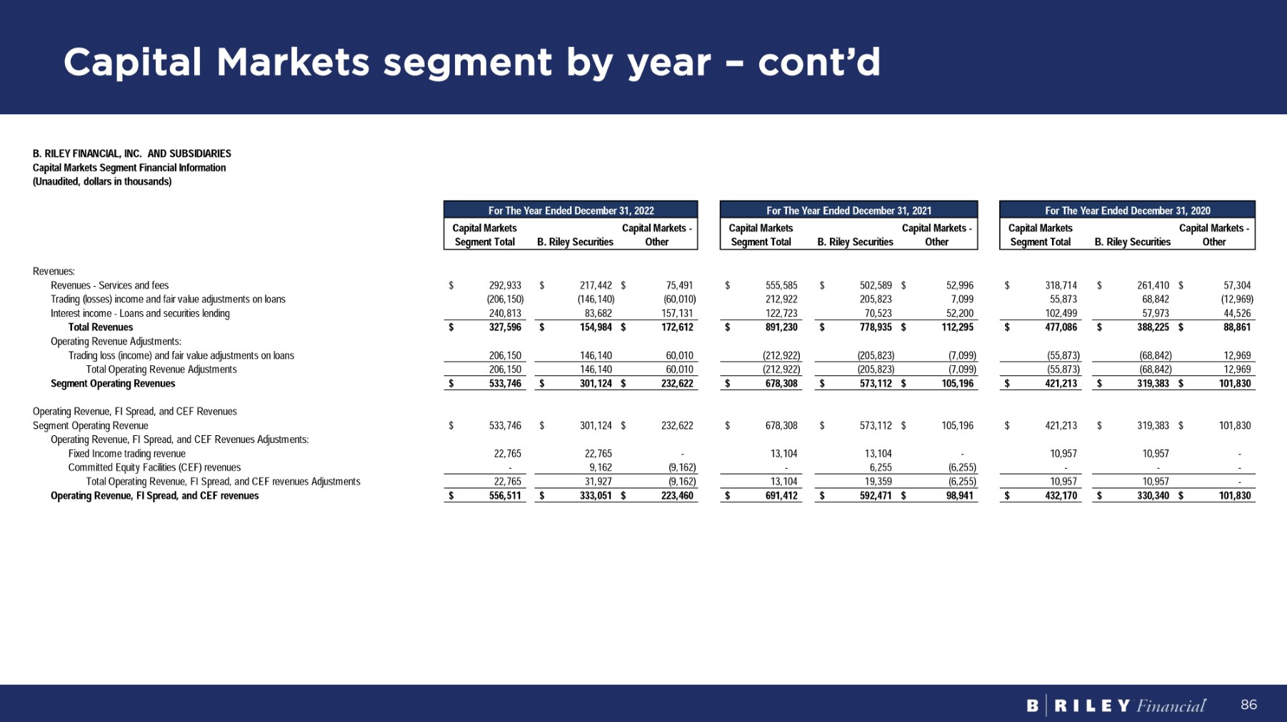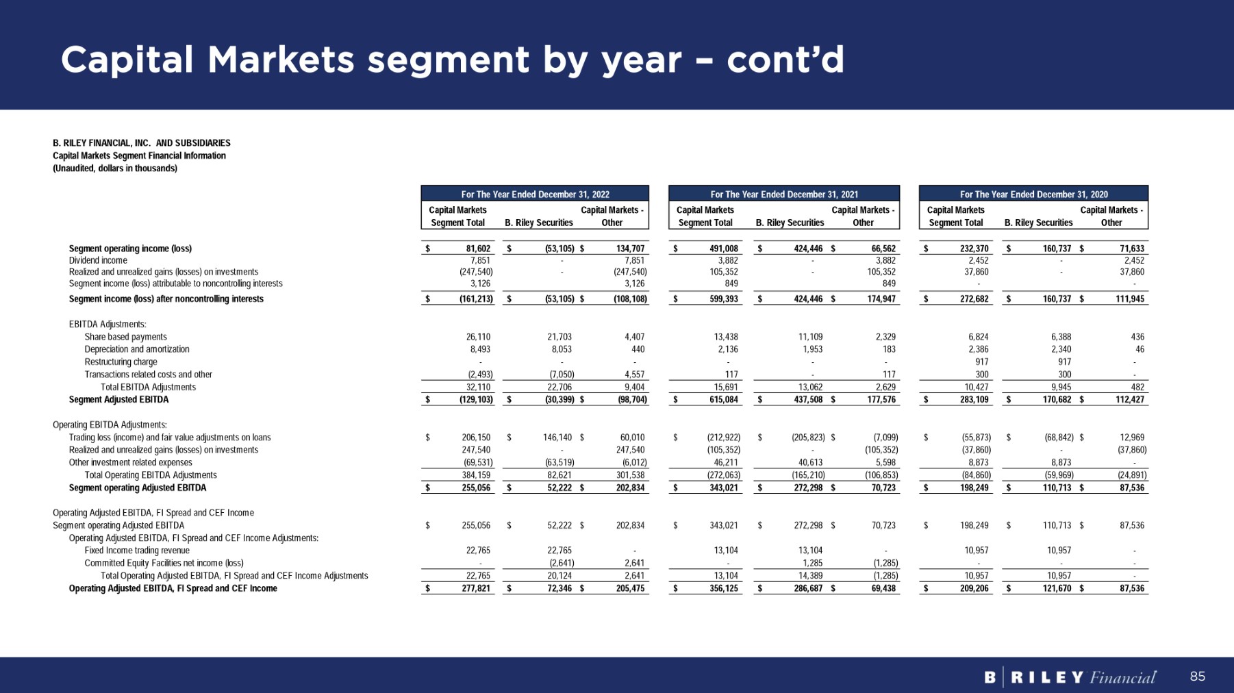 C ap it a l M a r k et s s eg m en t b y y ea r – c o n t ’d 85 B. RILEY FINANCIAL, INC. AND SUBSIDIARIES Capital Markets Segment Financial Information ( U na ud it e d , do ll a r s i n t hous a nds ) C ap it a l M a r ke t s C ap it a l M a r ke t s - Segment Total B. Riley Securities Other C ap it a l M a r ke t s C ap it a l M a r ke t s - Segment Total B. Riley Securities Other C ap it a l M a r ke t s C ap it a l M a r ke t s - Segment Total B. Riley Securities Other $ 160,737 $ 71,633 $ 232,370 $ 424,446 $ 66,562 $ 491,008 $ (53,105) $ 134,707 $ 81,602 S eg m en t ope r a t i n g i nco m e ( l oss ) - 2,452 2,452 - 3,882 3,882 - 7,851 7,851 D i v i den d i n c o m e - 37,860 37,860 - 105,352 105,352 - (247,540) (247,540) R ea li z e d an d un r ea li z e d ga i n s ( l o ss e s ) o n i n v e s t m en t s - - 849 849 3,126 3,126 Segment income (loss) attributable to noncontrolling interests $ 160,737 $ 111,945 $ 272,682 $ 424,446 $ 174,947 $ 599,393 $ (53,105) $ (108,108) $ (161,213) Segment income (loss) after noncontrolling interests EB I T D A A d j u s t m en t s : 436 6,388 6,824 2,329 11,109 13,438 4,407 21,703 26,110 S ha r e ba s e d pa y m en t s 46 2,340 2,386 183 1,953 2,136 440 8,053 8,493 D ep r e c i a t i o n an d a m o r t i z a t i on - 917 917 - - - - - - R e s t r u c t u r i n g c ha r ge 300 - 300 - 117 117 (7,050) 4,557 (2,493) T r an s a c t i on s r e l a t e d c o s t s an d o t her 9,945 482 10,427 13,062 2,629 15,691 22,706 9,404 32,110 To t a l EB I T D A A d j u s t m en t s $ 170,682 $ 112,427 $ 283,109 $ 437,508 $ 177,576 $ 615,084 $ (30,399) $ (98,704) $ (129,103) S eg m en t A d j us t e d E B I T D A $ (68,842) $ 12,969 $ (55,873) $ (205,823) $ (7,099) $ (212,922) $ 146,140 $ 60,010 $ 206,150 O pe r a t i n g EB I T D A A d j u s t m en t s : T r ad i n g l o s s ( i n c o m e ) an d f a i r v a l u e ad j u s t m en t s o n l oans - (37,860) (37,860) - (105,352) (105,352) - 247,540 247,540 R ea li z e d an d un r ea li z e d ga i n s ( l o ss e s ) o n i n v e s t m en t s 8,873 - 8,873 40,613 5,598 46,211 (63,519) (6,012) (69,531) O t he r i n v e s t m en t r e l a t e d e x pen s es (59,969) (24,891) (84,860) (165,210) (106,853) (272,063) 82,621 301,538 384,159 To t a l O pe r a t i n g EB I T D A A d j u s t m en t s $ 110,713 $ 87,536 $ 198,249 $ 272,298 $ 70,723 $ 343,021 $ 52,222 $ 202,834 $ 255,056 S eg m en t ope r a t i n g A d j us t e d E B I T D A 87,536 110,713 $ $ 198,249 $ 70,723 272,298 $ $ 343,021 $ 202,834 52,222 $ $ 255,056 $ Operating Adjusted EBITDA, FI Spread and CEF Income S eg m en t ope r a t i n g A d j u s t e d EB I T D A Operating Adjusted EBITDA, FI Spread and CEF Income Adjustments: - 10,957 10,957 - 13,104 13,104 - 22,765 22,765 F i x e d I n c o m e t r ad i n g r e v enue - - - 1,285 (1,285) - (2,641) 2,641 - Committed Equity Facilities net income (loss) 10,957 - 10,957 14,389 (1,285) 13,104 20,124 2,641 22,765 Total Operating Adjusted EBITDA, FI Spread and CEF Income Adjustments $ 121,670 $ 87,536 $ 209,206 $ 286,687 $ 69,438 $ 356,125 $ 72,346 $ 205,475 $ 277,821 O pe r a t i n g A d j us t e d E B I T D A , F I S p r ea d an d C EF I nco m e Fo r Th e Y ea r E nded D ece m b e r 31 , 2020 Fo r Th e Y ea r E nded D ece m b e r 31 , 2022 Fo r Th e Y ea r E nded D ece m b e r 31 , 2021