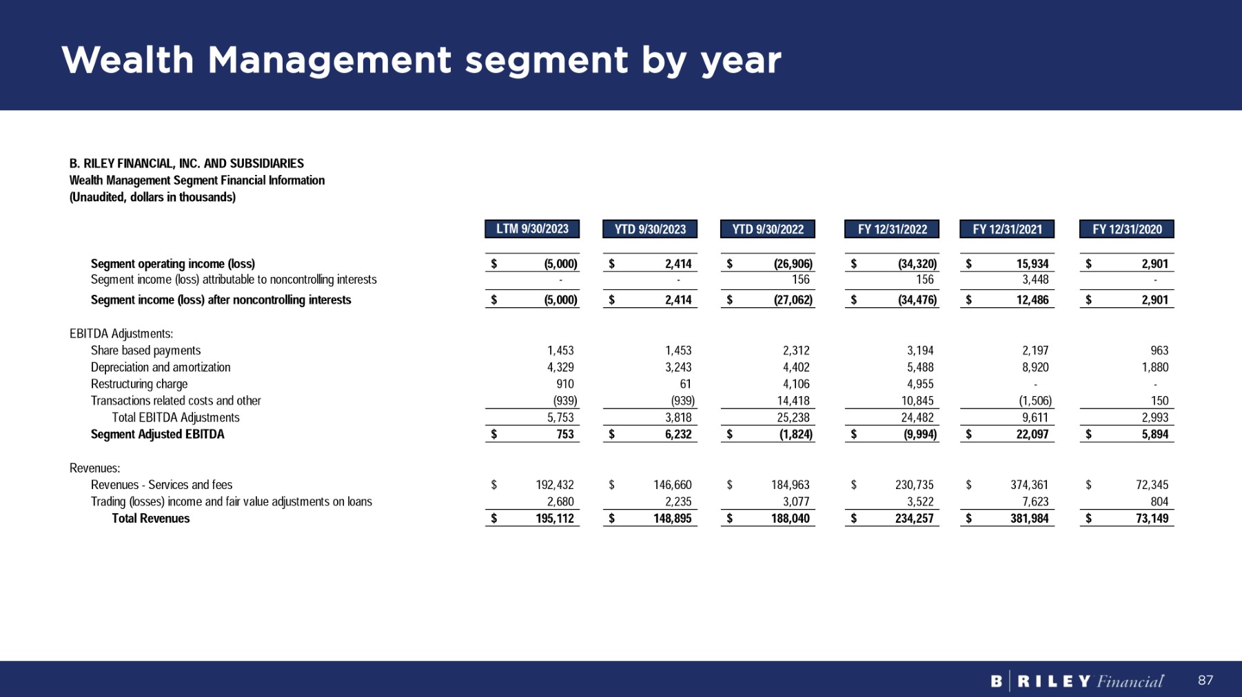 Wealth Management segment by year B. RILEY FINANCIAL, INC. AND SUBSIDIARIES Wealth Management Segment Financial Information ( U n a ud i t e d , do ll a r s i n t hou sa nd s ) F Y 12 / 31 / 2020 F Y 12 / 31 / 2021 F Y 12 / 31 / 2022 Y T D 9 / 30 / 2022 Y T D 9 / 30 / 2023 LT M 9 / 30 / 2023 $ 2,901 $ 15,934 $ ( 34 , 32 0) $ ( 26 , 90 6) $ 2,414 $ ( 5 , 00 0) S e g m e n t op e r a t i n g i n c o m e ( l o ss ) - 3,448 156 156 - - Segment income (loss) attributable to noncontrolling interests $ 2,901 $ 12,486 $ ( 34 , 47 6) $ ( 27 , 06 2) $ 2,414 $ ( 5 , 00 0) Segment income (loss) after noncontrolling interests EB I T D A A d j us t m en t s : 963 2,197 3,194 2,312 1,453 1,453 S ha r e base d pa y m en t s 1,880 8,920 5,488 4,402 3,243 4,329 D ep r ec i a t i o n an d a m o r t i za t i on - - 4,955 4,106 61 910 R es t r uc t u r i n g cha r ge 150 (1,506) 10,845 14,418 (939) ( 939 ) Transactions related costs and other 2,993 9,611 24,482 25,238 3,818 5,753 T o t a l EB I T D A A d j us t m en t s $ 5,894 $ 22,097 $ (9,994) $ (1,824) $ 6,232 $ 753 S e g m e n t A d j u s t e d E B I T D A Revenues: $ 72,345 $ 374,361 $ 230,735 $ 184,963 $ 146,660 $ 192,432 R e v enue s - S e r v i ce s an d f ees 804 7,623 3,522 3,077 2,235 2,680 Trading (losses) income and fair value adjustments on loans $ 73,149 $ 381,984 $ 234,257 $ 188,040 $ 148,895 $ 195,112 To t a l R eve nu es 87