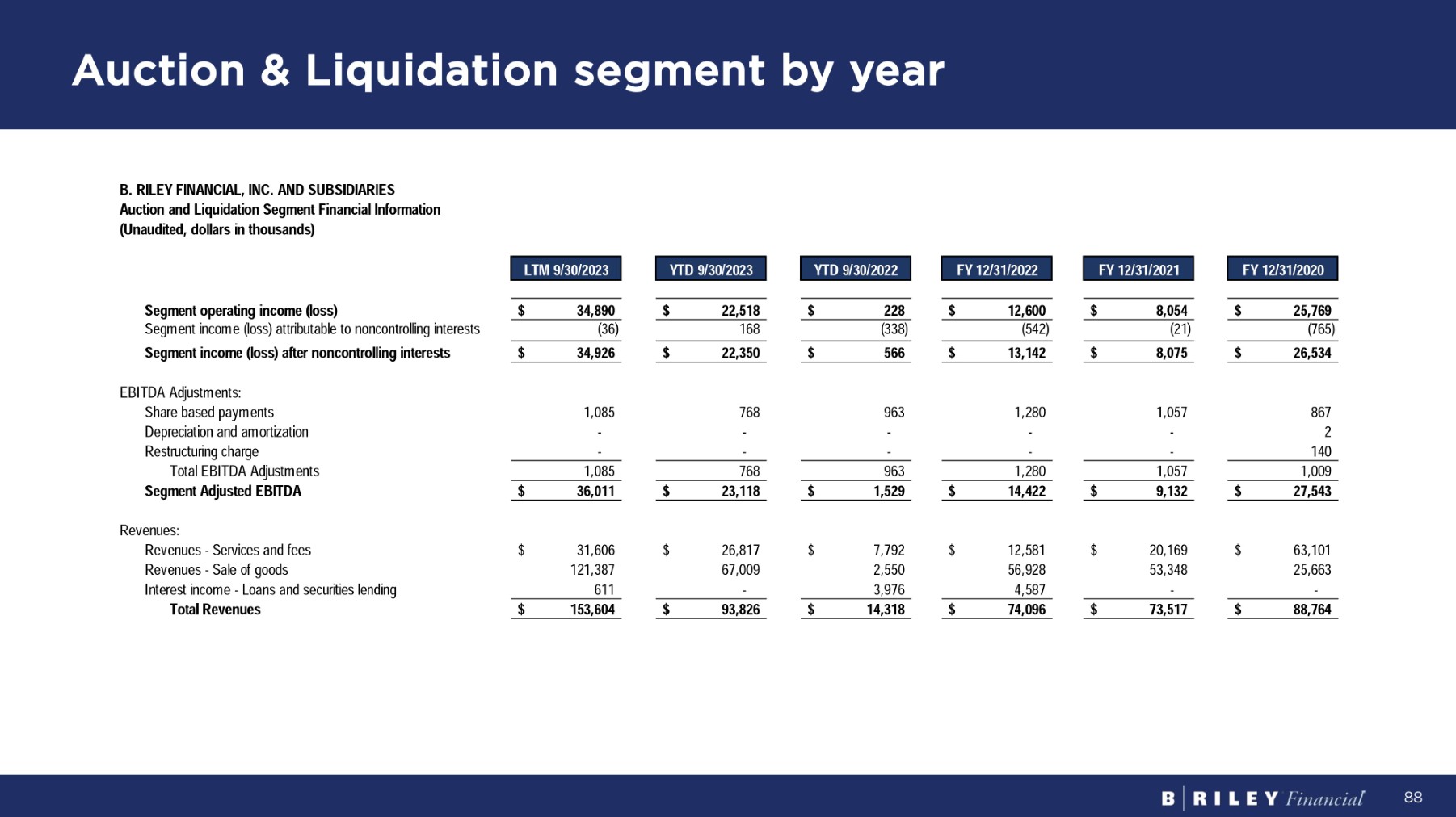 Auction & Liquidation segment by year B. RILEY FINANCIAL, INC. AND SUBSIDIARIES Auction and Liquidation Segment Financial Information (Unaudited, dollars in thousands) F Y 12 / 31 / 2020 F Y 12 / 31 / 2021 F Y 12 / 31 / 2022 Y T D 9 / 30 / 2022 Y T D 9 / 30 / 2023 LT M 9 / 30 / 2023 $ 25,769 $ 8,054 $ 12,600 $ 228 $ 22,518 $ 34,890 S e g m e n t op e r a t i n g i n c o m e ( l o ss ) (765) (21) (542) (338) 168 (36) Segment income (loss) attributable to noncontrolling interests $ 26,534 $ 8,075 $ 13,142 $ 566 $ 22,350 $ 34,926 S e g m e n t i n c o m e ( l o ss ) a ft e r non c on t r o lli n g i n t e r es t s EB I T D A A d j us t m en t s : 867 1,057 1,280 963 768 1,085 S ha r e base d pa y m en t s 2 - - - - - Depreciation and amortization 140 - - - - - R es t r uc t u r i n g cha r ge 1,009 1,057 1,280 963 768 1,085 T o t a l EB I T D A A d j us t m en t s $ 27,543 $ 9,132 $ 14,422 $ 1,529 $ 23,118 $ 36,011 S e g m e n t A d j u s t e d E B I T D A Revenues: $ 63,101 $ 20,169 $ 12,581 $ 7,792 $ 26,817 $ 31,606 R e v enue s - S e r v i ce s an d f ees 25,663 53,348 56,928 2,550 67,009 121,387 R e v enue s - S a l e o f goods - - 4,587 3,976 - 611 Interest income - Loans and securities lending $ 88,764 $ 73,517 $ 74,096 $ 14,318 $ 93,826 $ 153,604 To t a l R eve nu es 88
