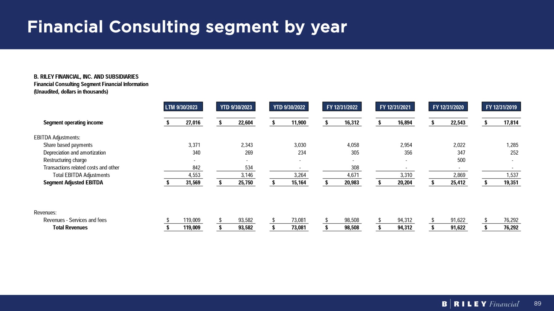 Financial Consulting segment by year B. RILEY FINANCIAL, INC. AND SUBSIDIARIES F i nanc i a l C on s u l t i n g S eg m en t F i nanc i a l I n f o r m a t i on ( U naud i t ed , do ll a r s i n t hou s and s ) LT M 9 / 30 / 2023 Y T D 9 / 30 / 2023 Y T D 9 / 30 / 2022 F Y 12 / 31 / 2022 F Y 12 / 31 / 2021 F Y 12 / 31 / 2020 F Y 12 / 31 / 2019 S eg m en t op e r a t i n g i nco m e $ 27,016 $ 22,604 $ 11,900 $ 16,312 $ 16,894 $ 22,543 $ 17,814 EB I T D A A d j us t m en t s : 1,285 2,022 2,954 4,058 3,030 2,343 3,371 S ha r e base d pa y m en t s 252 347 356 305 234 269 340 Depreciation and amortization - 500 - - - - - R es t r uc t u r i n g cha r ge - - - 308 - 534 842 Transactions related costs and other 1,537 2,869 3,310 4,671 3,264 3,146 4,553 T o t a l EB I T D A A d j us t m en t s $ 19,351 $ 25,412 $ 20,204 $ 20,983 $ 15,164 $ 25,750 $ 31,569 S e g m e n t A d j u s t e d E B I T D A Revenues: $ 76,292 $ 91,622 $ 94,312 $ 98,508 $ 73,081 $ 93,582 $ 119,009 R e v enue s - S e r v i ce s an d f ees $ 76,292 $ 91,622 $ 94,312 $ 98,508 $ 73,081 $ 93,582 $ 119,009 To t a l R eve nu es 89