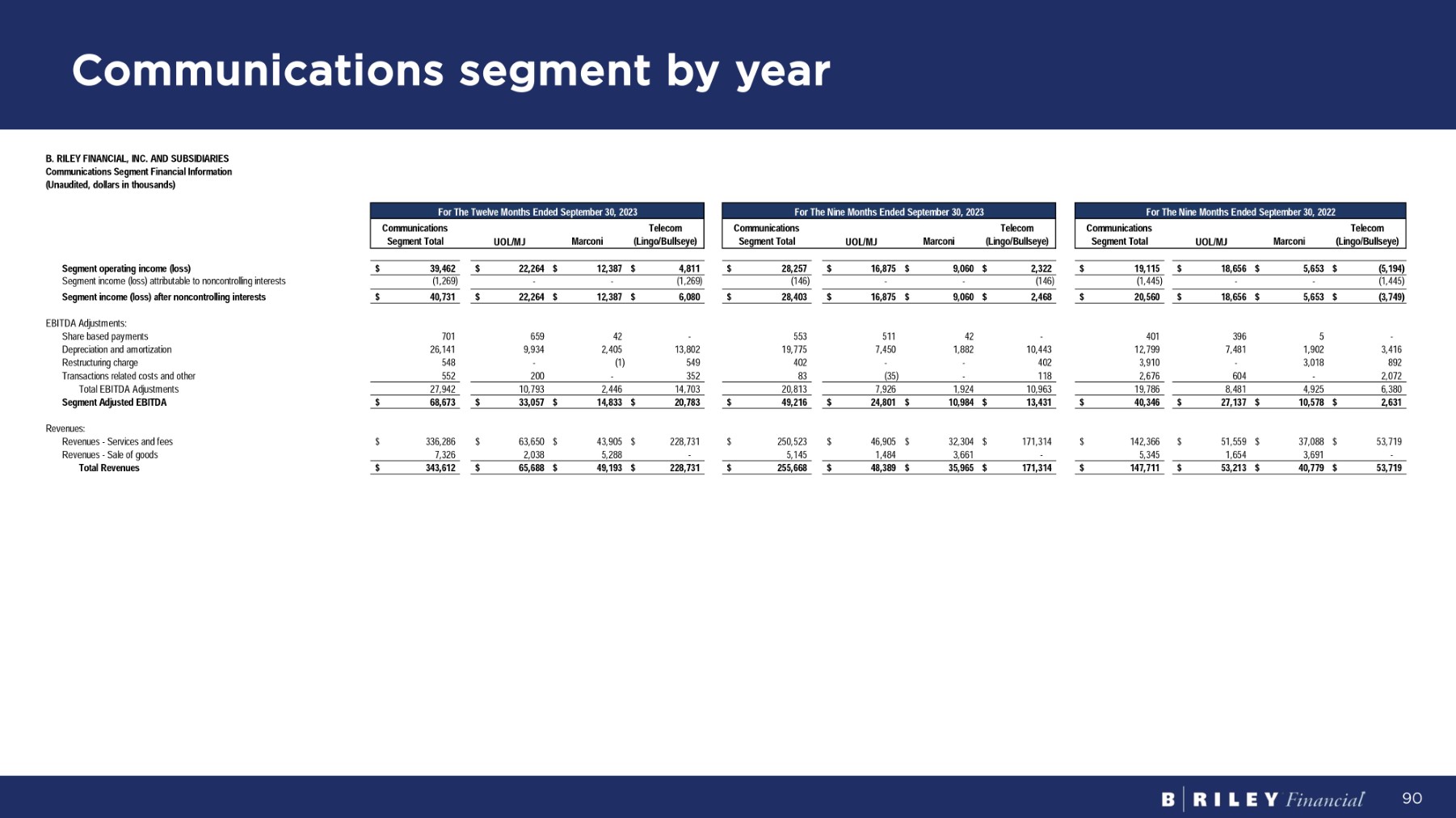 Communications segment by year 90 For The Twelve Months Ended September 30, 2023 Telecom ( L i ngo / B u ll se ye ) Marconi UOL/MJ C o mm un i ca ti o ns S eg m en t To t a l For The Nine Months Ended September 30, 2023 Telecom ( L i ngo / B u ll se ye ) Marconi UOL/MJ C o mm un i ca ti o ns S eg m en t To t a l For The Nine Months Ended September 30, 2022 Telecom ( L i ngo / B u ll se ye ) Marconi UOL/MJ C o mm un i ca ti o ns S eg m en t To t a l B . R I LEY F I N A NC I A L , I NC . A N D SUBS I D I A R IES Co mm un i ca t i on s Seg m e n t F i nanc i a l I n f o r m a t i on ( Unaud i t e d , do ll a rs i n t hous a nds ) $ 18 , 65 6 $ 5 , 65 3 $ ( 5 , 194) $ 19,115 $ 16,875 $ 9,060 $ 2,322 $ 28,257 $ 22,264 $ 12,387 $ 4,811 $ 39,462 S eg m en t ope r a ti n g i nco m e (l oss ) - - (1,445) (1,445) - - (146) (146) - - (1,269) (1,269) Segment income (loss) attributable to noncontrolling interests $ 18 , 65 6 $ 5 , 65 3 $ ( 3 , 749) $ 20,560 $ 16,875 $ 9,060 $ 2,468 $ 28,403 $ 22,264 $ 12,387 $ 6,080 $ 40,731 Segment income (loss) after noncontrolling interests EB I TDA A d j us t m en t s : - 5 396 401 - 42 511 553 - 42 659 701 S ha r e ba s e d pa y m en t s 3,416 1,902 7,481 12,799 10,443 1,882 7,450 19,775 13,802 2,405 9,934 26,141 Depreciation and amortization 892 3,018 - 3,910 402 - - 402 549 (1) - 548 R e s t r u c t u r i n g c ha r ge 604 - 2,072 2,676 (35) - 118 83 200 - 352 552 T r an s a c t i on s r e l a t e d c o s t s an d o t her 8,481 4,925 6,380 19,786 7,926 1,924 10,963 20,813 10,793 2,446 14,703 27,942 To t a l EB I T D A A d j u s t m en t s $ 27,137 $ 10,578 $ 2,631 $ 40,346 $ 24,801 $ 10,984 $ 13,431 $ 49,216 $ 33,057 $ 14,833 $ 20,783 $ 68,673 S eg m en t A d j us t e d E B I T D A 53,719 37,088 $ 51,559 $ $ 142,366 $ 171,314 32,304 $ $ 46,905 $ 250,523 $ 228,731 43,905 $ 63,650 $ $ 336,286 $ Revenues: R e v enue s - S e r v i c e s an d f ees 1,654 3,691 - 5,345 1,484 3,661 - 5,145 2,038 5,288 - 7,326 R e v enue s - S a l e o f goods $ 53,213 $ 40,779 $ 53,719 $ 147,711 $ 48,389 $ 35,965 $ 171,314 $ 255,668 $ 65,688 $ 49,193 $ 228,731 $ 343,612 To t a l R evenues