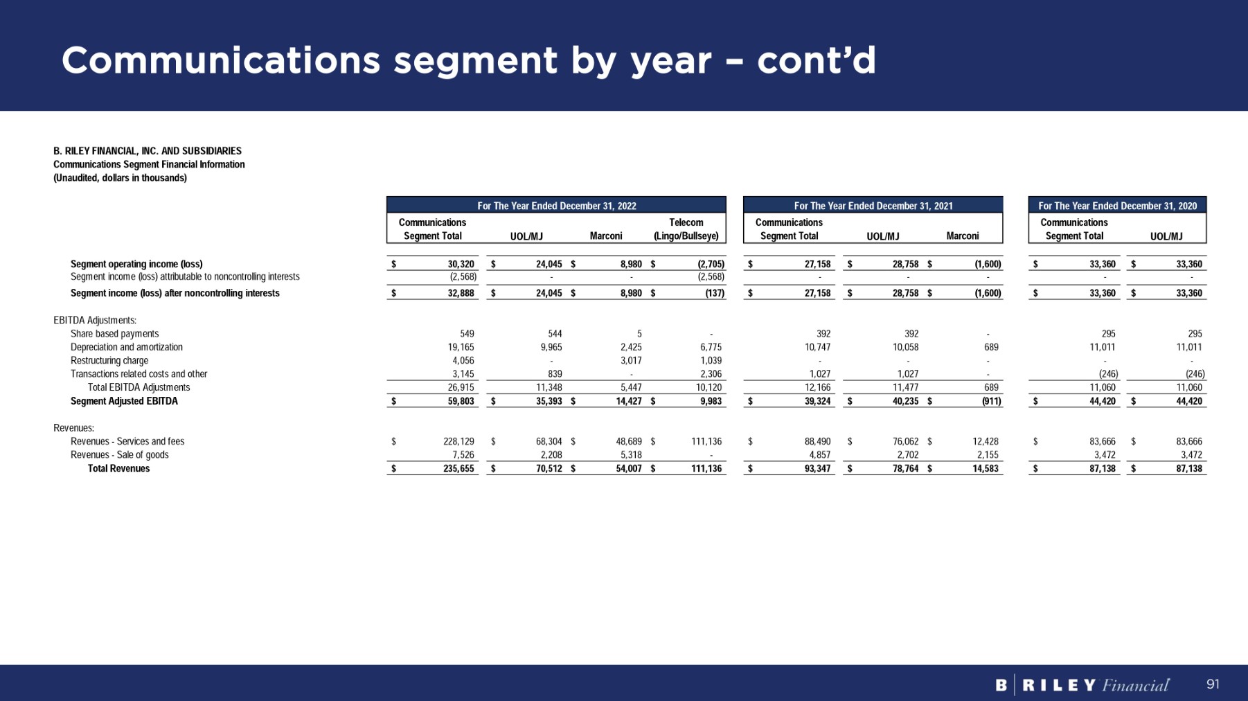 C o m m uni c a ti o n s se g me n t b y y e a r – c o n t ’d Fo r Th e Y ea r E nde d D ece m be r 31 , 2022 Telecom ( L i ngo / B u ll se ye ) Marconi UOL/MJ C o mm un i ca t i ons S eg m en t To t a l B . R I L EY F I N A NC I A L , I NC . A N D S UB S I D I A R IES Communications Segment Financial Information ( U naud it e d , do ll a r s i n t hous a nds ) Communications S eg m e n t To t a l U O L / M J M a r con i Communications Segment Total UOL/MJ $ 33,360 $ 33,360 $ 28,758 $ (1,600) $ 27,158 $ 24,045 $ 8,980 $ (2,705) $ 30,320 S eg m en t ope r a t i n g i nco m e ( l oss ) - - - - - - - (2,568) (2,568) Segment income (loss) attributable to noncontrolling interests $ 33,360 $ 33,360 $ 28,758 $ (1,600) $ 27,158 $ 24,045 $ 8,980 $ (137) $ 32,888 S eg m en t i nco m e ( l oss ) a ft e r noncon tr o lli n g i n t e r es t s EB I T D A A d j u s t m en t s : 295 295 - 392 392 - 5 544 549 S ha r e ba s e d pa y m en t s 11,011 11,011 689 10,058 10,747 6,775 2,425 9,965 19,165 D ep r e c i a t i o n an d a m o r t i z a t i on - - - - - 1,039 3,017 - 4,056 R e s t r u c t u r i n g c ha r ge (246) (246) 1,027 - 1,027 839 - 2,306 3,145 Transactions related costs and other 11,060 11,060 11,477 689 12,166 11,348 5,447 10,120 26,915 To t a l EB I T D A A d j u s t m en t s $ 44,420 $ 44,420 $ 40,235 $ (911) $ 39,324 $ 35,393 $ 14,427 $ 9,983 $ 59,803 S eg m en t A d j us t e d E B I T D A 83,666 83,666 $ $ 12,428 76,062 $ $ 88,490 $ 111,136 48,689 $ 68,304 $ $ 228,129 $ Revenues: R e v enue s - S e r v i c e s an d f ees 3,472 3,472 2,702 2,155 4,857 2,208 5,318 - 7,526 R e v enue s - S a l e o f goods $ 87,138 $ 87,138 $ 78,764 $ 14,583 $ 93,347 $ 70,512 $ 54,007 $ 111,136 $ 235,655 To t a l R evenues Fo r Th e Y ea r E nde d D ece m b e r 31 , 2020 Fo r Th e Y ea r E nde d D ece m b e r 31 , 2021 91