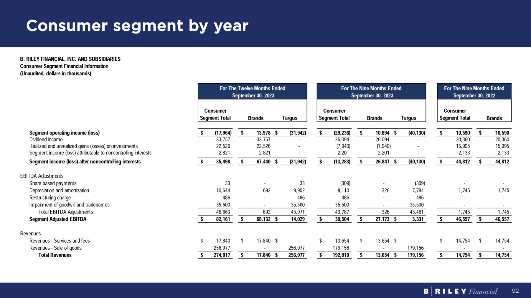Consumer segment by year B. RILEY FINANCIAL, INC. AND SUBSIDIARIES C on s u m e r S eg m en t F i n a n c i a l I n f o r m a t i on ( U n a ud i t ed , do ll a r s i n t hou s and s ) Consumer S eg m en t To t a l B r ands T a r gus Consumer S eg m en t To t a l B r ands T a r gus Consumer S eg m en t To t a l B r ands $ 10,590 $ 10,590 $ 10,894 $ (40,130) $ (29,236) $ 13,978 $ (31,942) $ (17,964) S e g m e n t op e r a t i n g i n c o m e ( l o ss ) 20,360 20,360 - 26,094 26,094 - 33,757 33,757 D i v i den d i nco m e 15,995 15,995 - (7,940) (7,940) - 22,526 22,526 Realized and unrealized gains (losses) on investments 2,133 2,133 - 2,201 2,201 - 2,821 2,821 Segment income (loss) attributable to noncontrolling interests $ 44,812 $ 44,812 $ 26,847 $ (40,130) $ (13,283) $ 67,440 $ (31,942) $ 35,498 Segment income (loss) after noncontrolling interests EB I T D A A d j us t m en t s : - - (309) - (309) 33 - 33 S ha r e base d pa y m en t s 1,745 1,745 7,784 326 8,110 9,952 692 10,644 Depreciation and amortization - - 486 - 486 486 - 486 R es t r uc t u r i n g cha r ge - - - 35,500 35,500 - 35,500 35,500 I m pa i r m en t o f good w il l an d t r adena m es 1,745 1,745 326 43,461 43,787 692 45,971 46,663 T o t a l EB I T D A A d j us t m en t s $ 46,557 $ 46,557 $ 27,173 $ 3,331 $ 30,504 $ 68,132 $ 14,029 $ 82,161 S e g m e n t A d j u s t e d E B I T D A Revenues: $ 14,754 $ 14,754 $ 13,654 $ - $ 13,654 $ 17,840 $ - $ 17,840 R e v enue s - S e r v i ce s an d f ees - - - 179,156 179,156 - 256,977 256,977 R e v enue s - S a l e o f goods $ 14,754 $ 14,754 $ 13,654 $ 179,156 $ 192,810 $ 17,840 $ 256,977 $ 274,817 To t a l R eve nu es Fo r Th e T w e l v e M on t h s E nd e d S e p t e m be r 30 , 2023 Fo r Th e N i n e M on t h s E nd e d S e p t e m be r 30 , 2023 Fo r Th e N i n e M on t h s E nd e d S e p t e m be r 30 , 2022 92