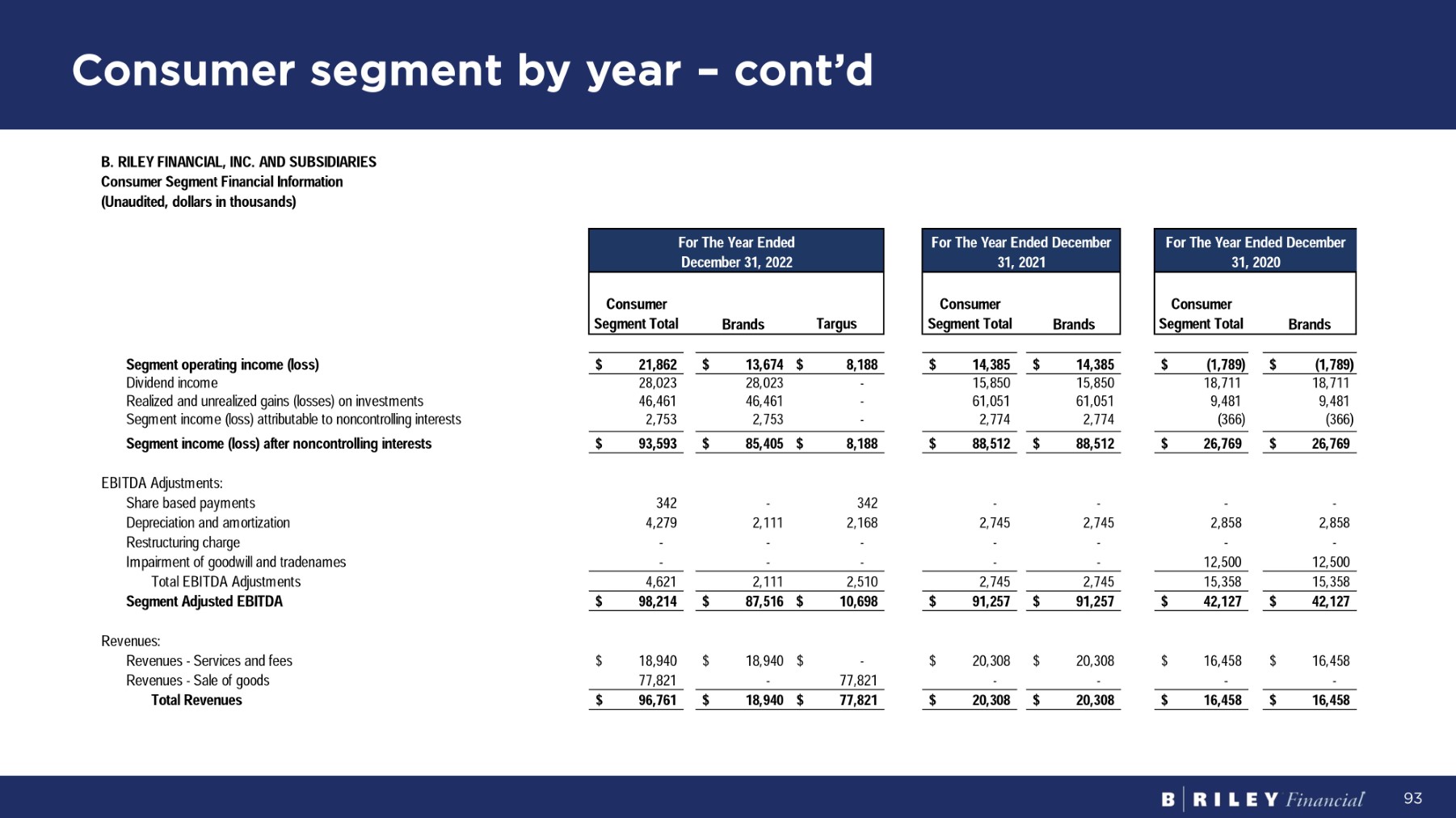 C o nsume r se g me n t b y y e a r – c o n t ’d B. RILEY FINANCIAL, INC. AND SUBSIDIARIES C onsu m e r S eg m en t F i nanc i a l I n f o r m a t i on ( U naud i t ed , do ll a r s i n t housands ) Consumer S eg m en t To t a l Brands Ta r gus Consumer S eg m en t To t a l Brands Consumer S eg m en t To t a l Brands $ (1,789) $ (1,789) $ 14,385 $ 14,385 $ 13,674 $ 8,188 $ 21,862 S e g m e n t op e r a t i n g i n c o m e ( l o ss ) 18,711 18,711 15,850 15,850 - 28,023 28,023 D i v i den d i nco m e 9,481 9,481 61,051 61,051 - 46,461 46,461 Realized and unrealized gains (losses) on investments (366) (366) 2,774 2,774 - 2,753 2,753 Segment income (loss) attributable to noncontrolling interests $ 26,769 $ 26,769 $ 88,512 $ 88,512 $ 85,405 $ 8,188 $ 93,593 S e g m e n t i n c o m e ( l o ss ) a ft e r non c on t r o lli n g i n t e r es t s EB I T D A A d j us t m en t s : - - - - 342 - 342 S ha r e base d pa y m en t s 2,858 2,858 2,745 2,745 2,168 2,111 4,279 Depreciation and amortization - - - - - - - R es t r uc t u r i n g cha r ge 12,500 12,500 - - - - - Impairment of goodwill and tradenames 15,358 15,358 2,745 2,745 2,111 2,510 4,621 T o t a l EB I T D A A d j us t m en t s $ 42,127 $ 42,127 $ 91,257 $ 91,257 $ 87,516 $ 10,698 $ 98,214 S e g m e n t A d j u s t e d E B I T D A Revenues: $ 16,458 $ 16,458 $ 20,308 $ 20,308 $ 18,940 $ - $ 18,940 R e v enue s - S e r v i ce s an d f ees - - - - - 77,821 77,821 R e v enue s - S a l e o f goods $ 16,458 $ 16,458 $ 20,308 $ 20,308 $ 18,940 $ 77,821 $ 96,761 To t a l R eve nu es Fo r Th e Y ea r E nde d D ece m be r 31 , 2022 Fo r Th e Y ea r E nde d D ece m b er 31 , 2020 Fo r Th e Y ea r E nde d D ece m b er 31 , 2021 93